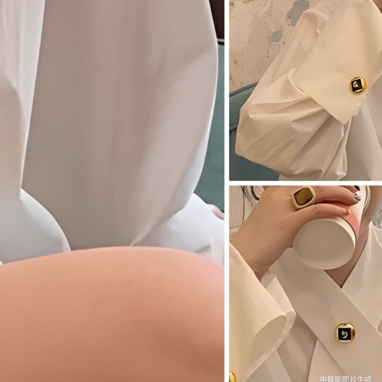 ドロップショルダーのゆるやかなフォルムに、ゴールドボタンが映える上品なデザイン。