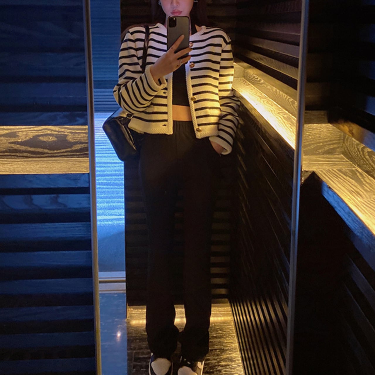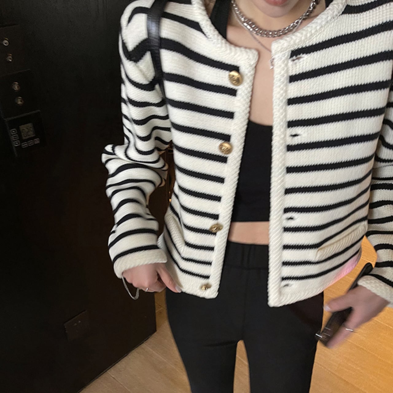 上品なホワイト×ブラックのボーダーが目を惹く、クラシカルなニットジャケット。