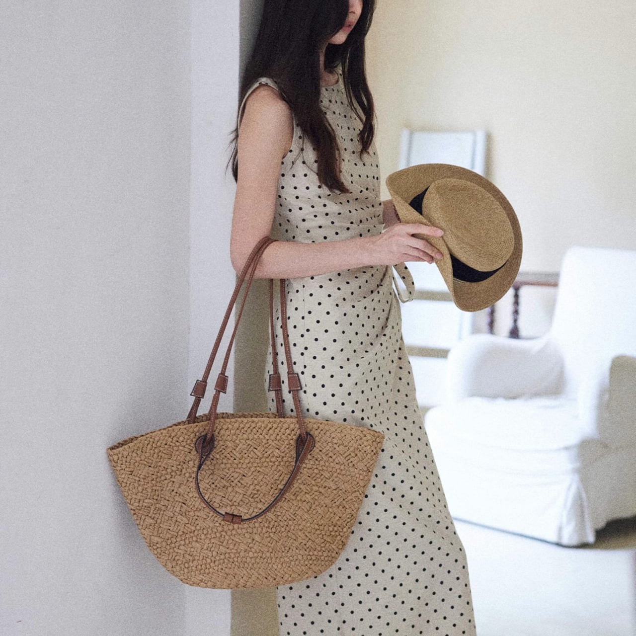 軽やかな生地感と清涼感のあるベージュカラーは、夏のお出かけやバカンスにぴったり。