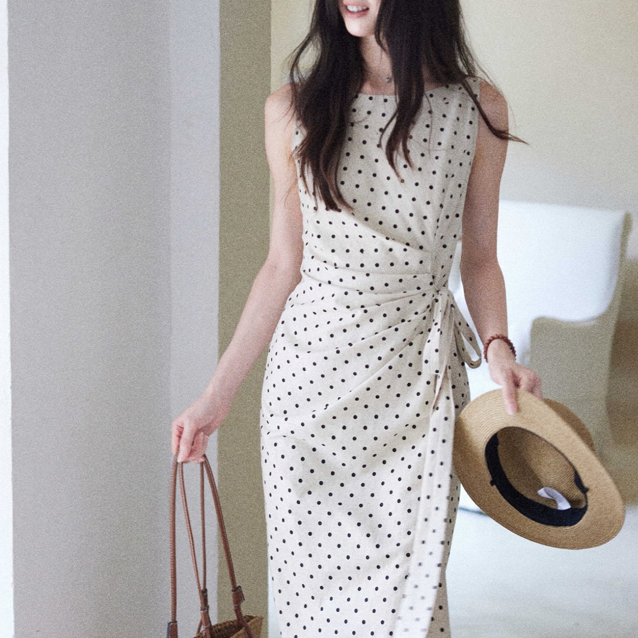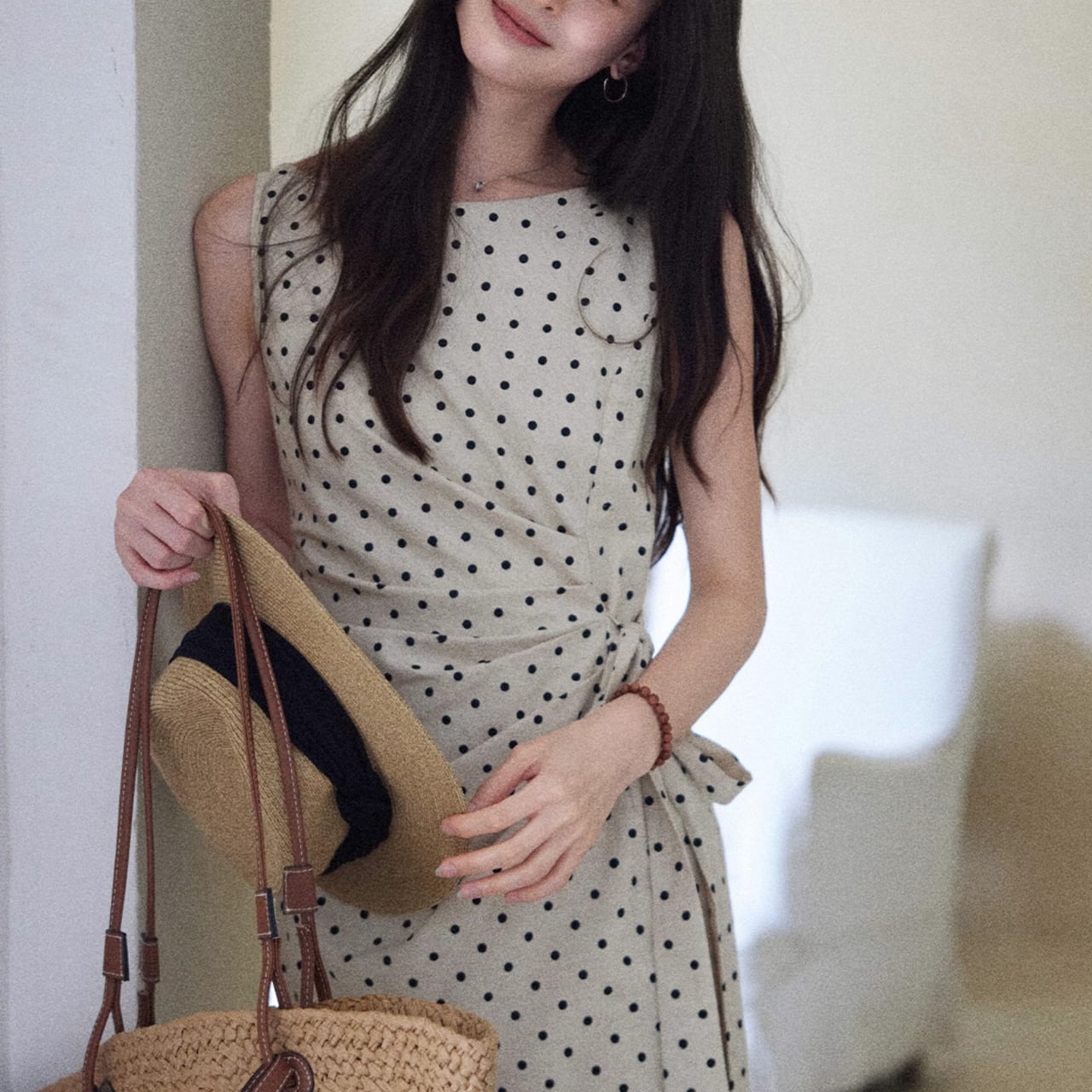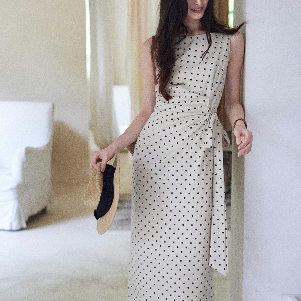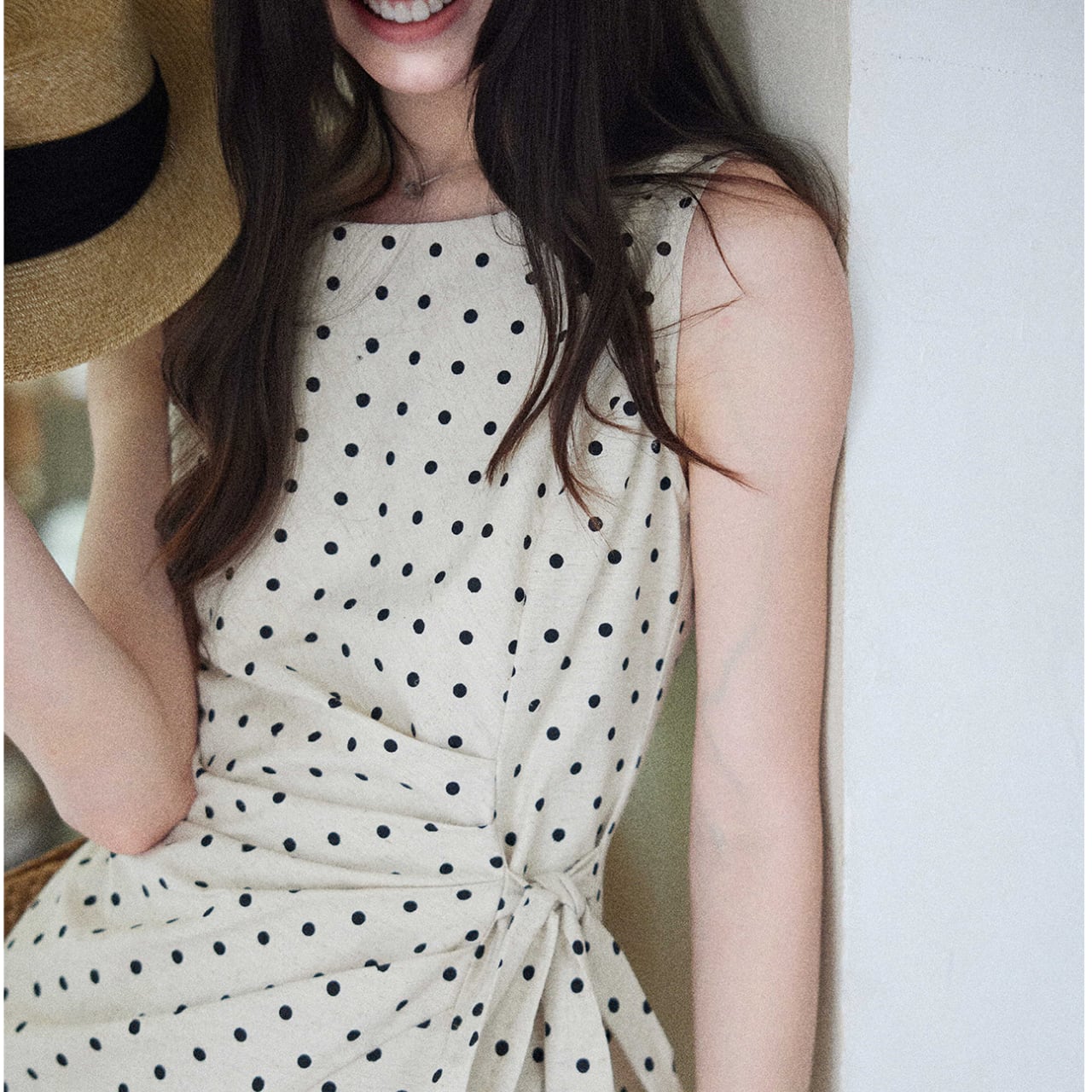 クラシカルなドット柄が目を惹く、上品なノースリーブワンピース。