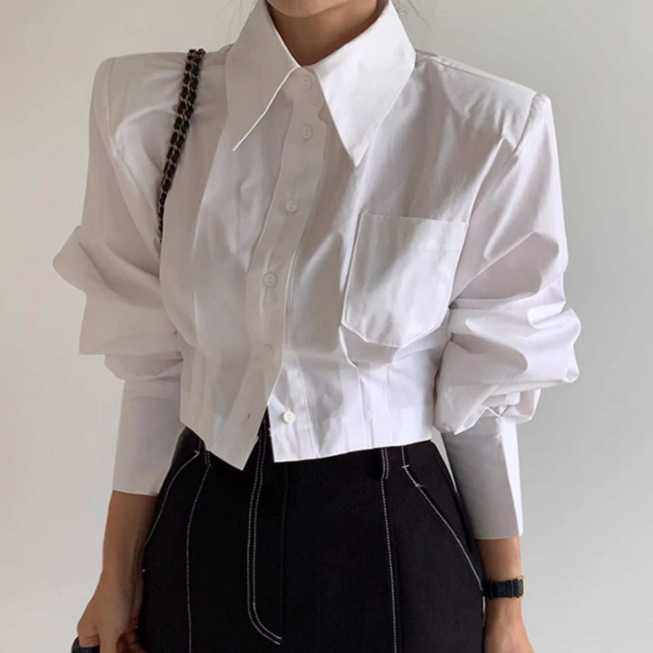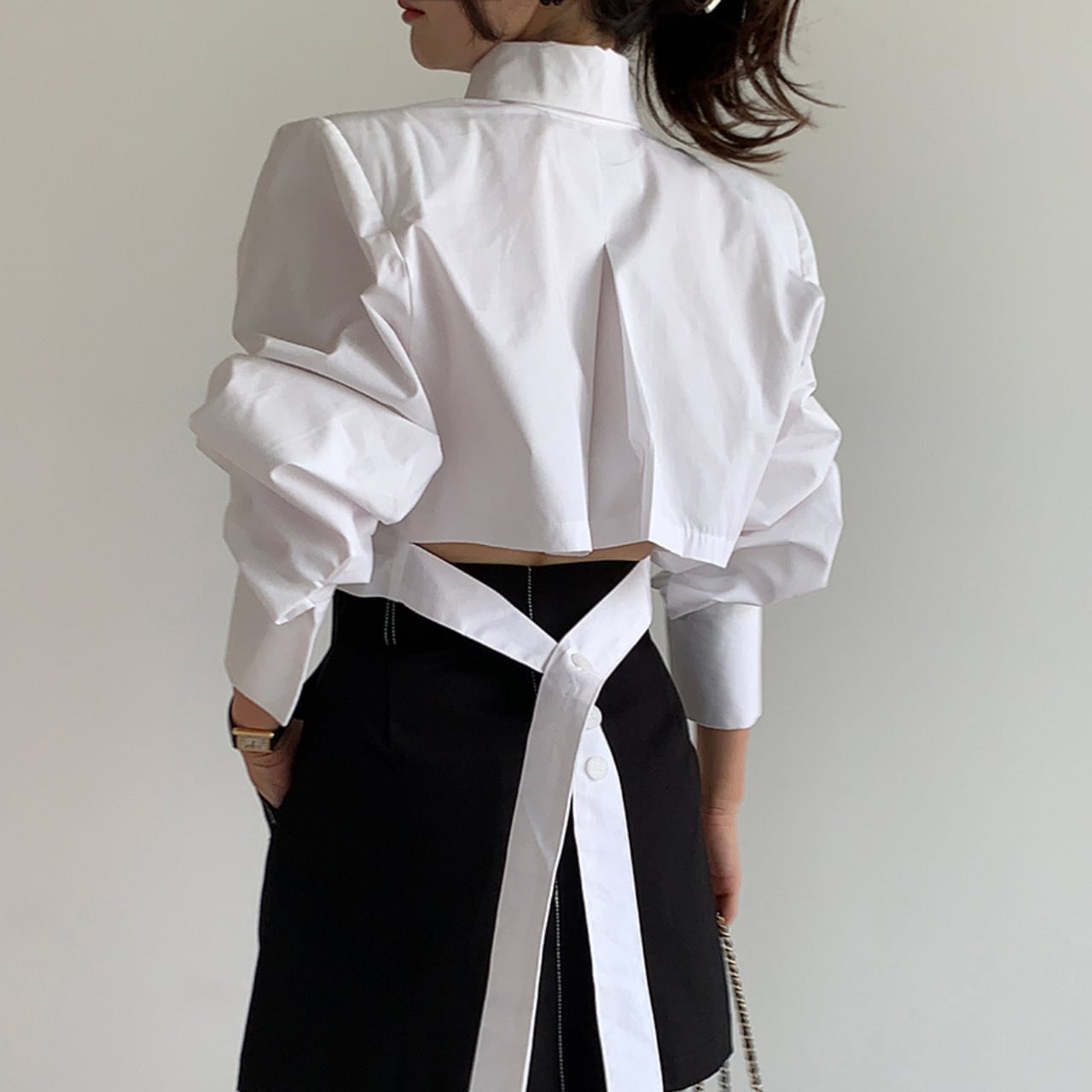 女性らしさを引き立てるバックリボンデザインが印象的なクロップド丈シャツ。シンプルなフロントに対して、背中のリボンがアクセントとなり、後ろ姿にも自信が持てる一着です。