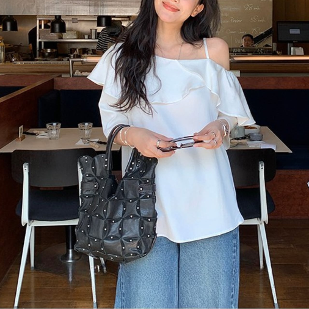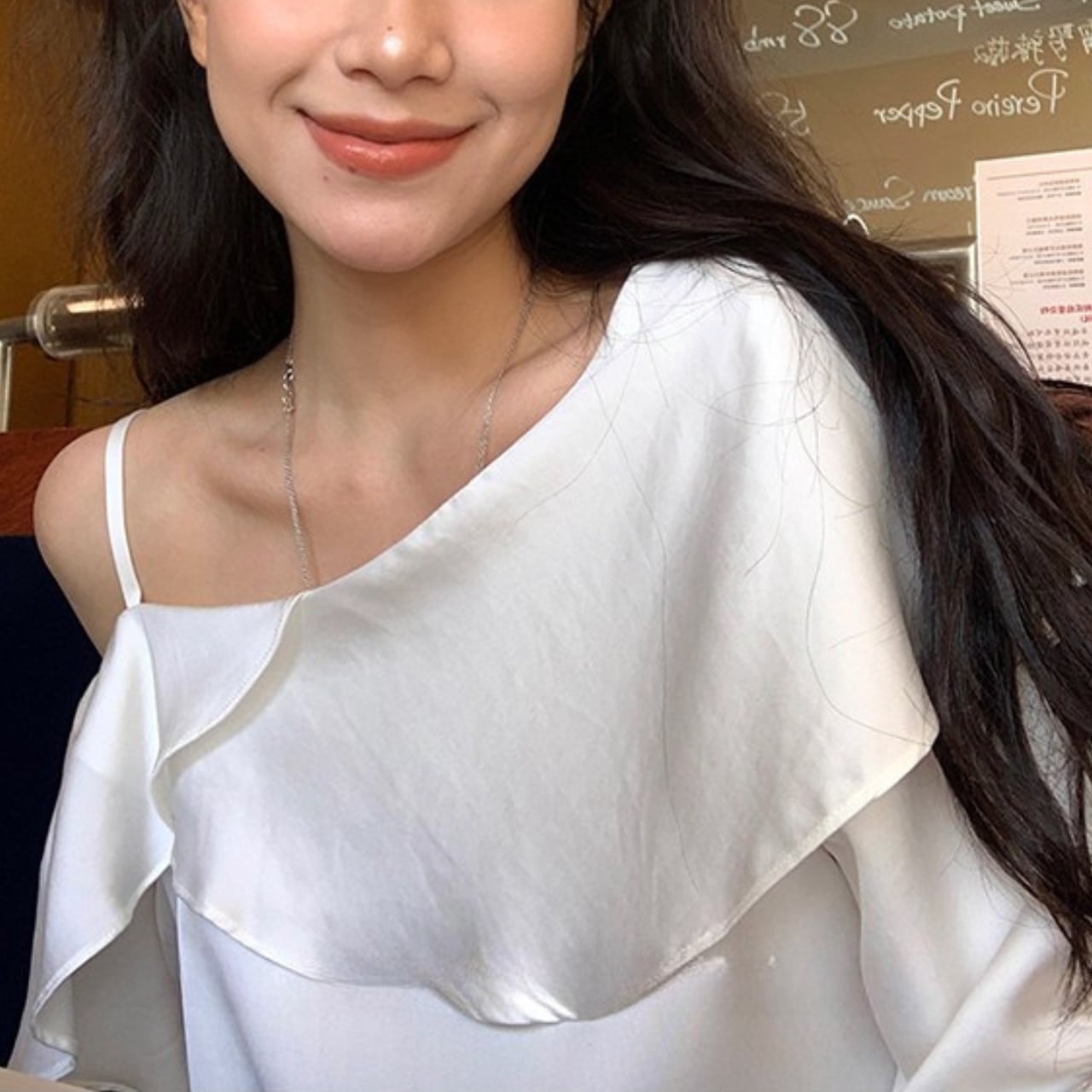 フェミニンでモードな雰囲気を兼ね備えたワンショルダートップス。