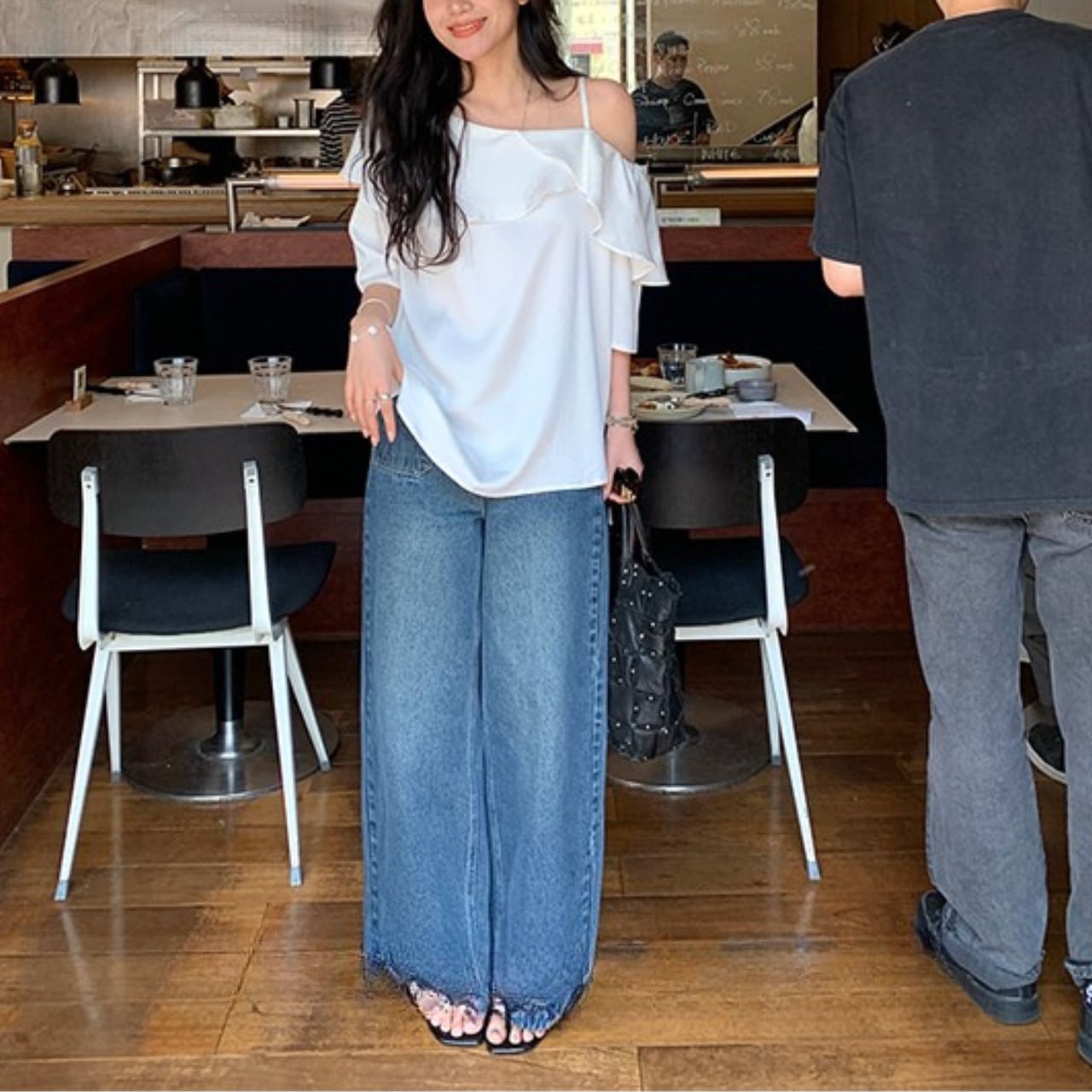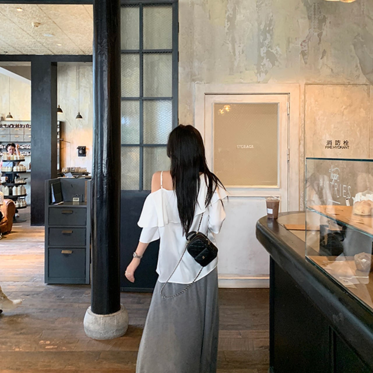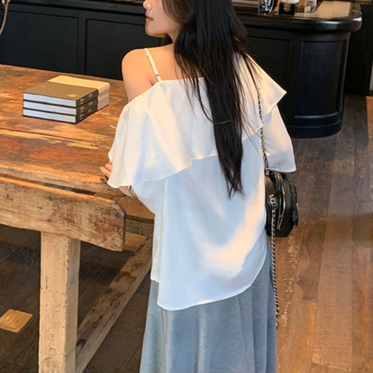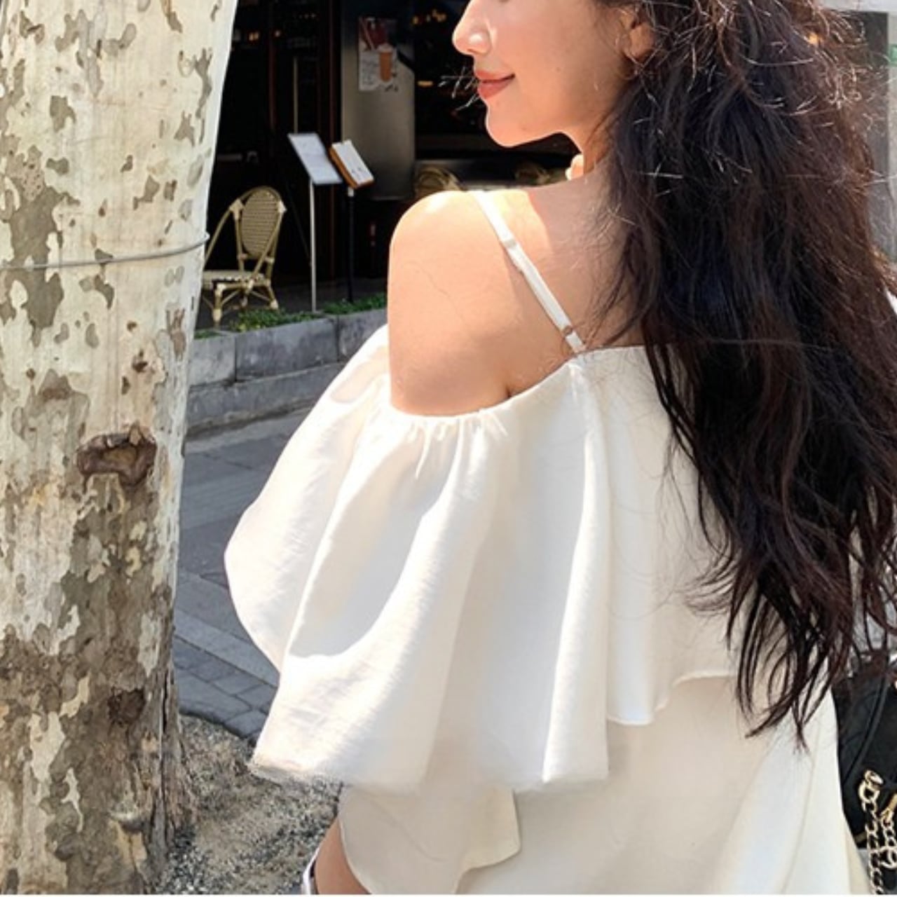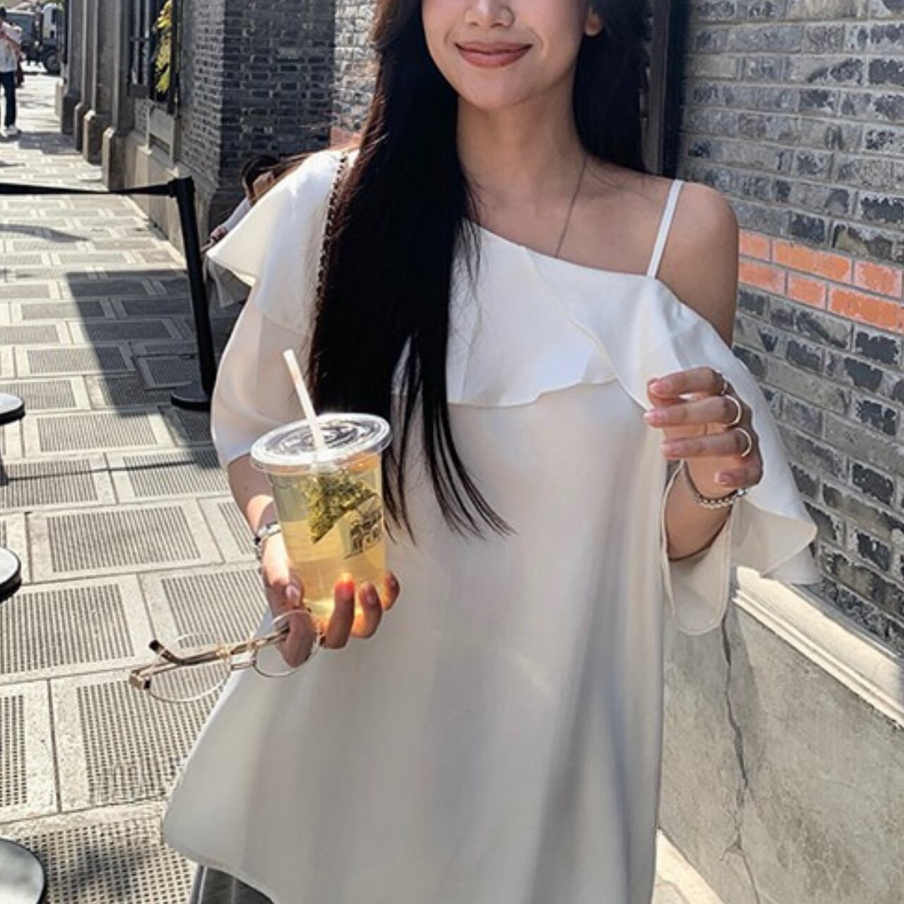 大胆なアシンメトリーデザインと華やかなフリルが、シンプルながらも印象的なスタイルに導きます。