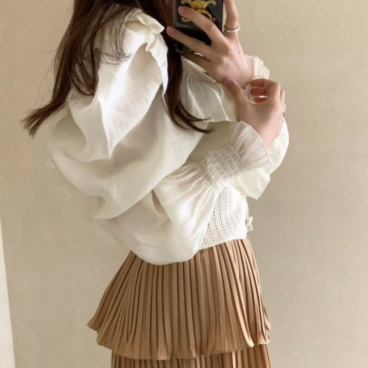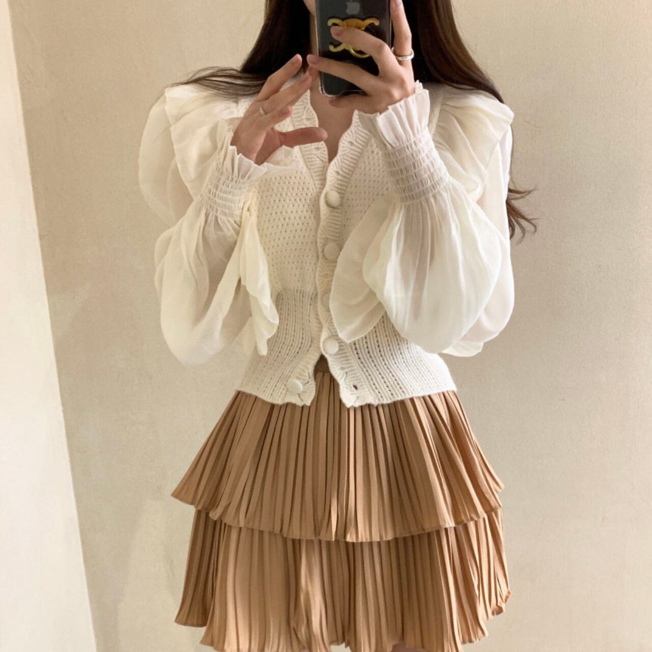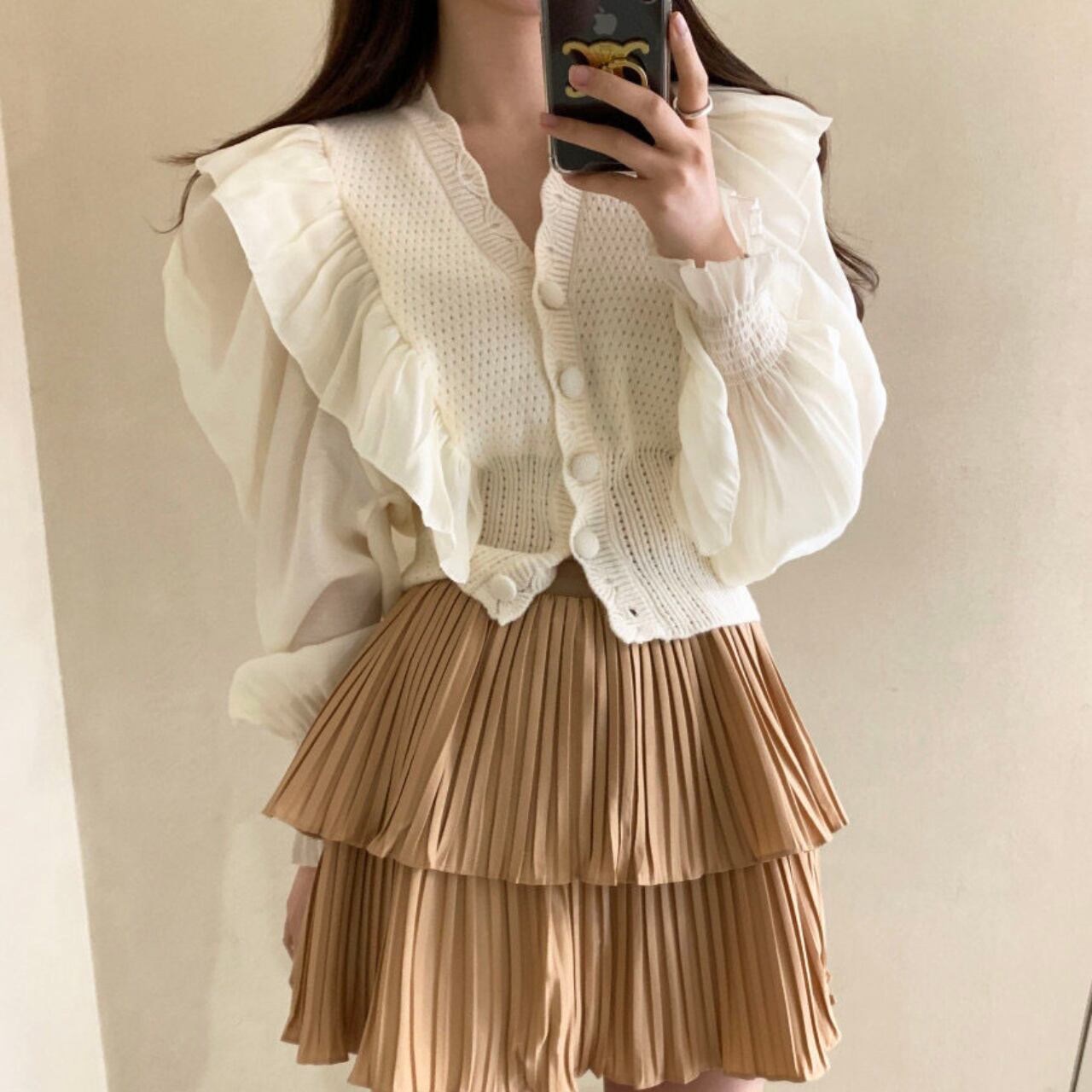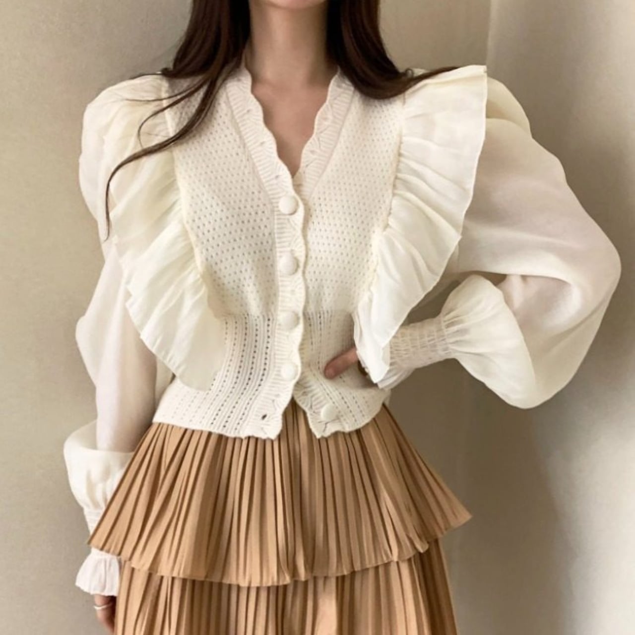 ふんわりとしたシフォン袖と立体感のあるフリルが、顔周りを華やかに見せます。
