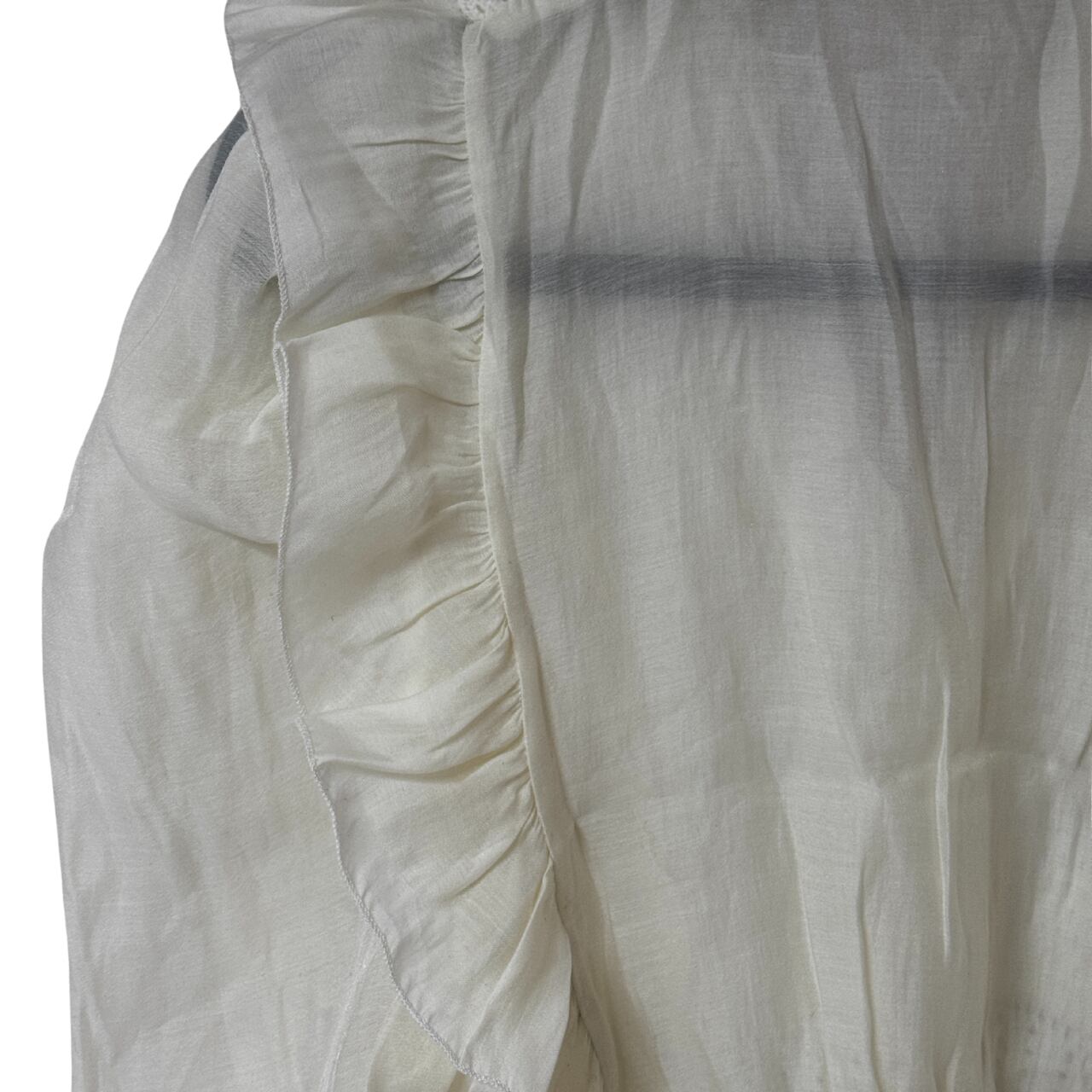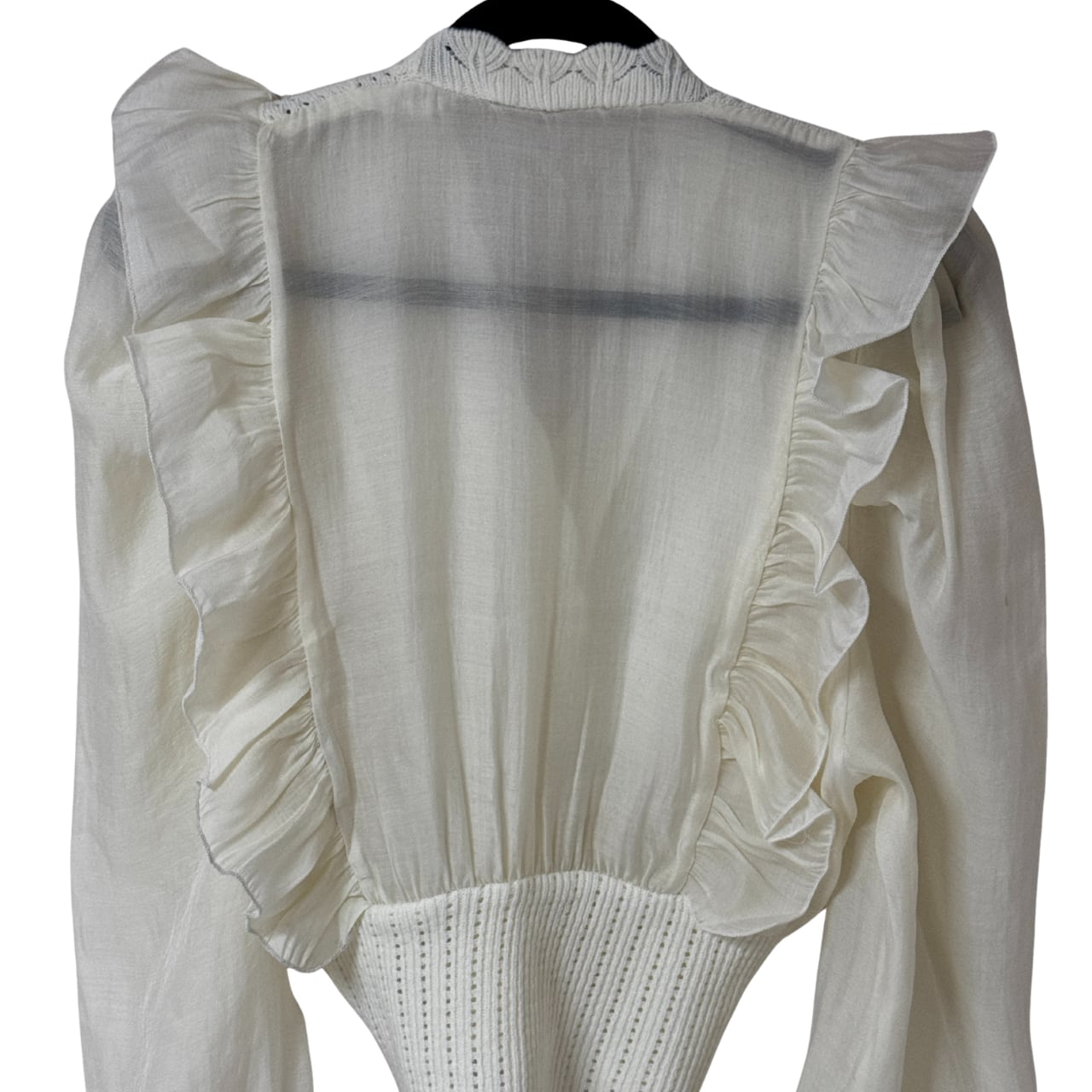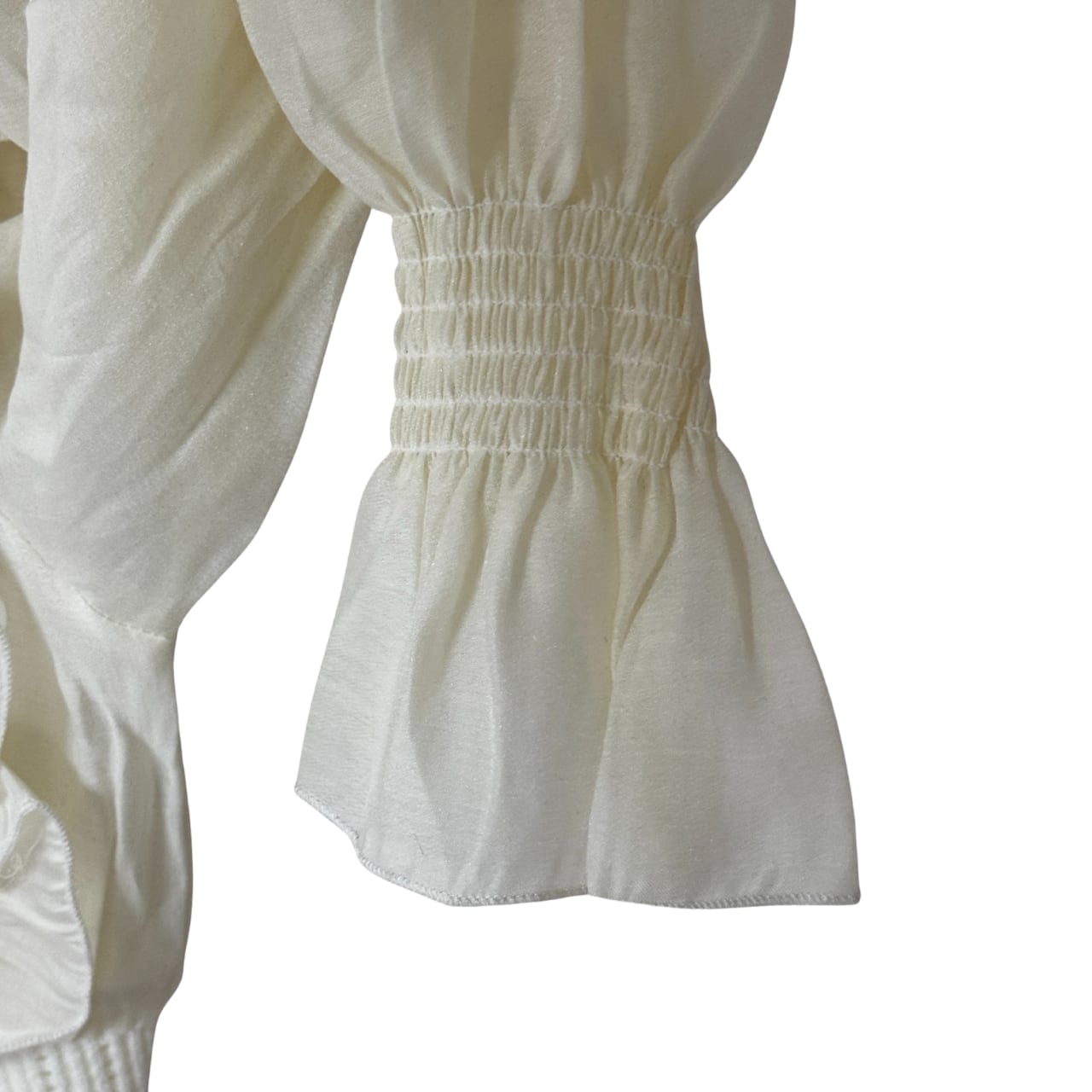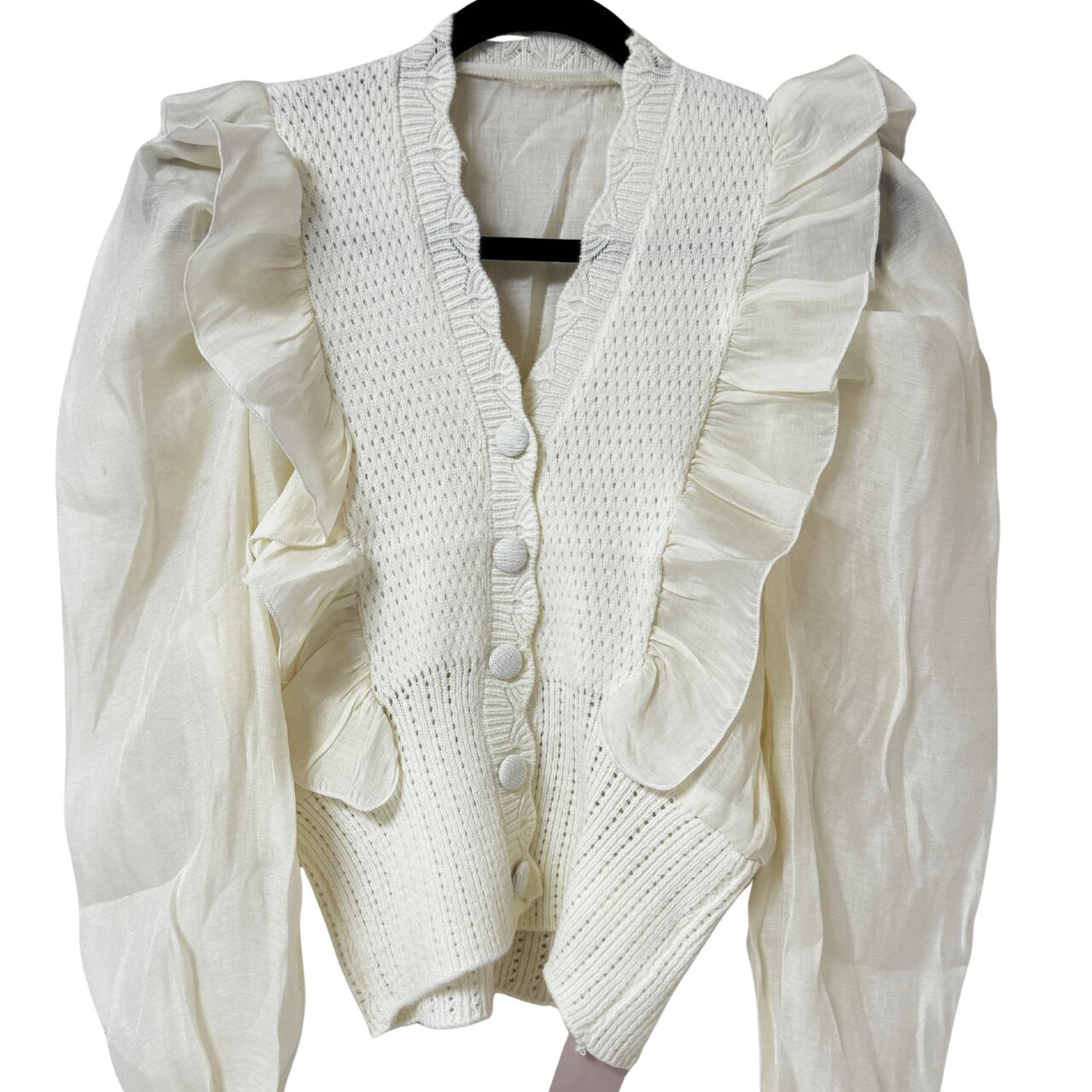 ふんわりとしたシフォン袖と立体感のあるフリルが、顔周りを華やかに見せます。