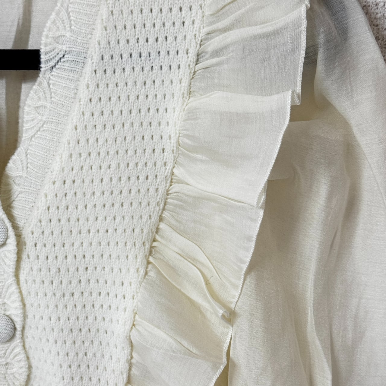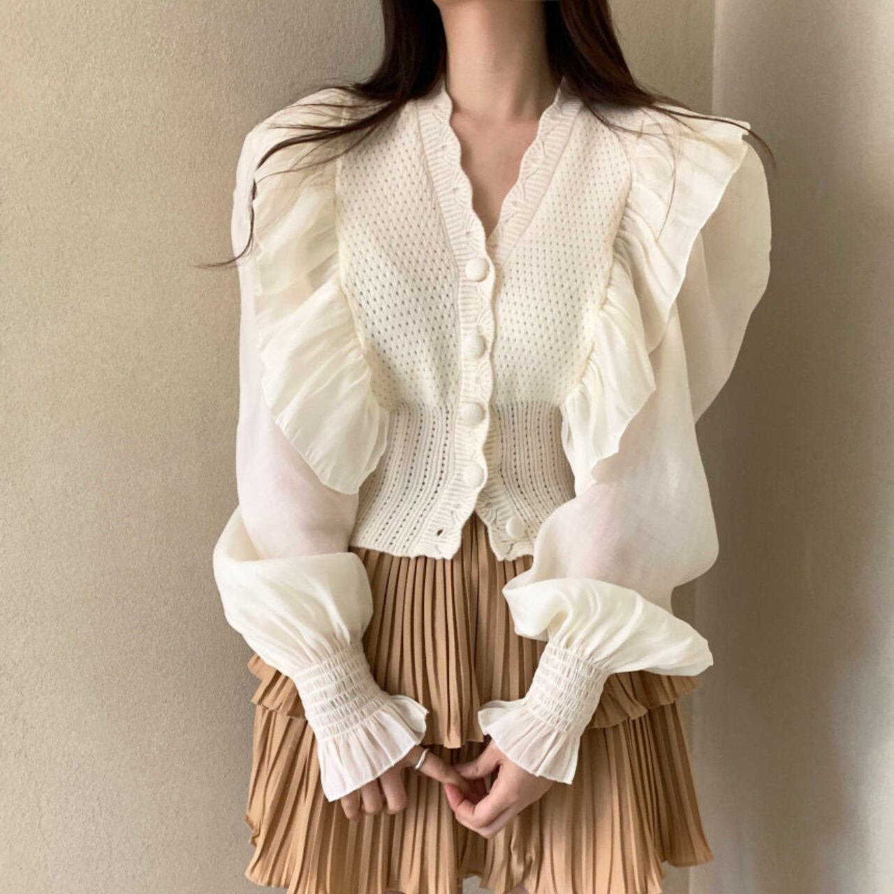 女性らしさと上品さを一枚で叶える、フリルスリーブとニットベストのドッキングデザインブラウス。