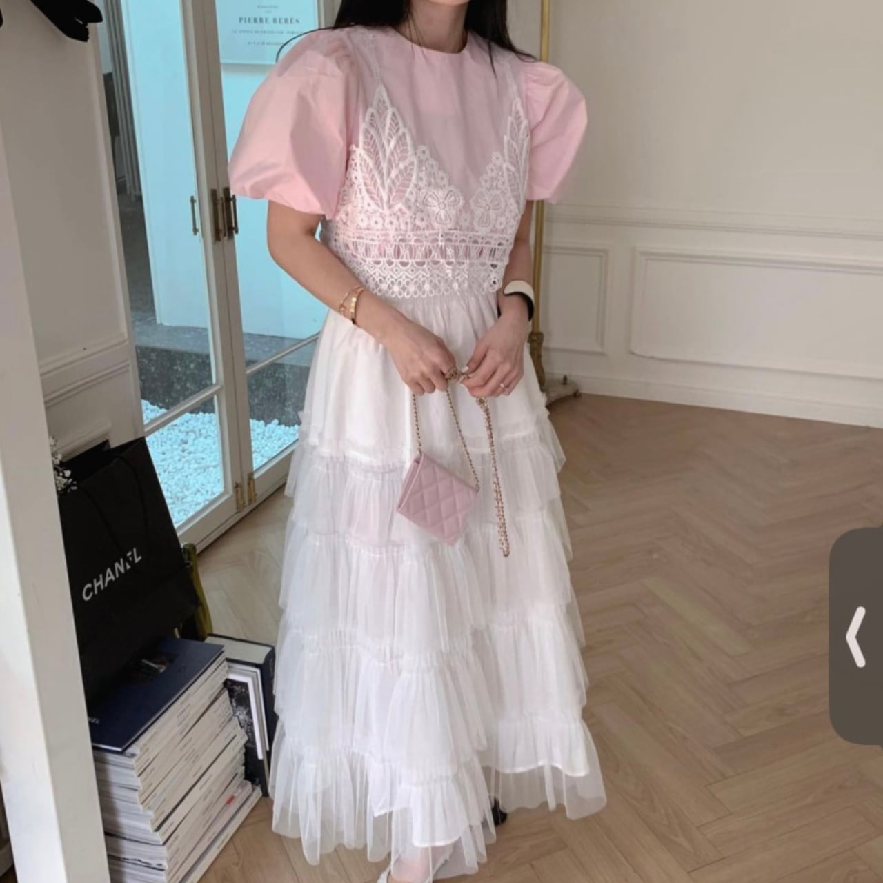 袖口のシャーリングや立体感のあるフリルが、華やかさと上品さを演出します。