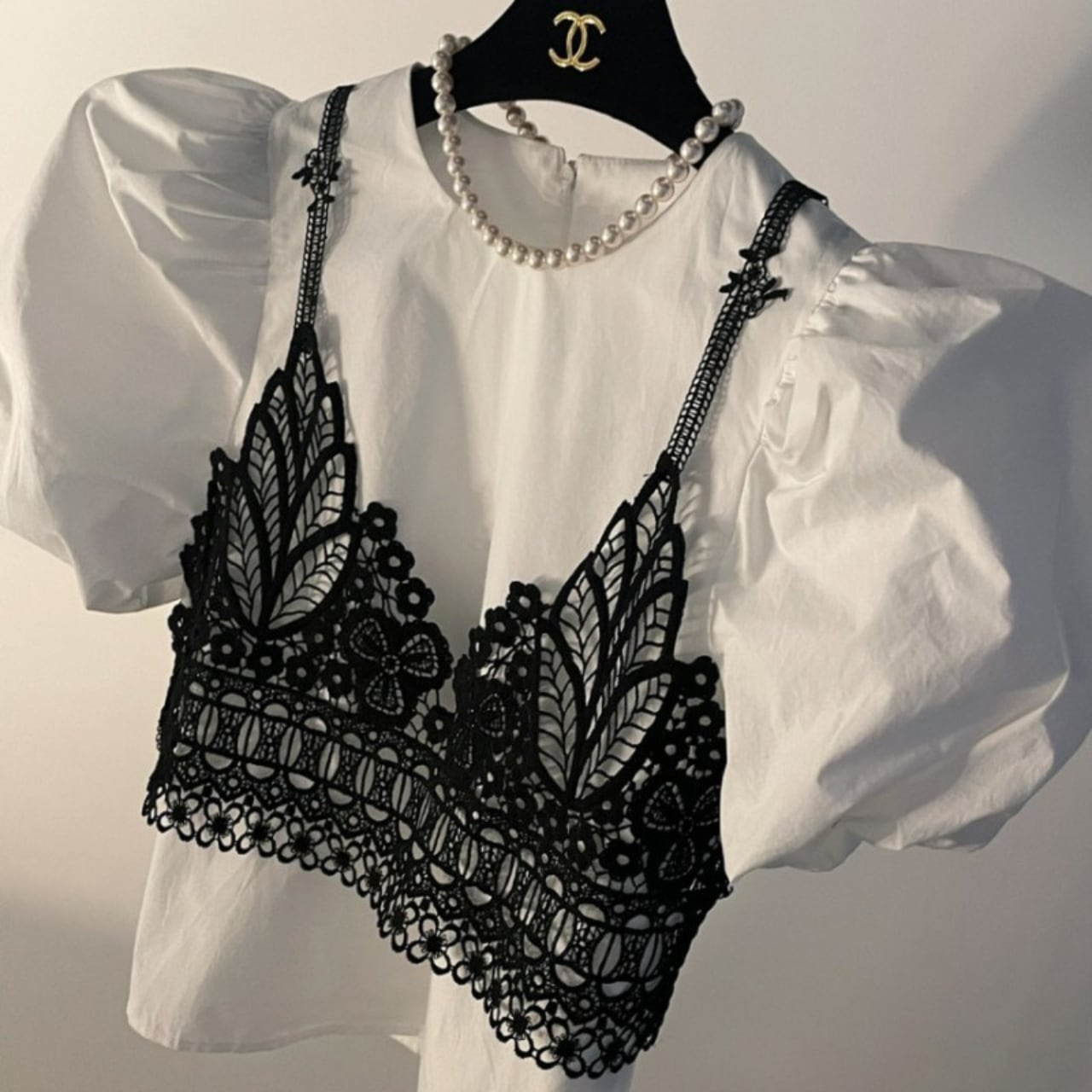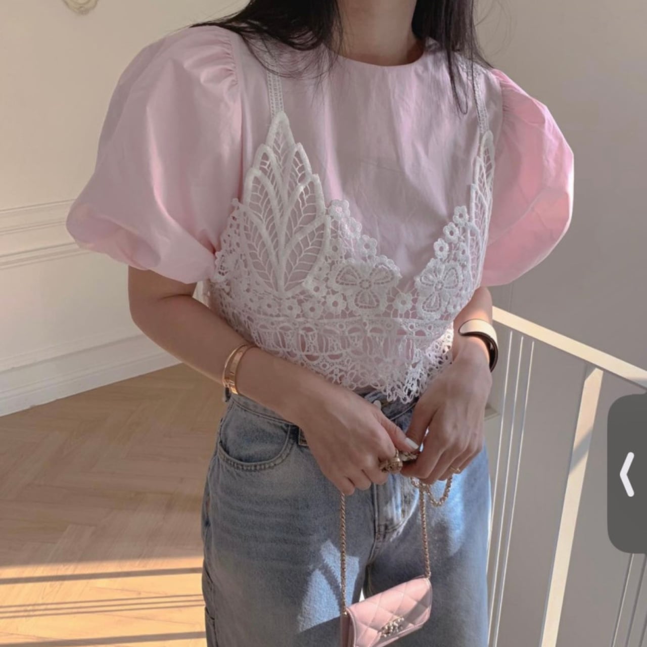 ふんわりとしたシフォンブラウスと、ショート丈のニットベストをドッキングした大人可愛いトップス。