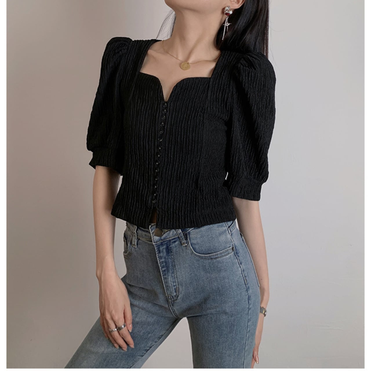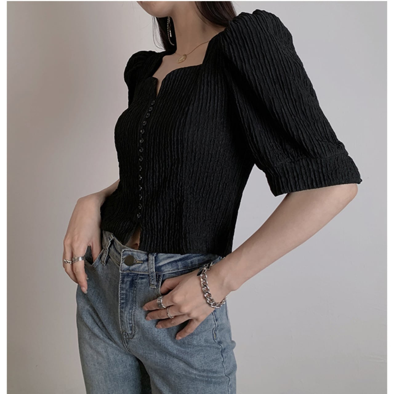 鎖骨をきれいに見せるハートネックと、身頃のシャーリング(スモッキング)で細見えを叶える一枚。二の腕をふんわりカバーするパフ袖、ウエスト位置が高く見えるやや短め丈で、スカートにもデニムにも好相性。前ボタン開閉で着脱もラク。オンオフ問わず活躍します。