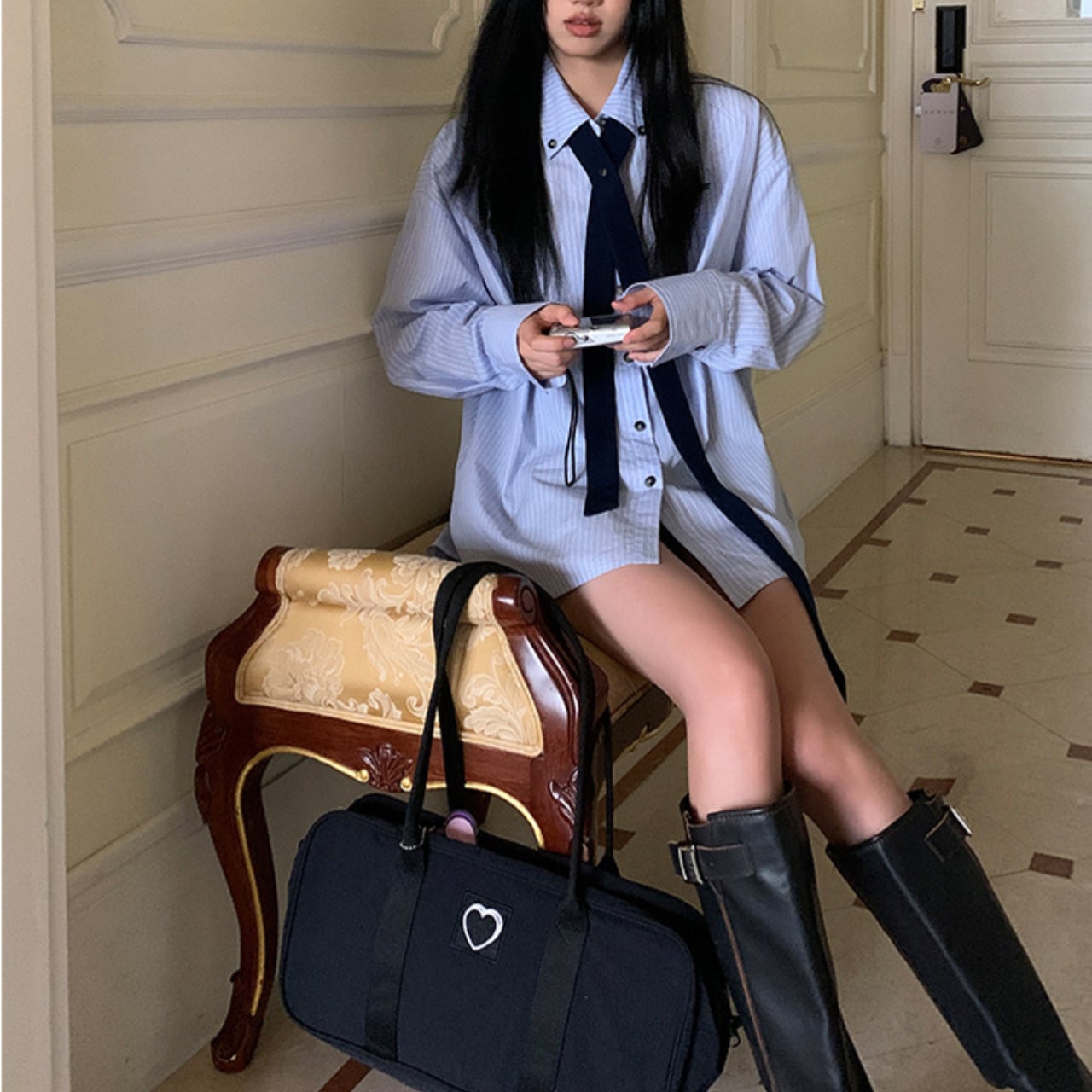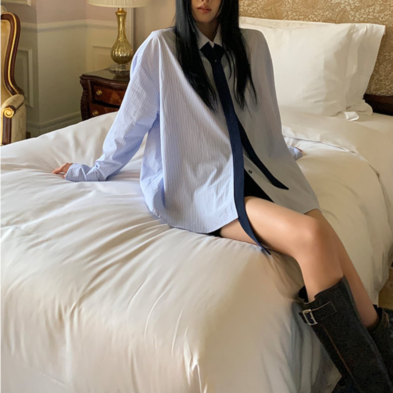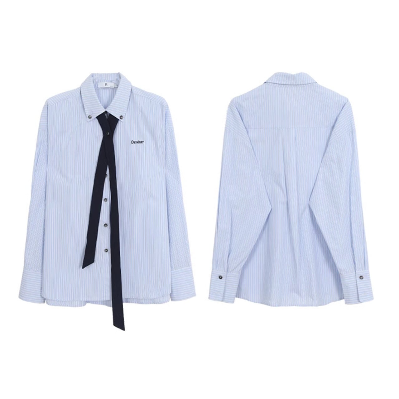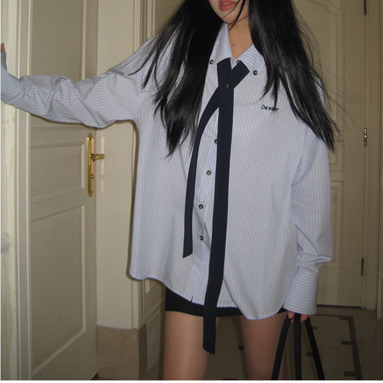 ゆったりとしたオーバーシルエットに、胸元のロングタイデザインがアクセントになるシャツです。