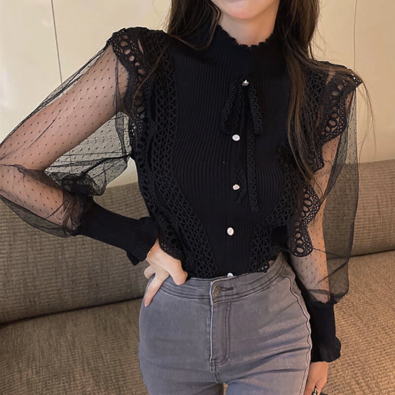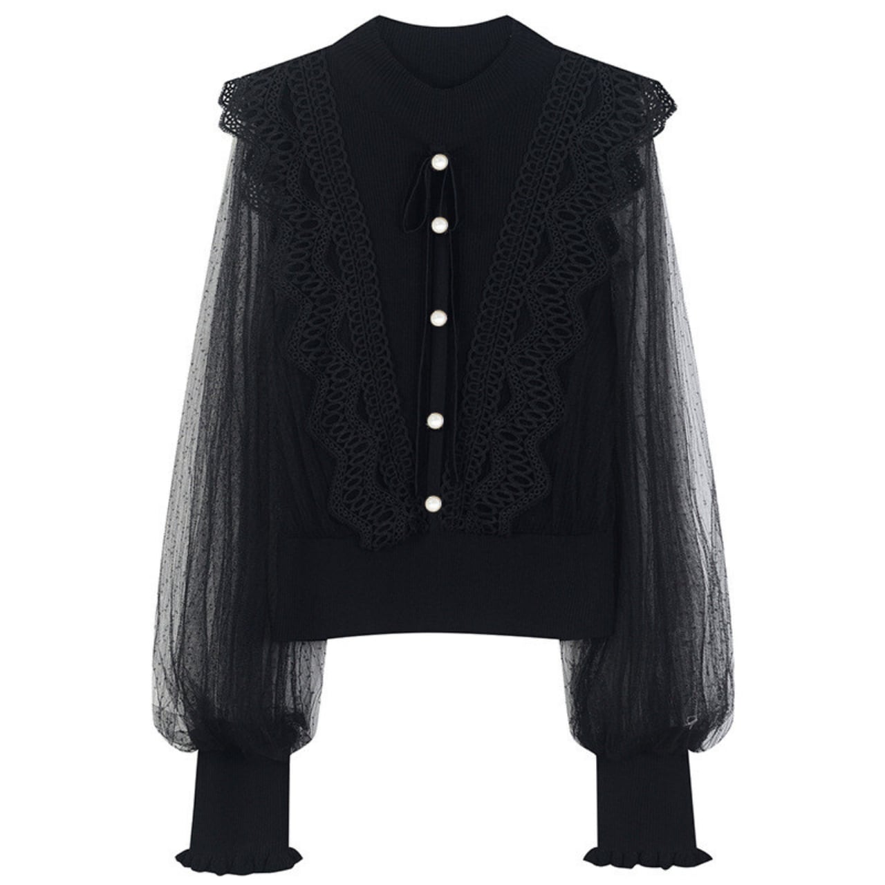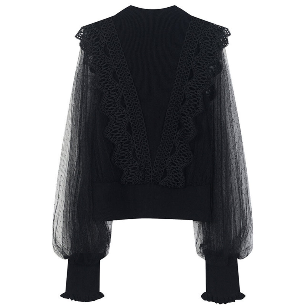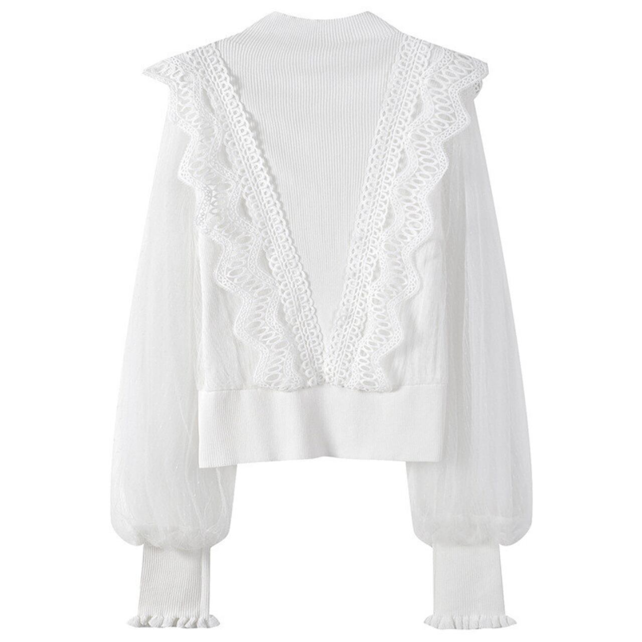 レース×シアードット袖 ハイネックリブブラウス a340
