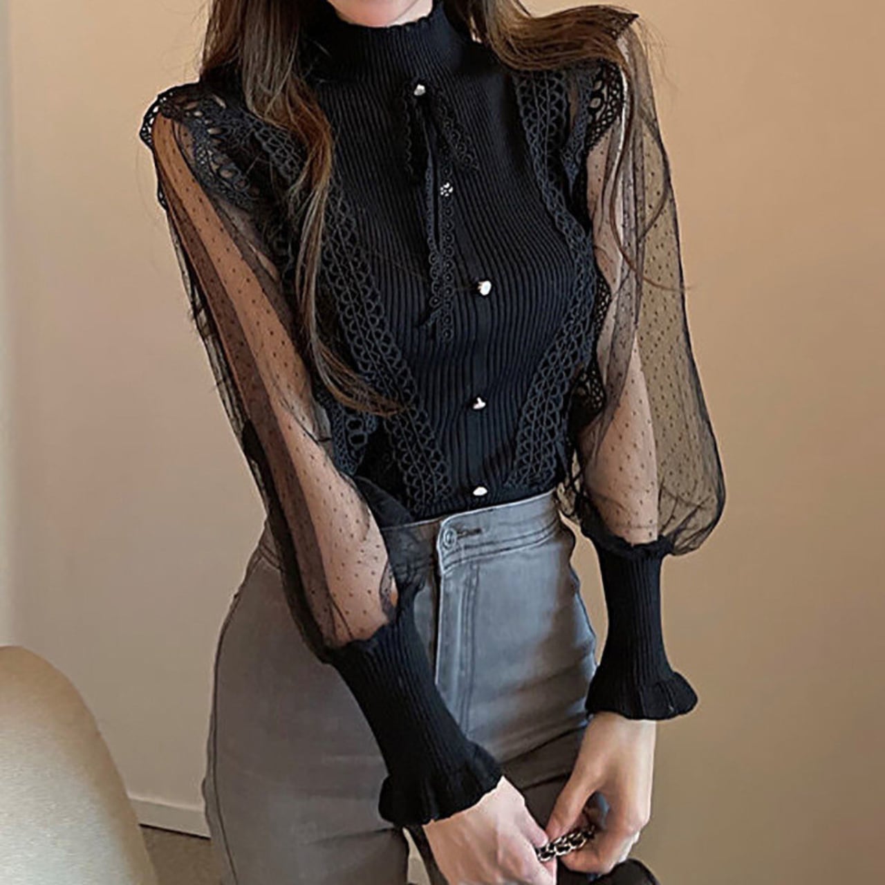 ハイネック×長めカフスでクラシックに。ジャケットINしても衿とレースが映える。