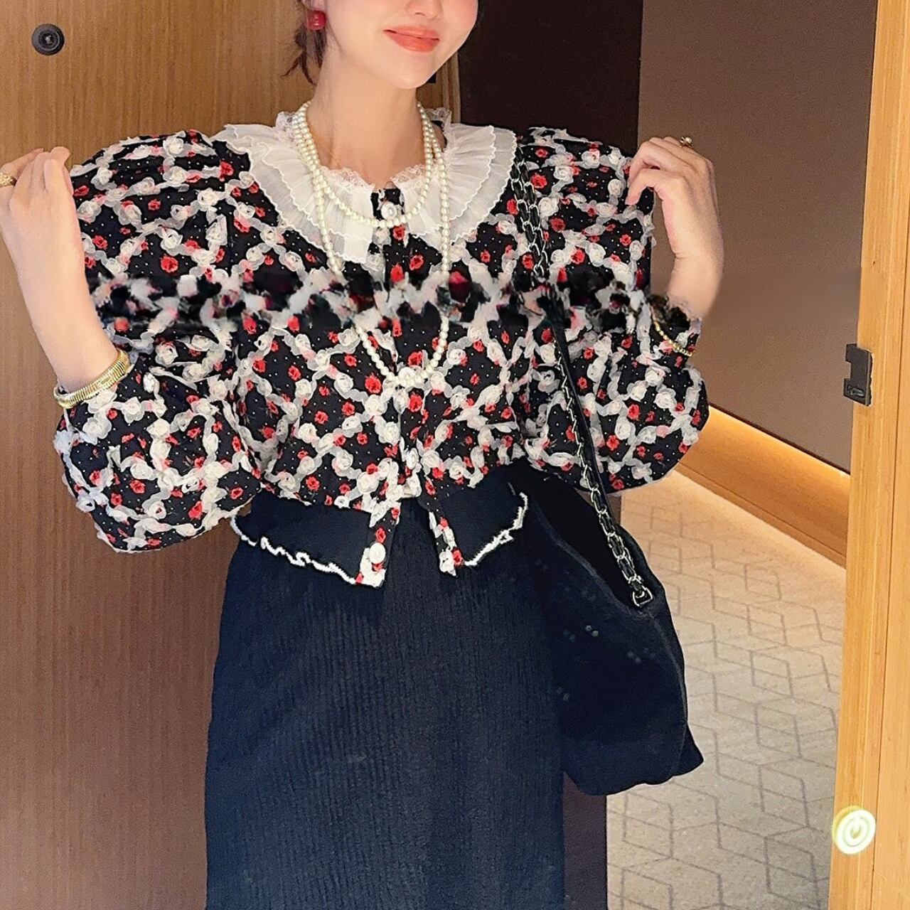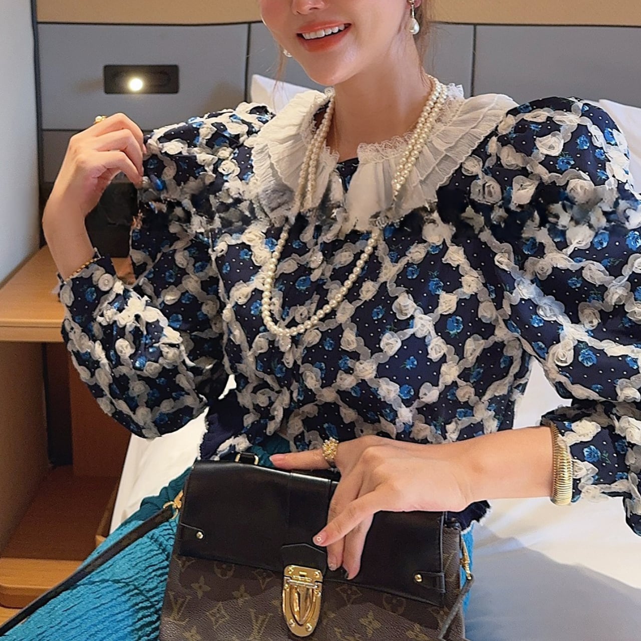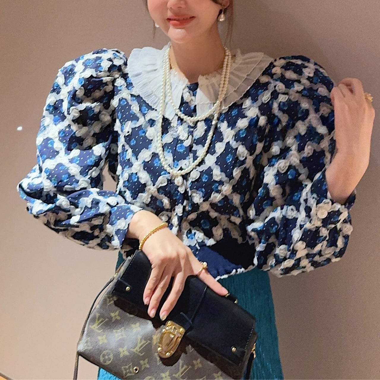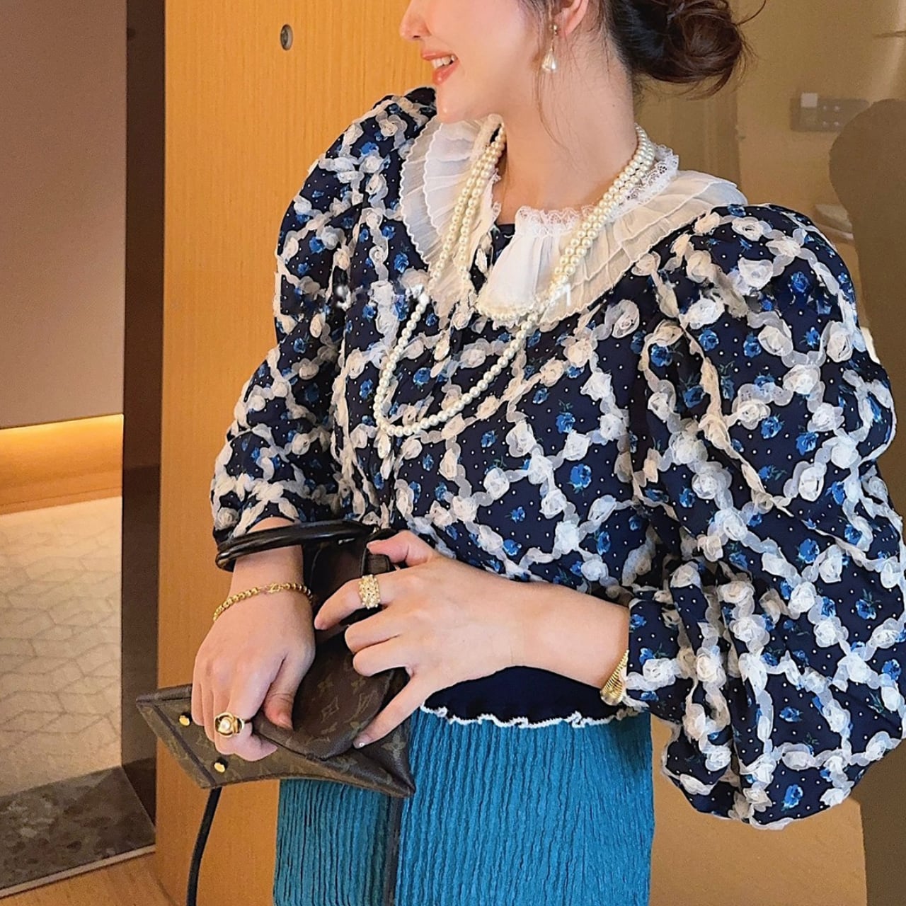 プリーツレース・ビブ×フラワー パフブラウス a345