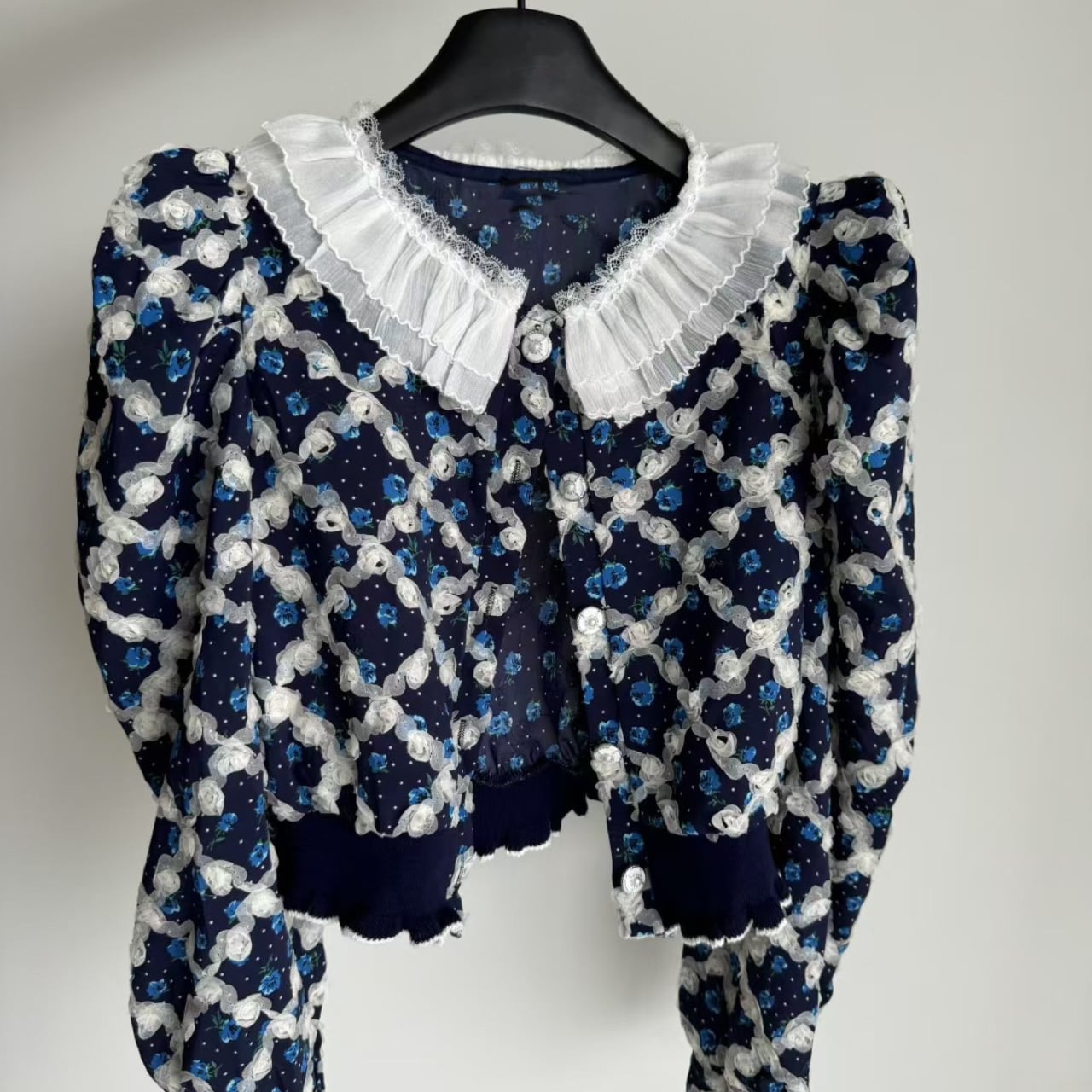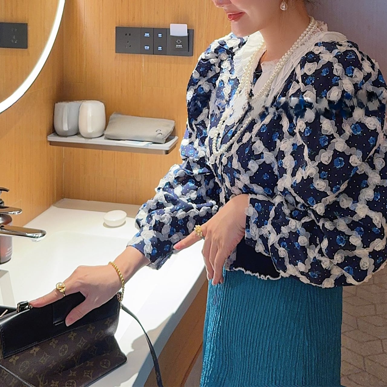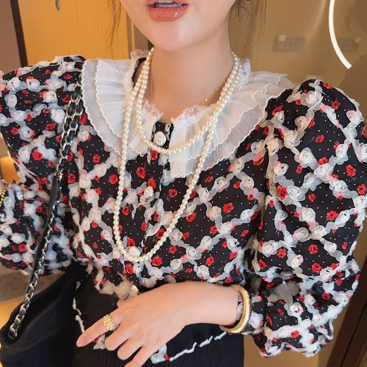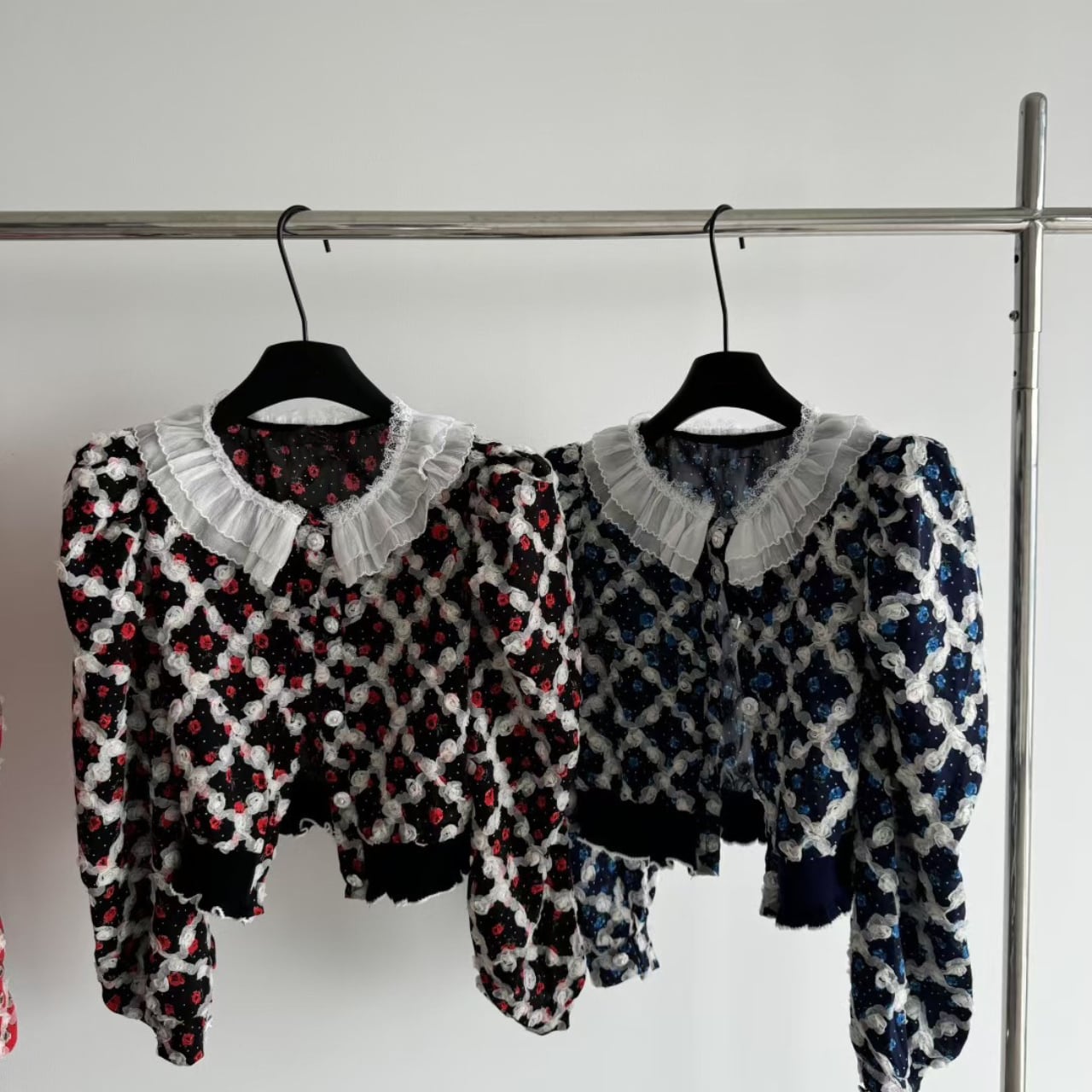 プリーツレース・ビブ×フラワー パフブラウス a345