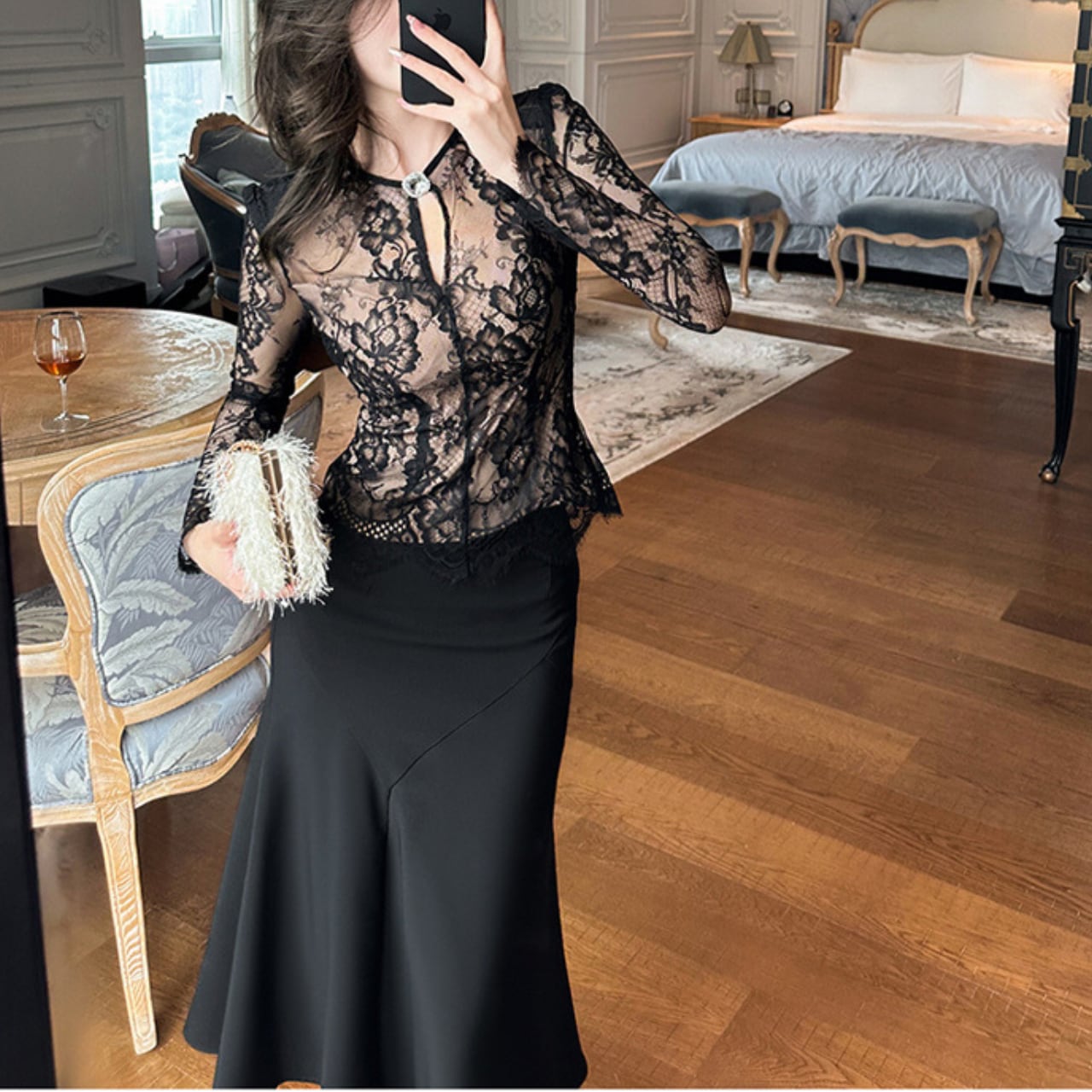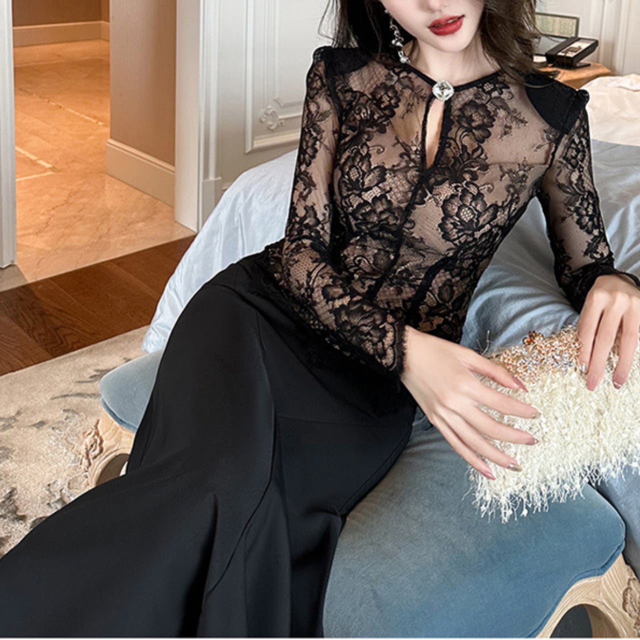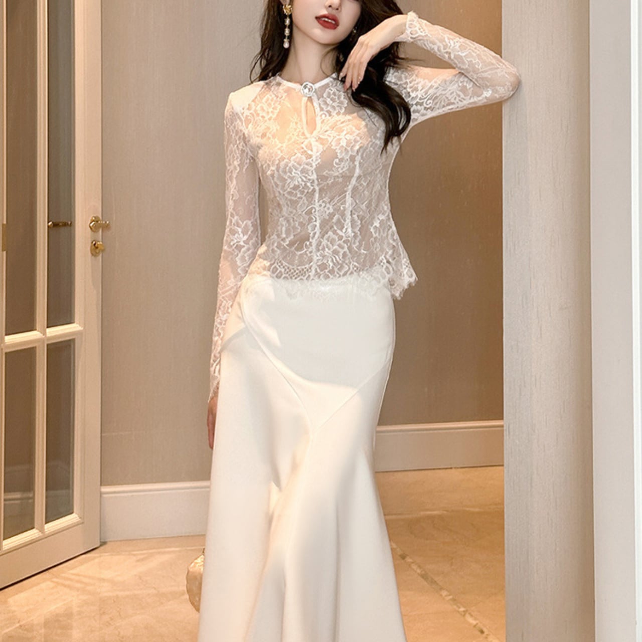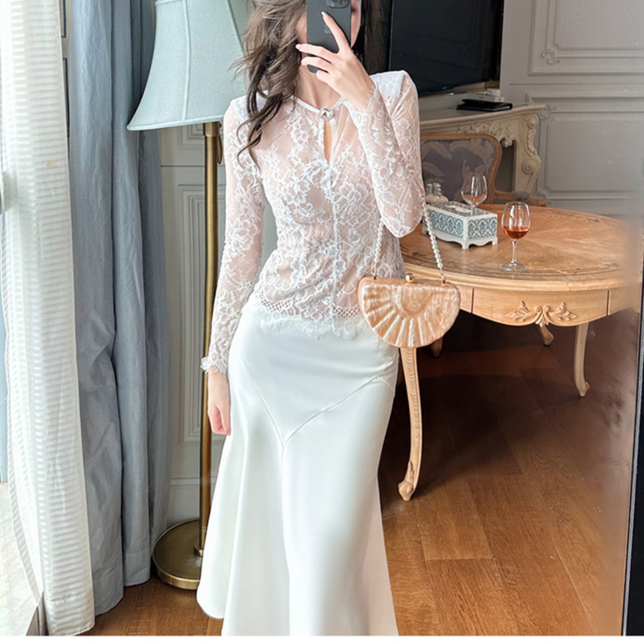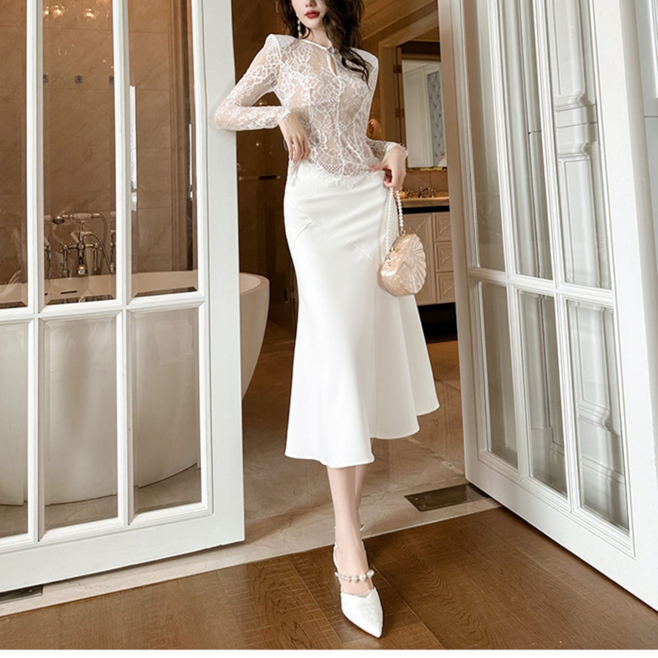 上品な総レースのトップスと、動くたびに揺れるマーメイドスカート。ドレスアップもデイリーも“きれいめモード”に。