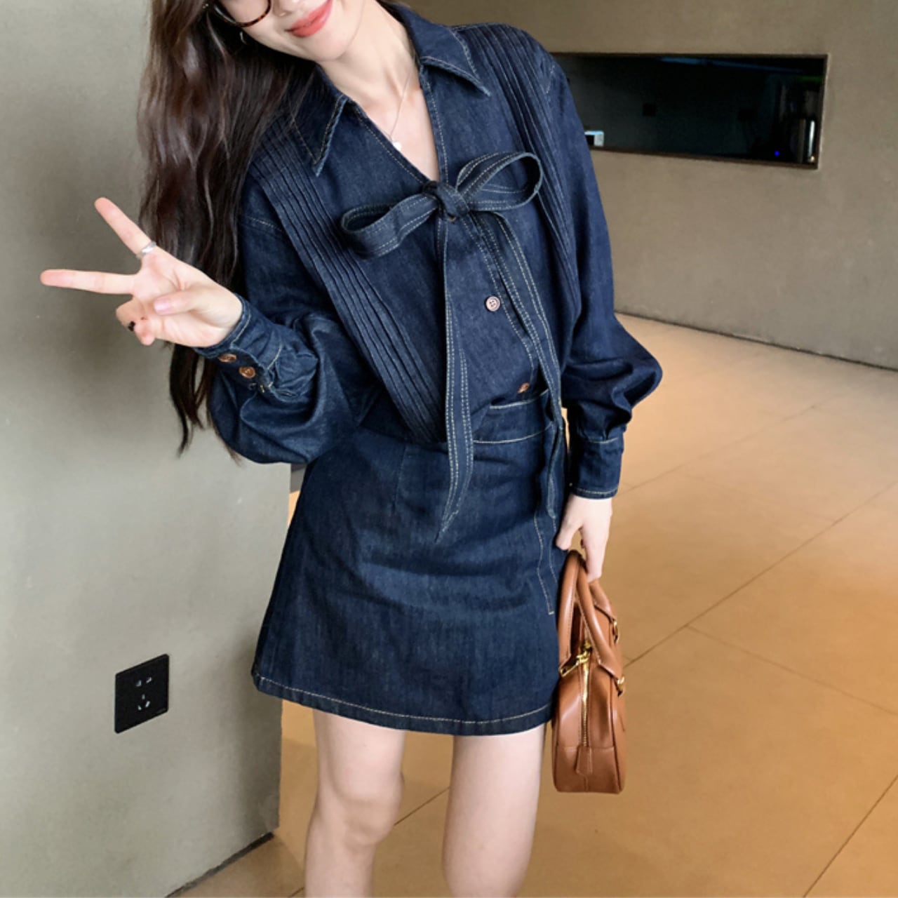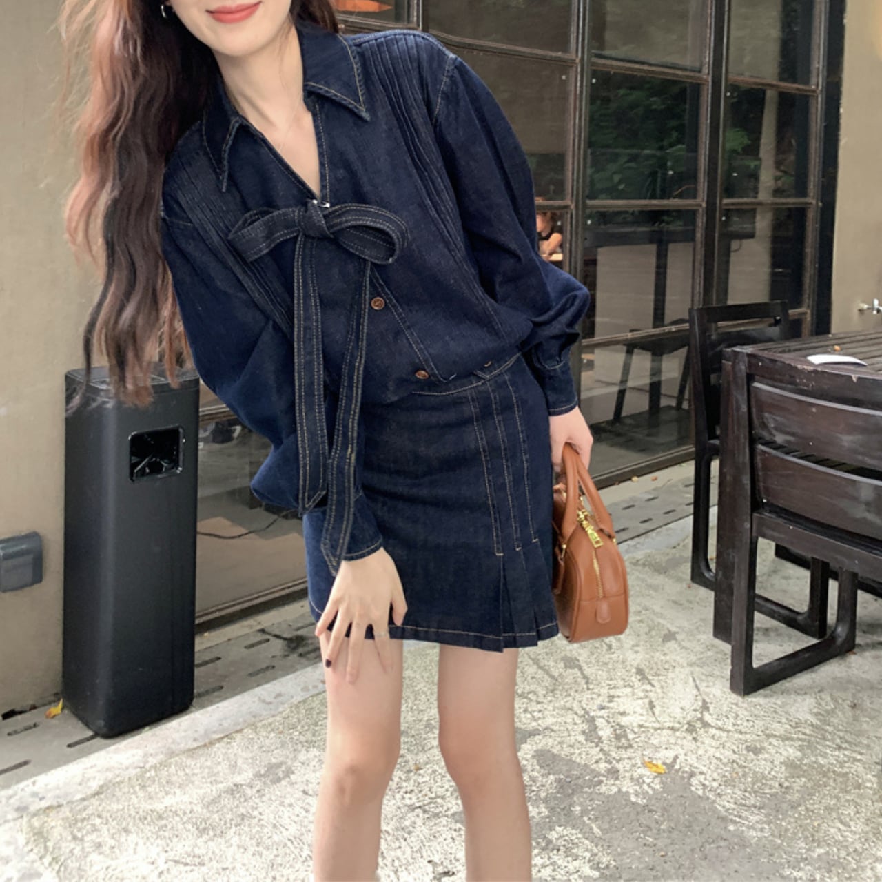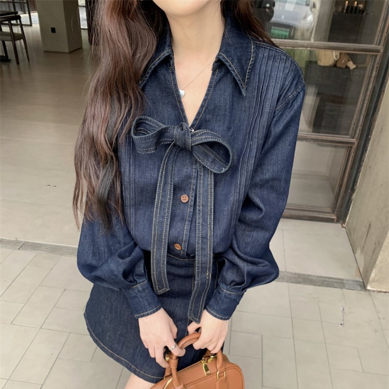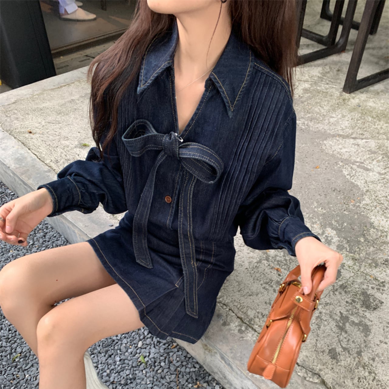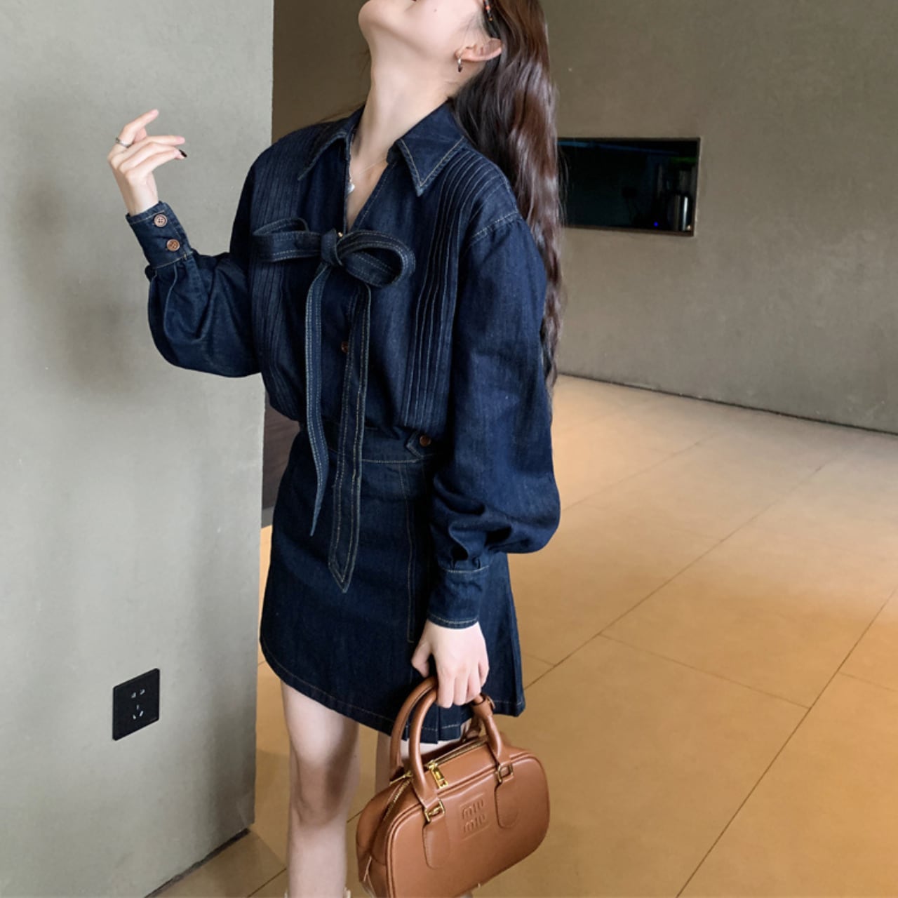 ダークデニム・ボウタイピンタック【セットアップ/シャツ+ミニスカート】a353