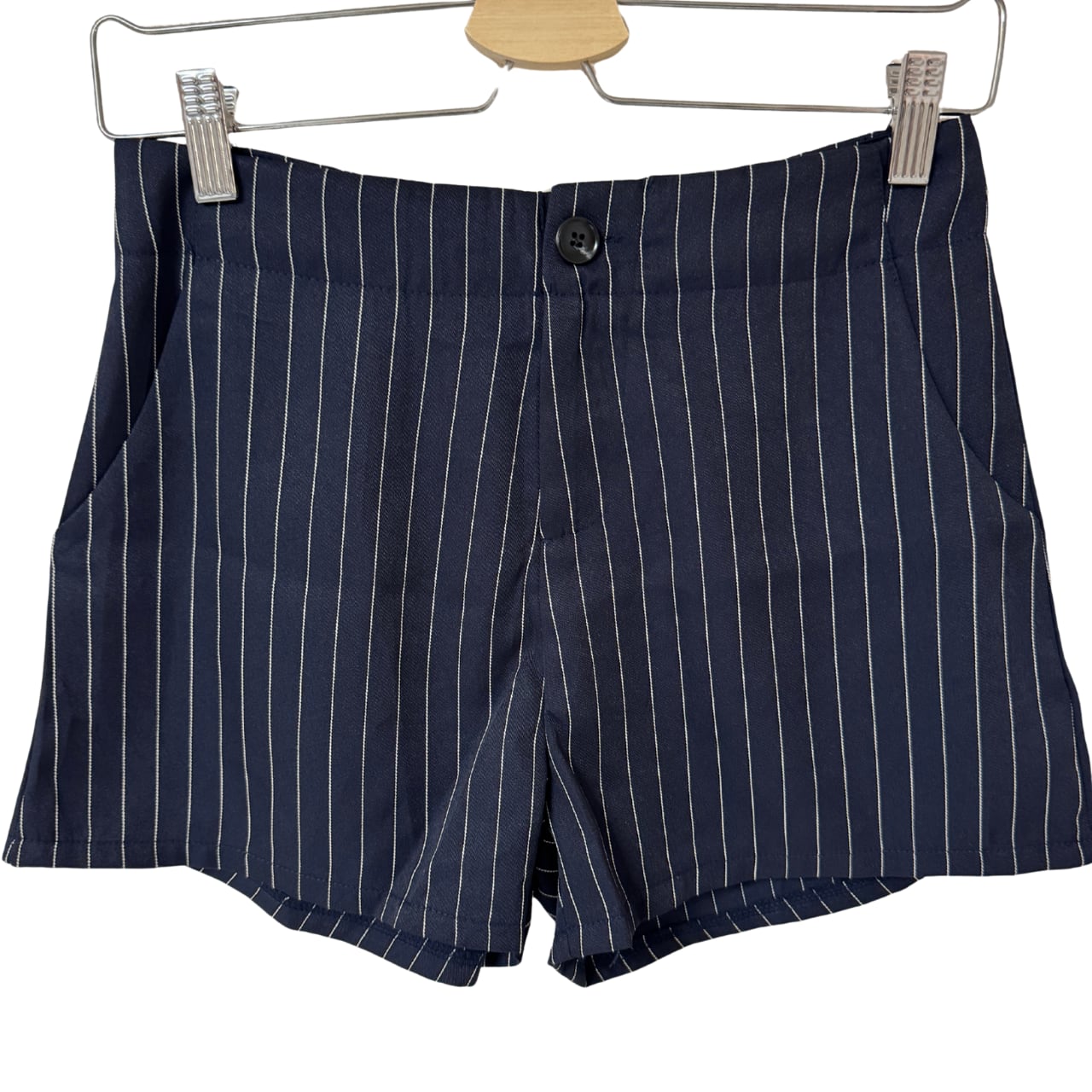 細ピンストライプのシャツに、ハイウエストのミニショーツを合わせた今季主役のセットアップ。