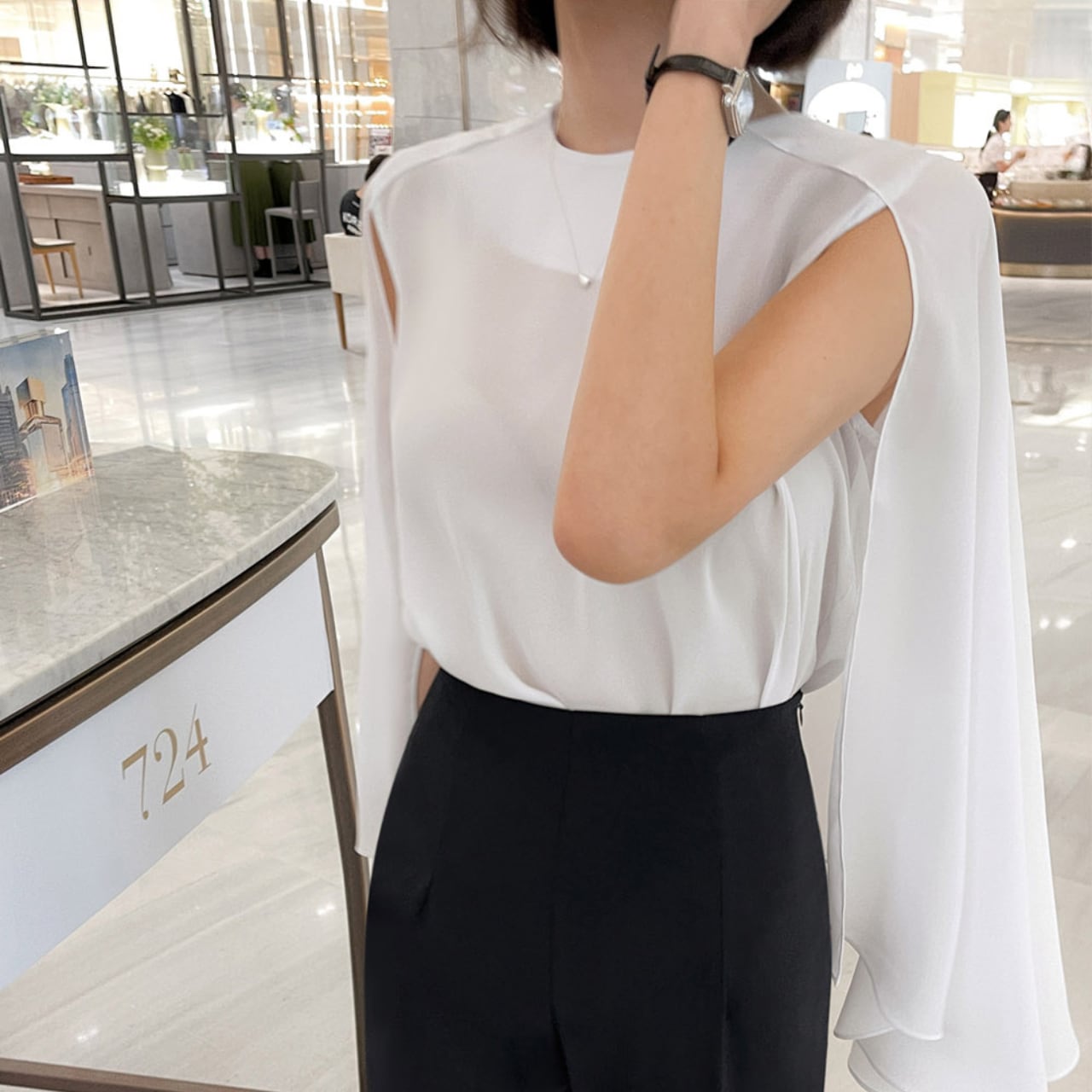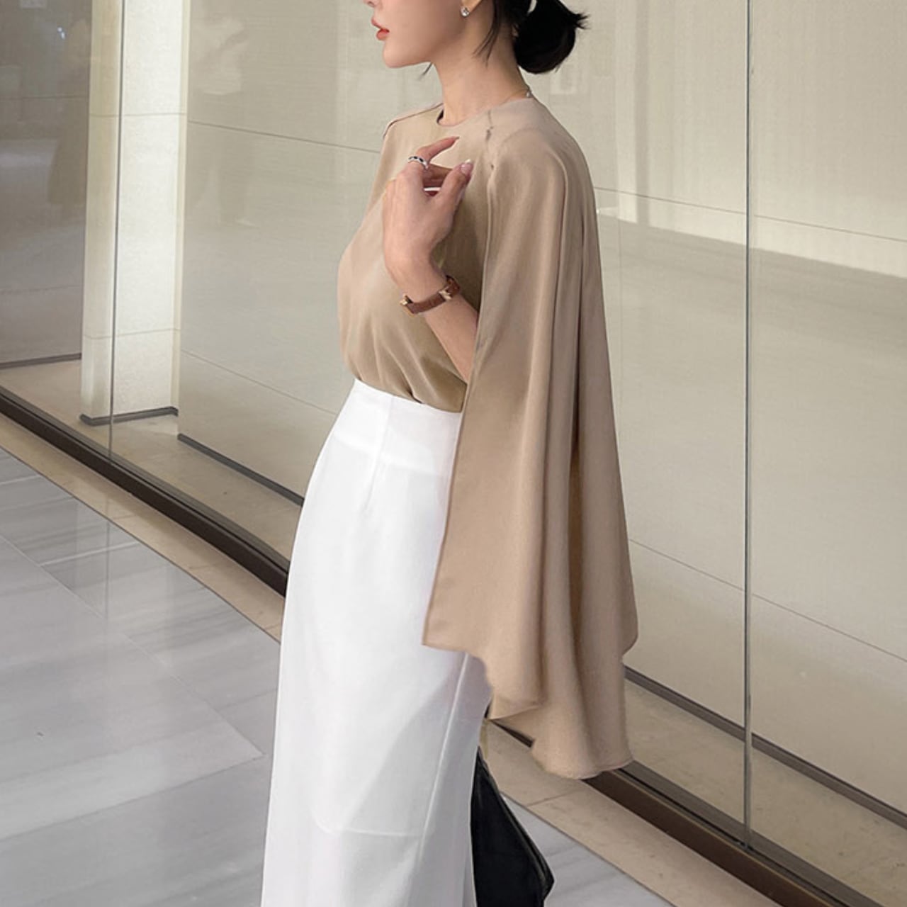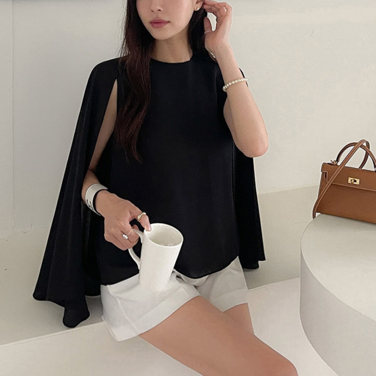 ・クルーネックのノースリーブに、ひらりと流れるケープを重ねた1枚仕立て。