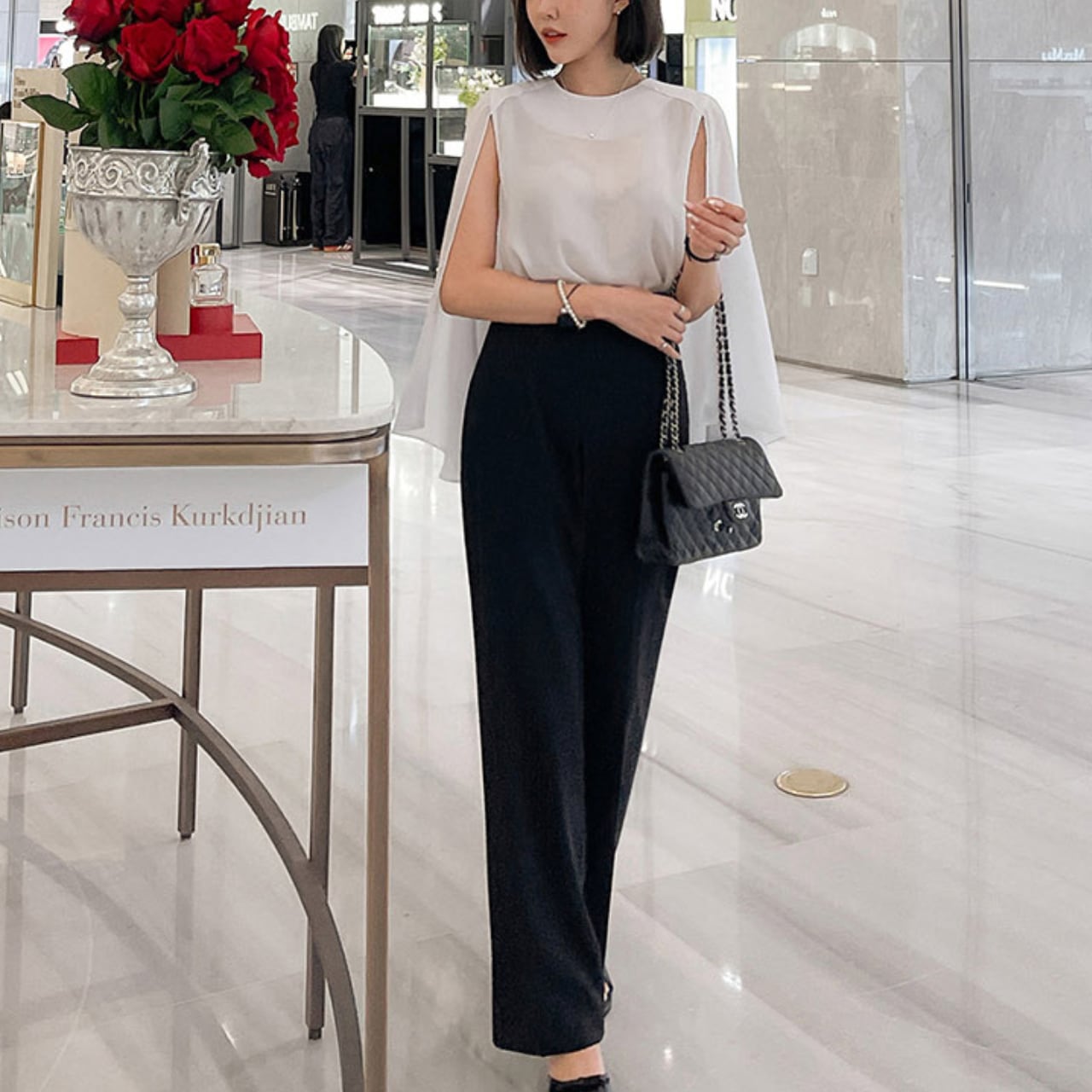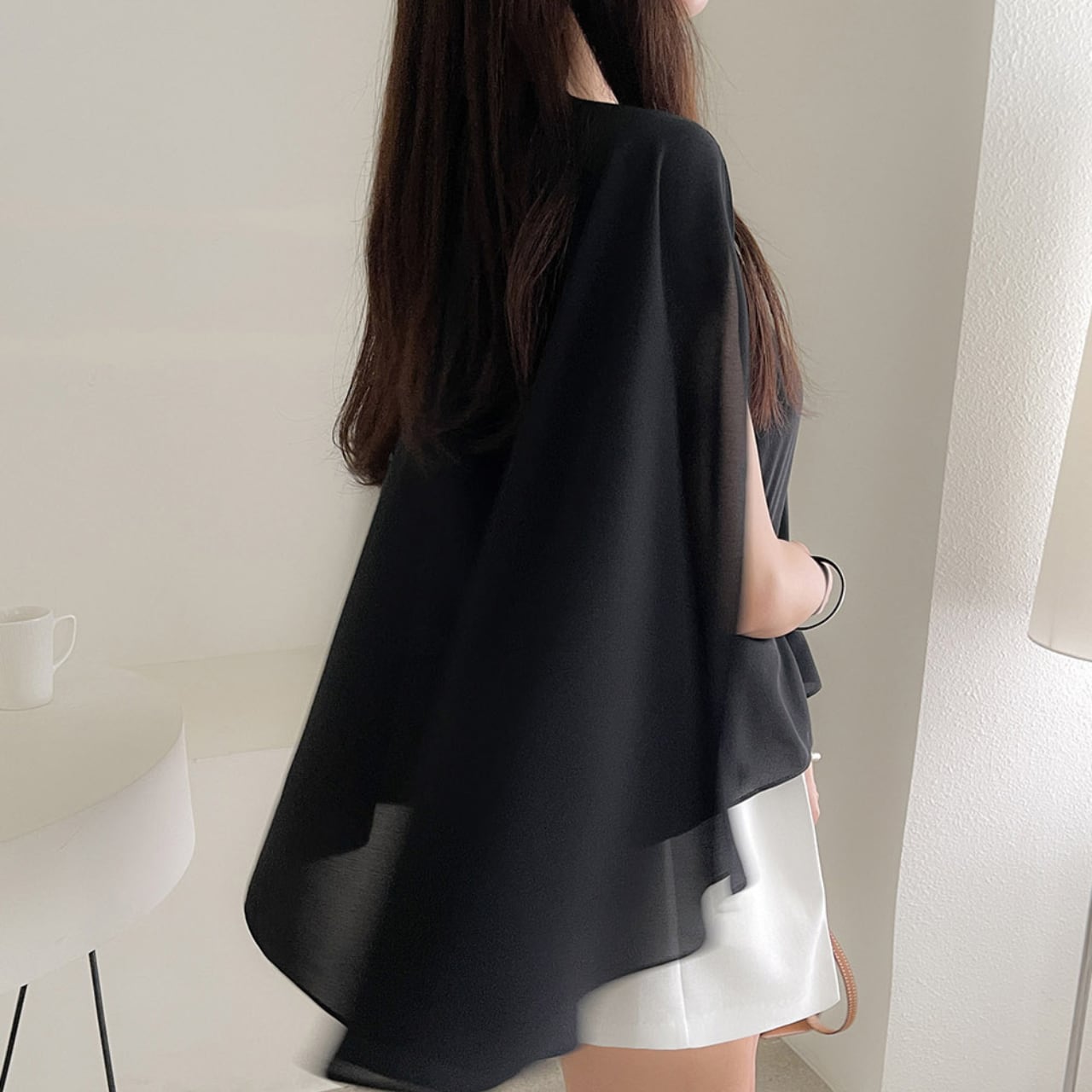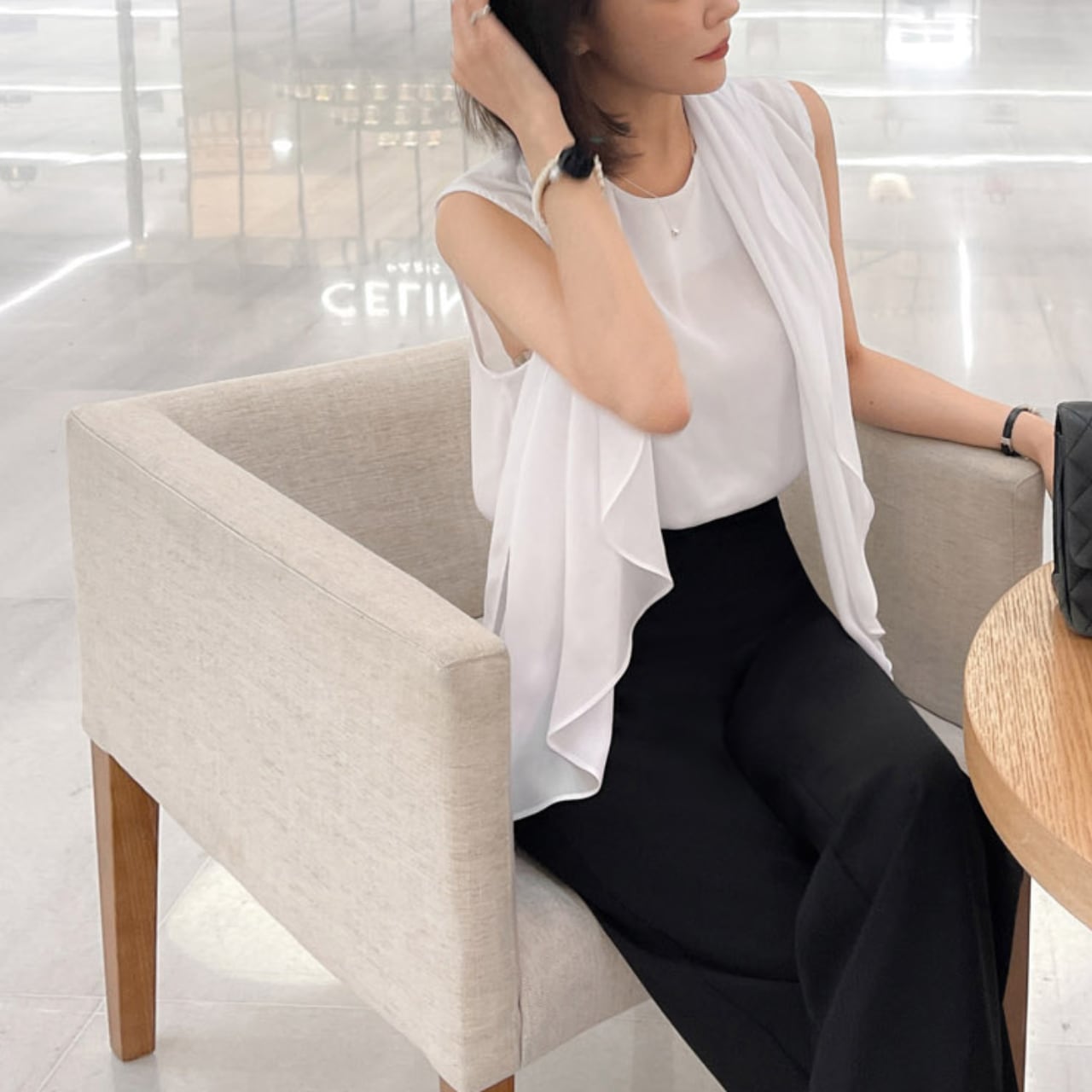 ・クルーネックのノースリーブに、ひらりと流れるケープを重ねた1枚仕立て。