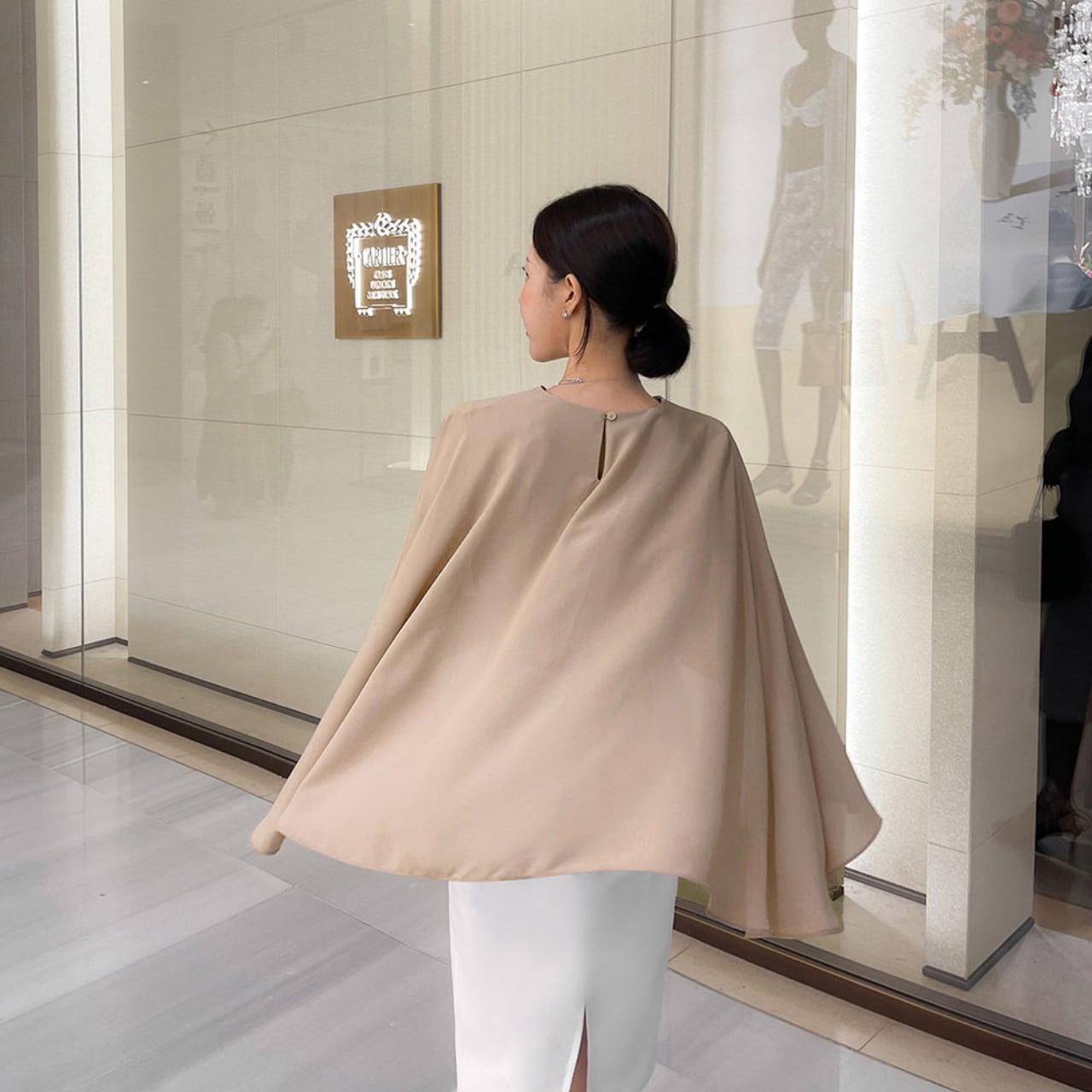 ・前後で着丈に差をつけたドレープが歩くたびに揺れ、二の腕~背中・腰まわりを上品にカバー。