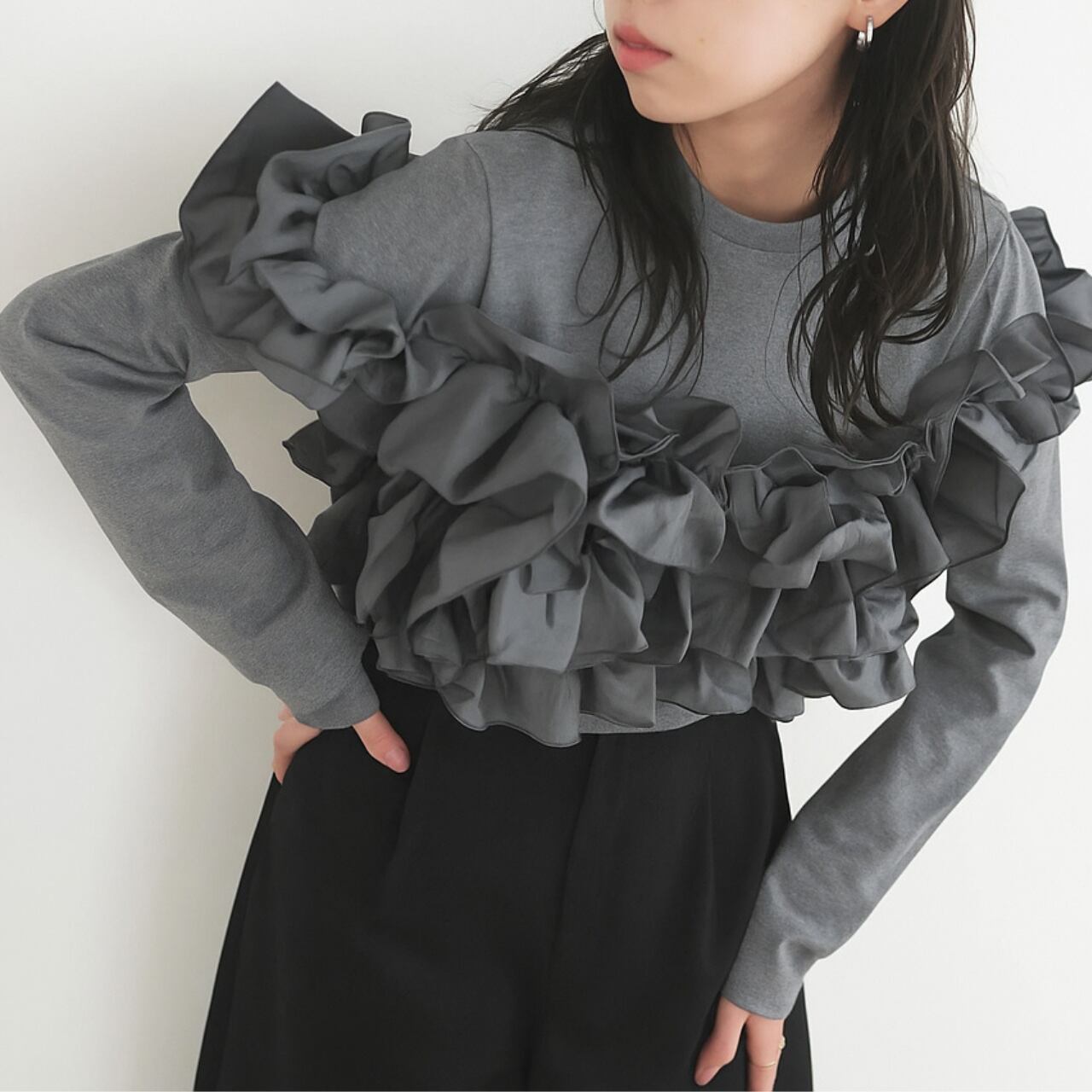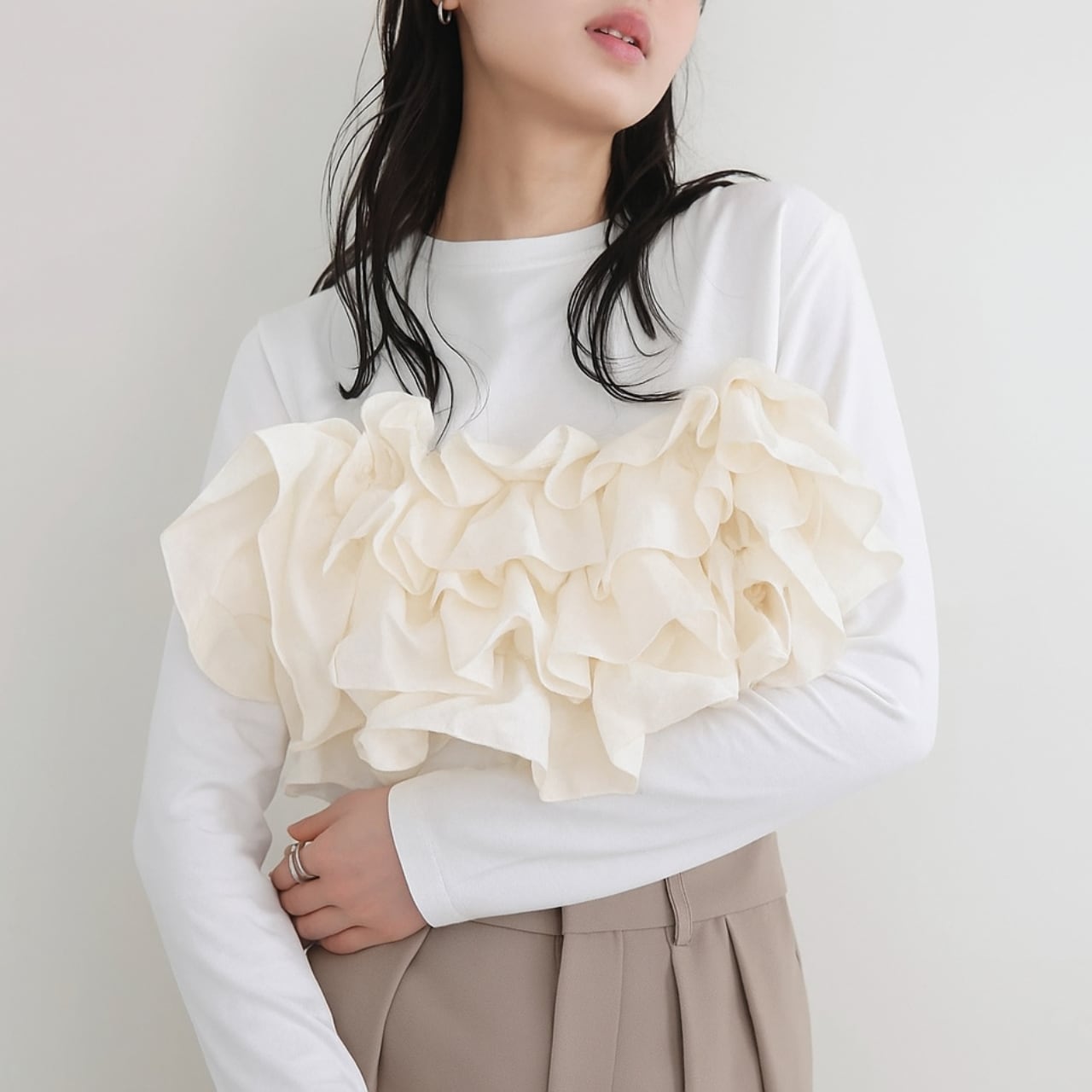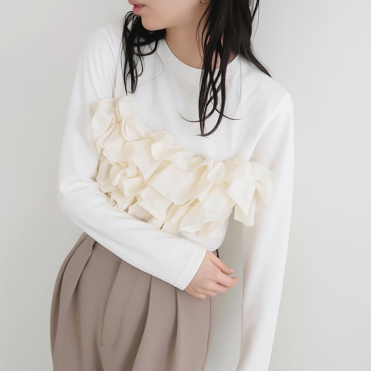 ラッフルはオーガンジー風の軽素材、身頃はきれい見えするカットソー。デイリーに着られる“盛れる”トップスです。