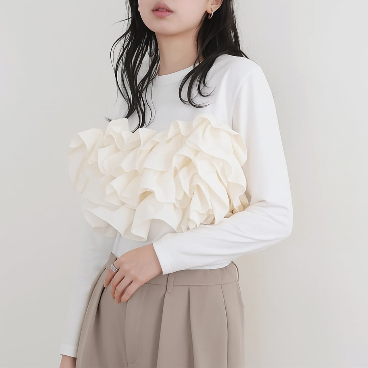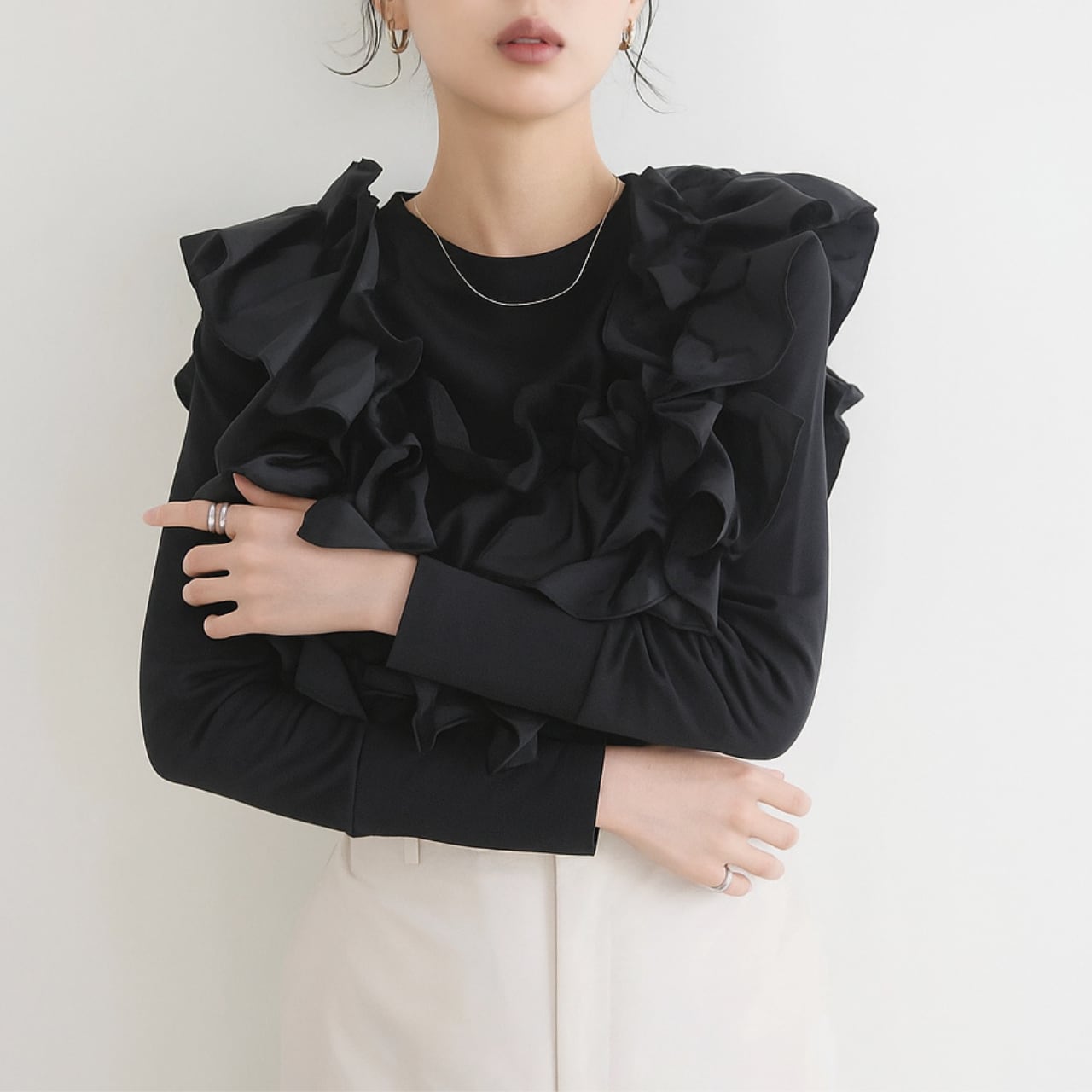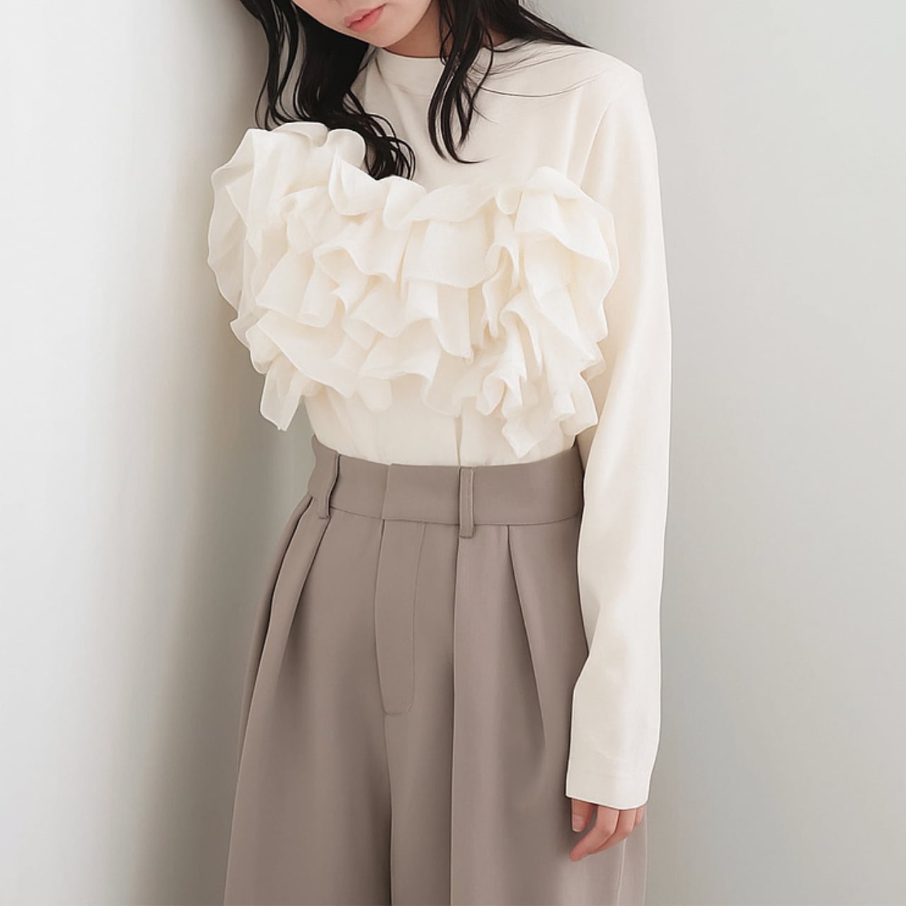 一枚で“映える”——立体フリルでつくる、艶のあるモード。