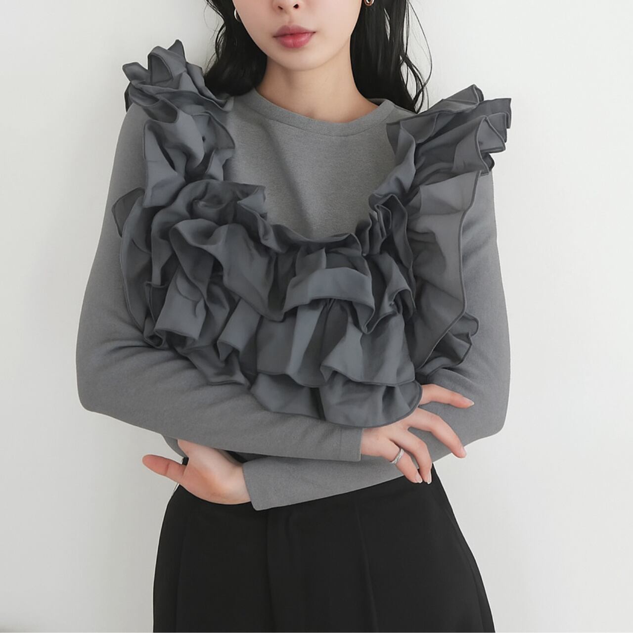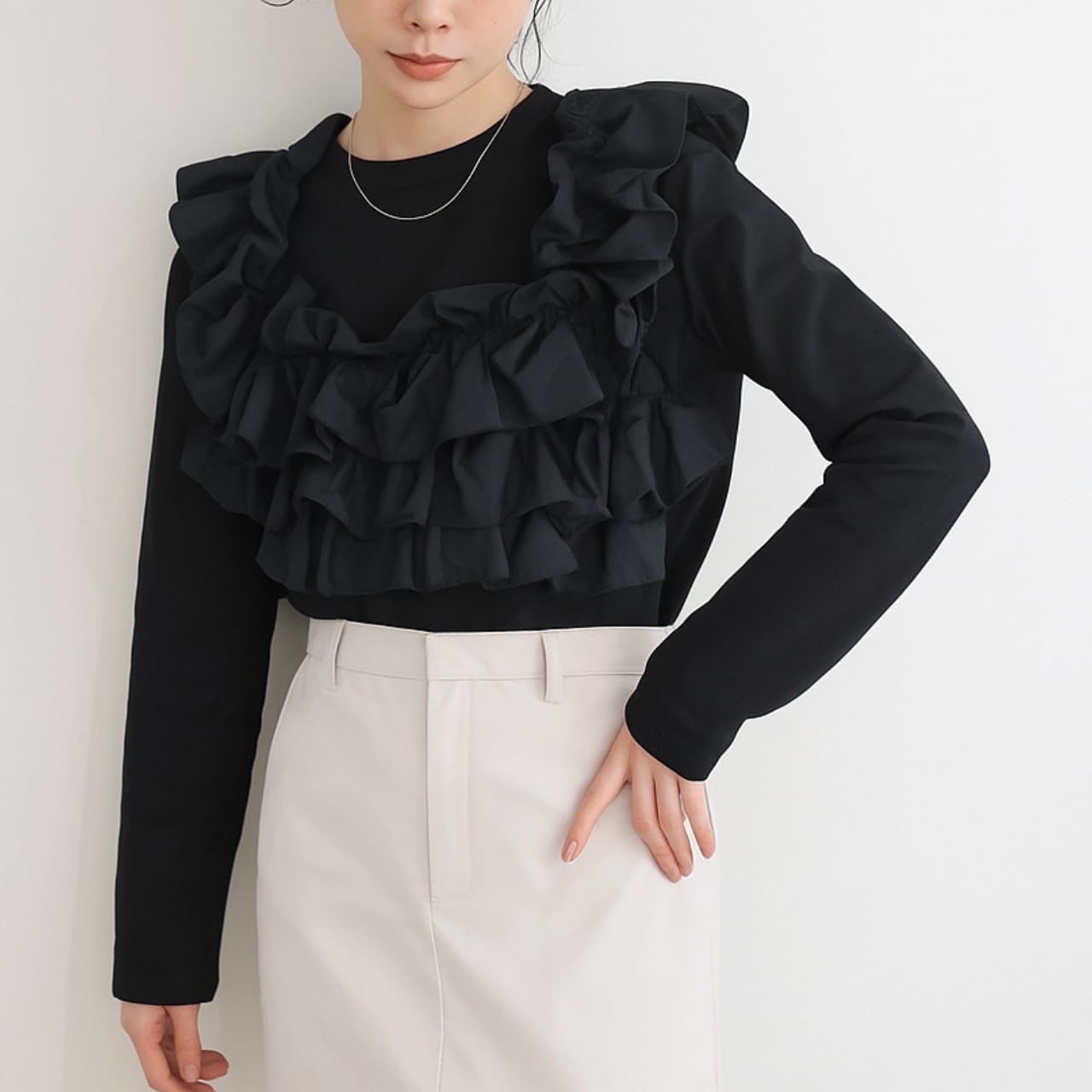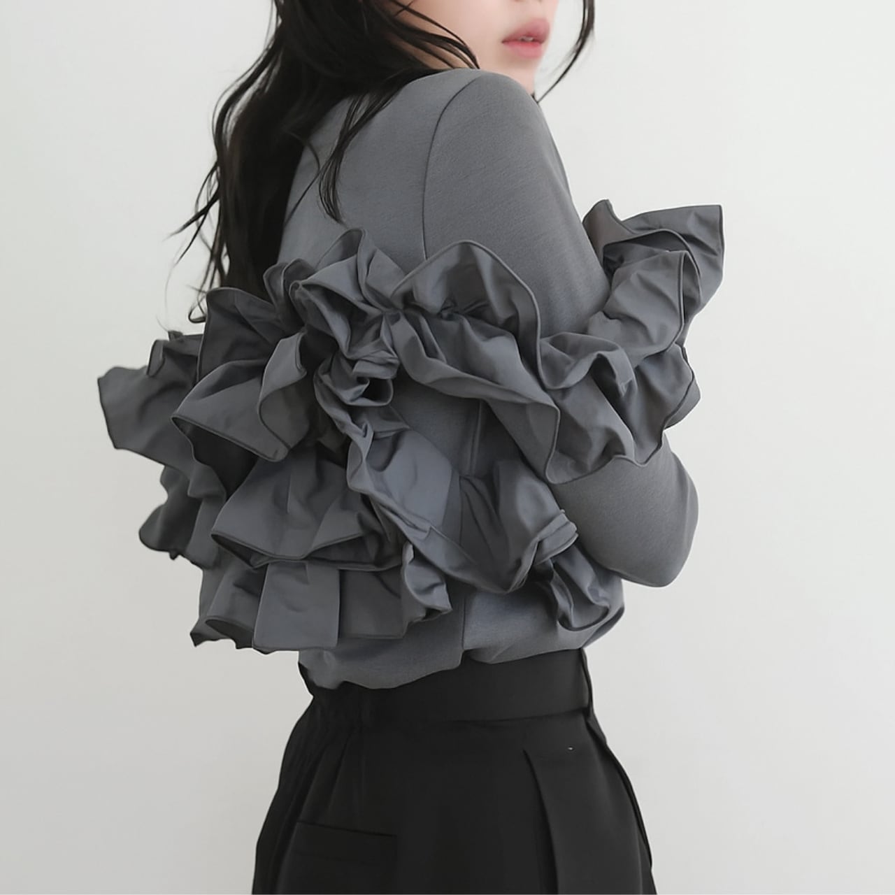 一枚で“映える”——立体フリルでつくる、艶のあるモード。