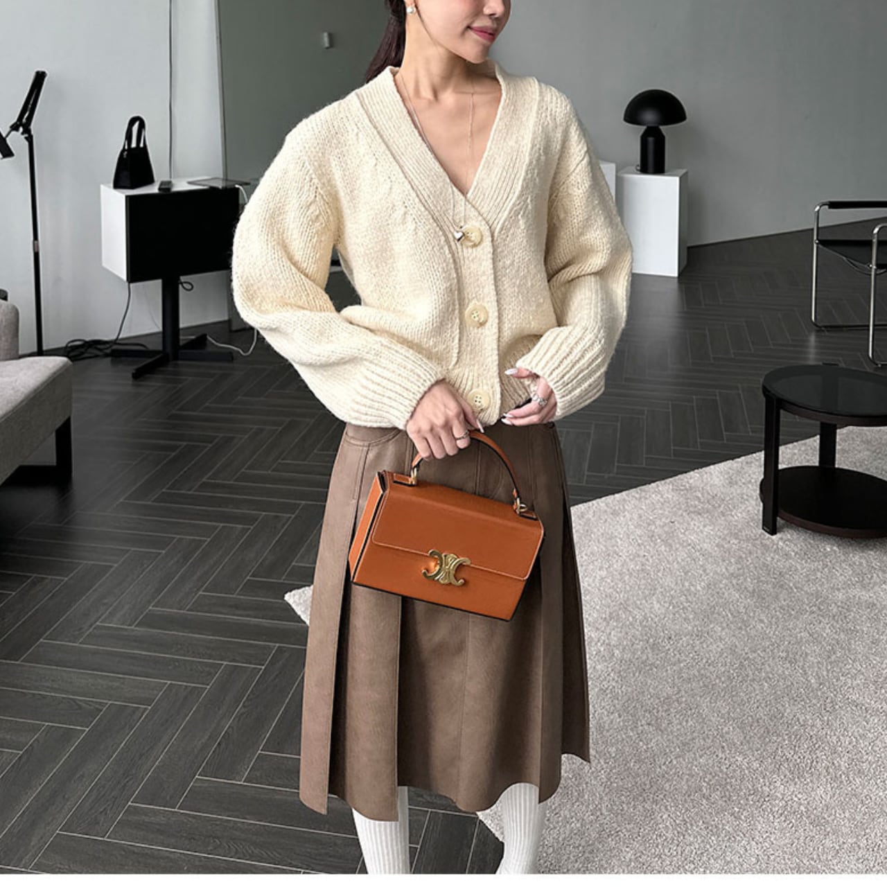 ミディ丈×Aライン:膝下がすっきり見える上品丈。フラット靴でもバランス良し。