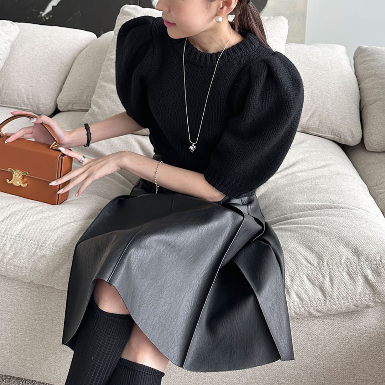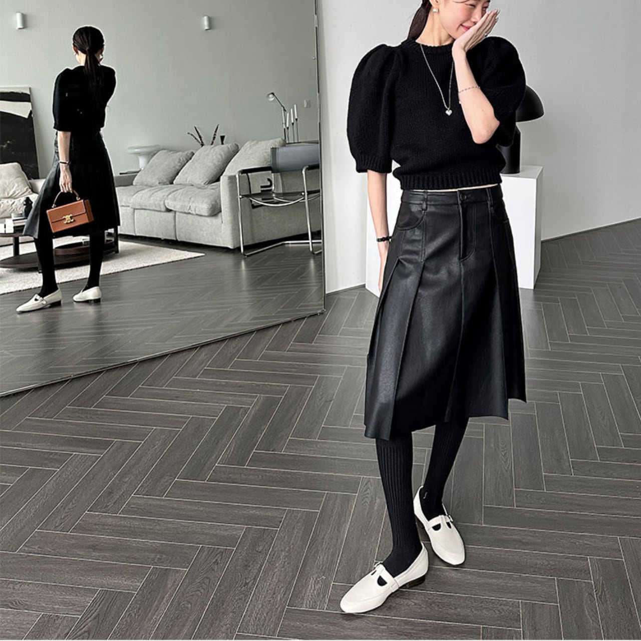 「一枚で“きちんと映え”」。直線タックで細見え、マットなエコレザーで高見え。