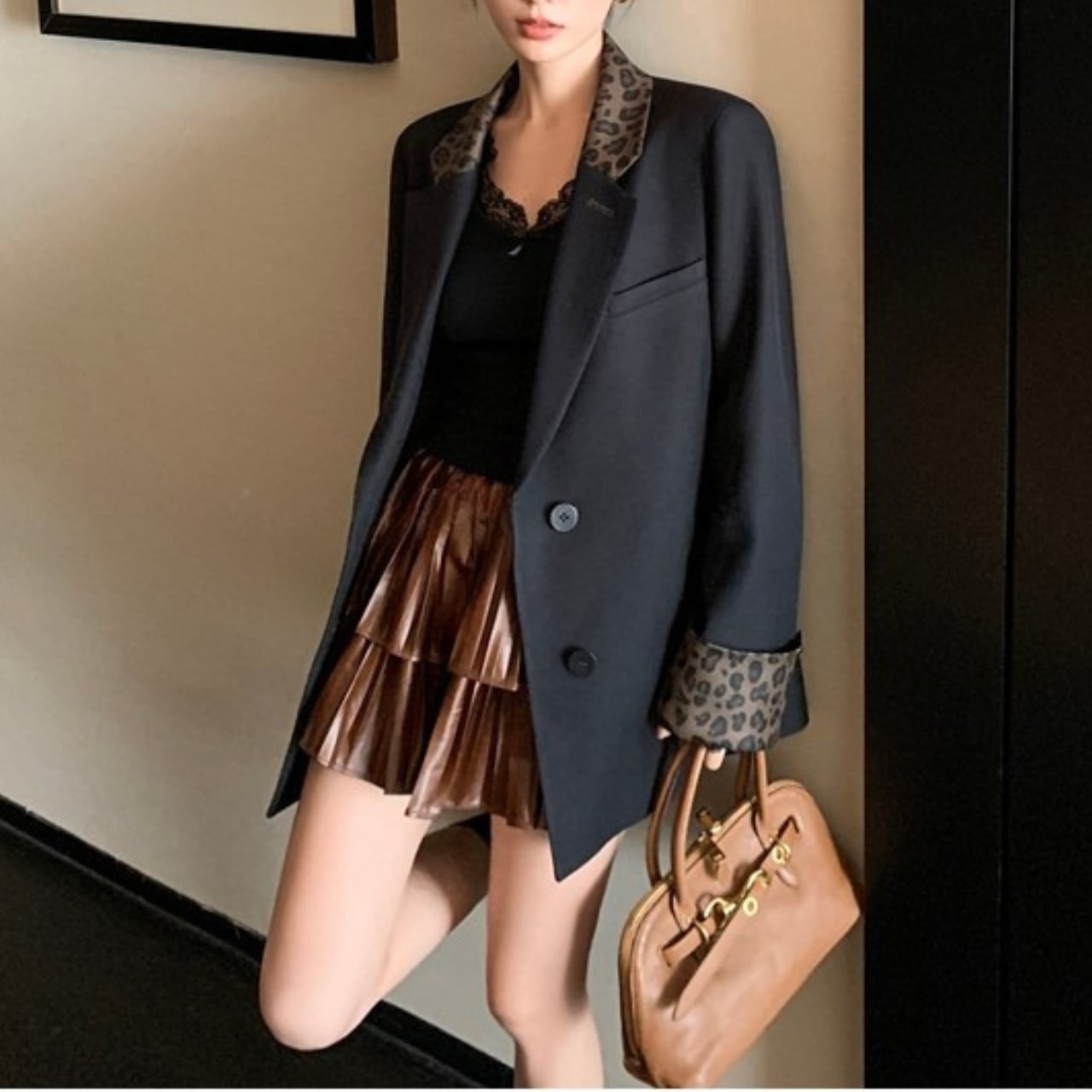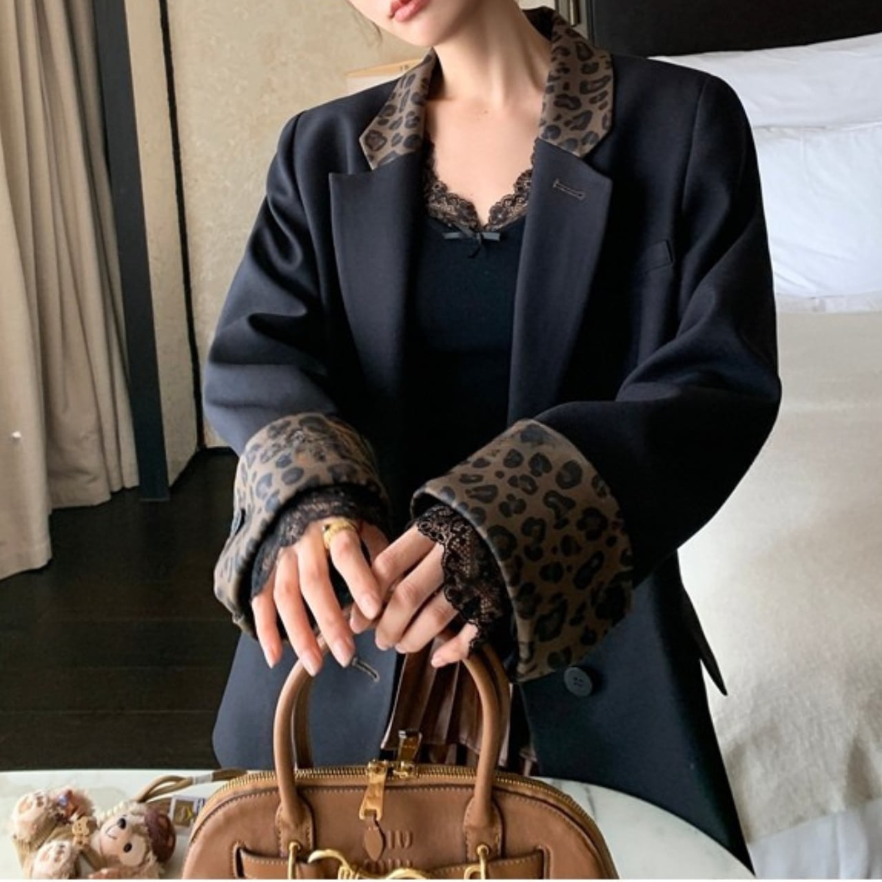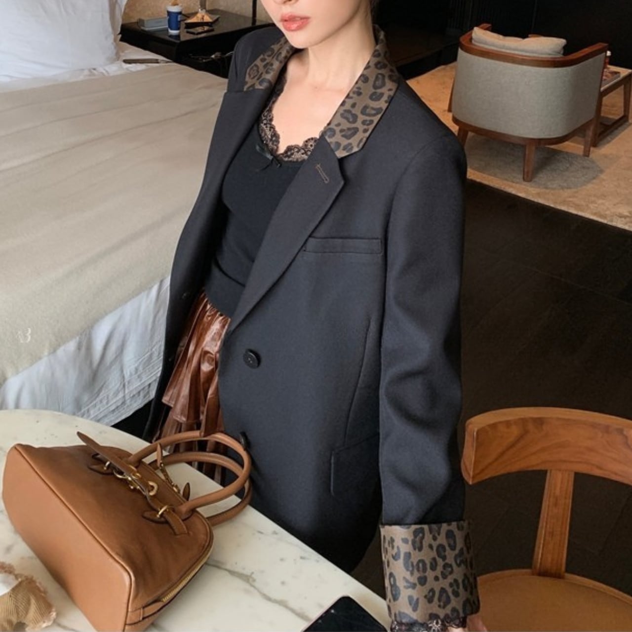 クラシックなブラックブレザーに、衿と袖口だけ大胆にレオパードを効かせた主役級ジャケット。ボクシーなオーバーシルエットで今っぽい抜け感を出しつつ、身頃は無地なので品よく着られます。袖を少しまくれば、柄がリズミカルにのぞいてコーデが一気にランクアップ。Tシャツ&デニムに羽織るだけでこなれ見え、きれいめワンピのハズしにも◎。