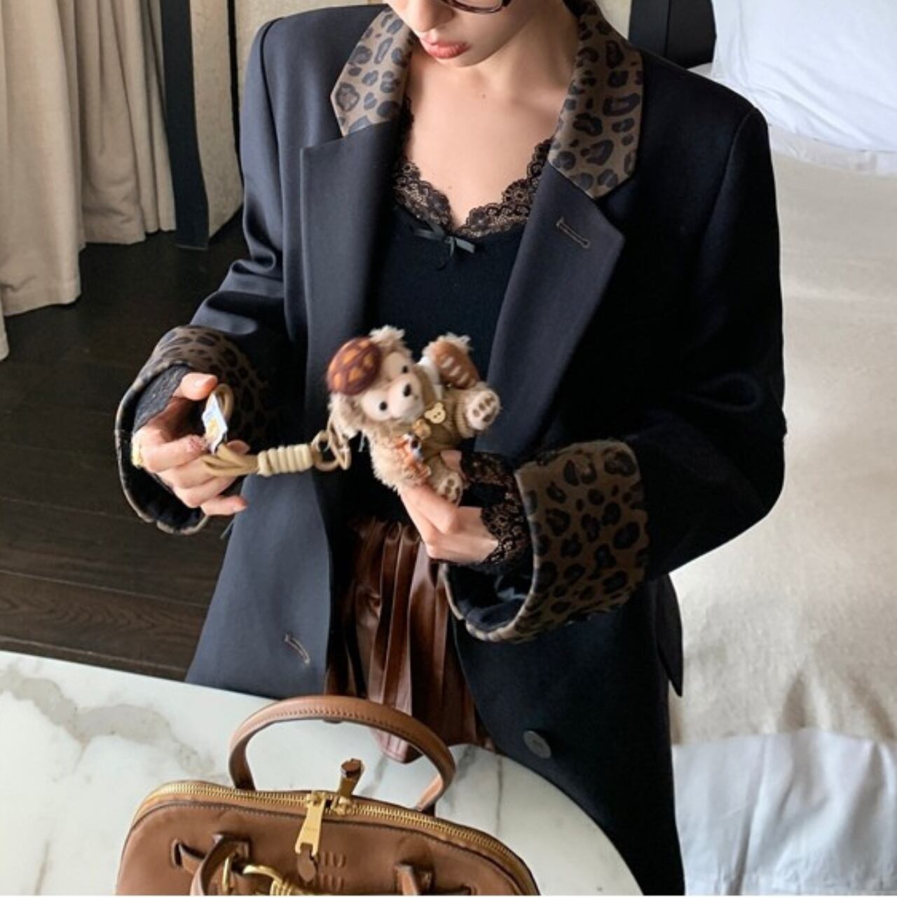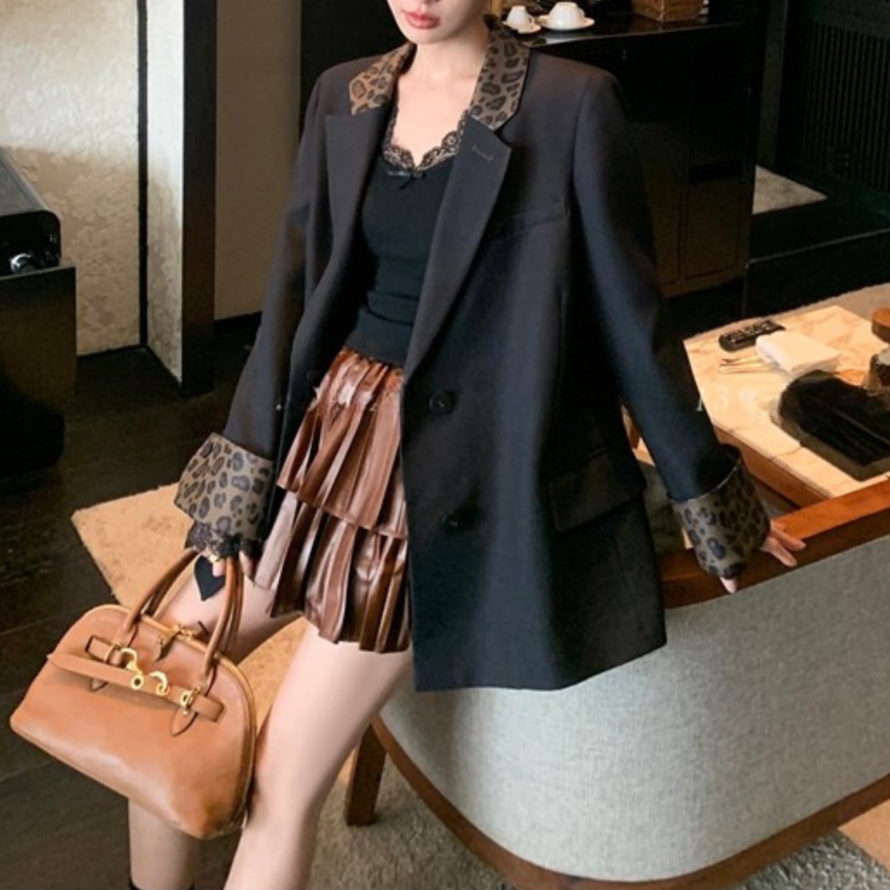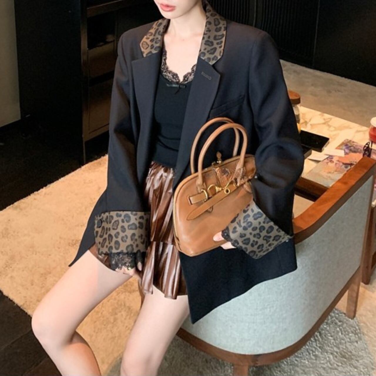 クラシックなブラックブレザーに、衿と袖口だけ大胆にレオパードを効かせた主役級ジャケット。ボクシーなオーバーシルエットで今っぽい抜け感を出しつつ、身頃は無地なので品よく着られます。袖を少しまくれば、柄がリズミカルにのぞいてコーデが一気にランクアップ。Tシャツ&デニムに羽織るだけでこなれ見え、きれいめワンピのハズしにも◎。
