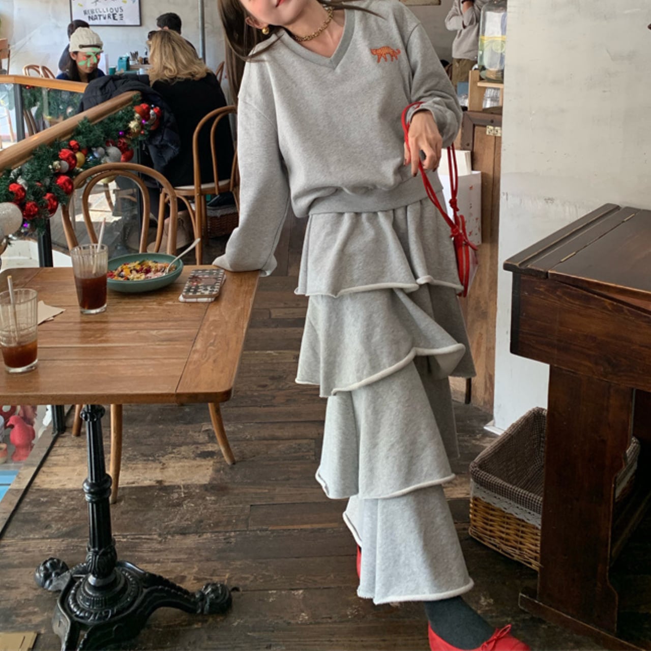 **“アスレジャー×レディ”**のミックスが継続注目。スポーティなスウェットに、女性らしいティアードを重ねる今季ど真ん中のバランス。
