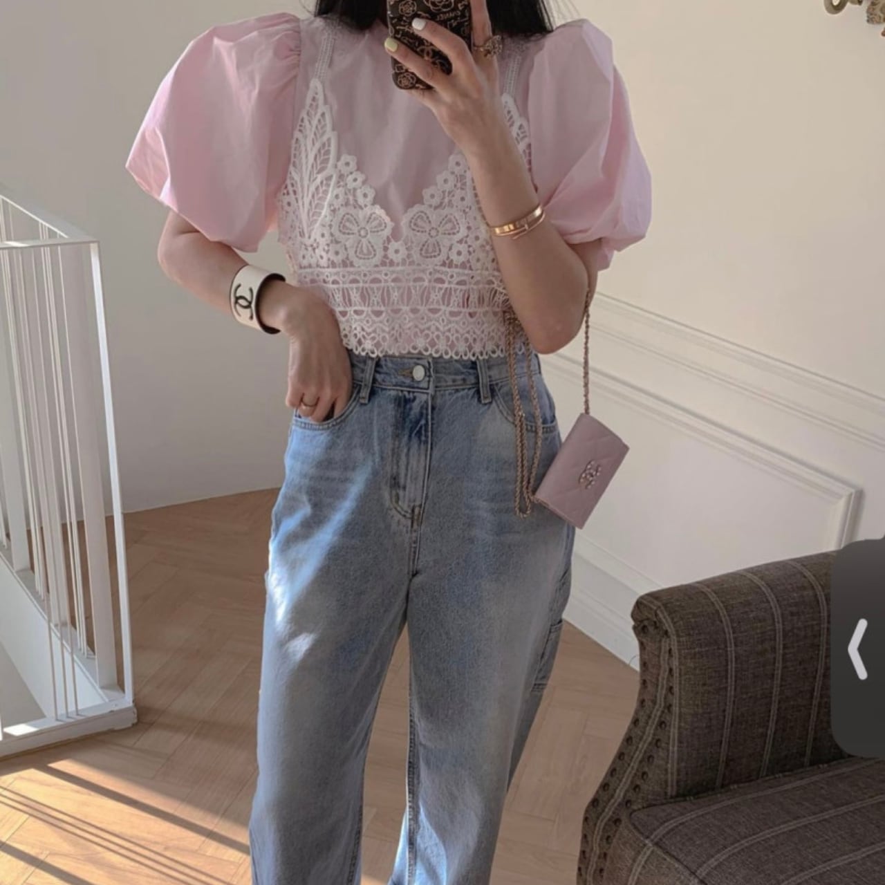 袖フリル&シャーリングで華やかな印象