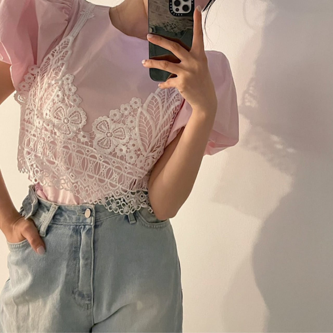 袖口のシャーリングや立体感のあるフリルが、華やかさと上品さを演出します。