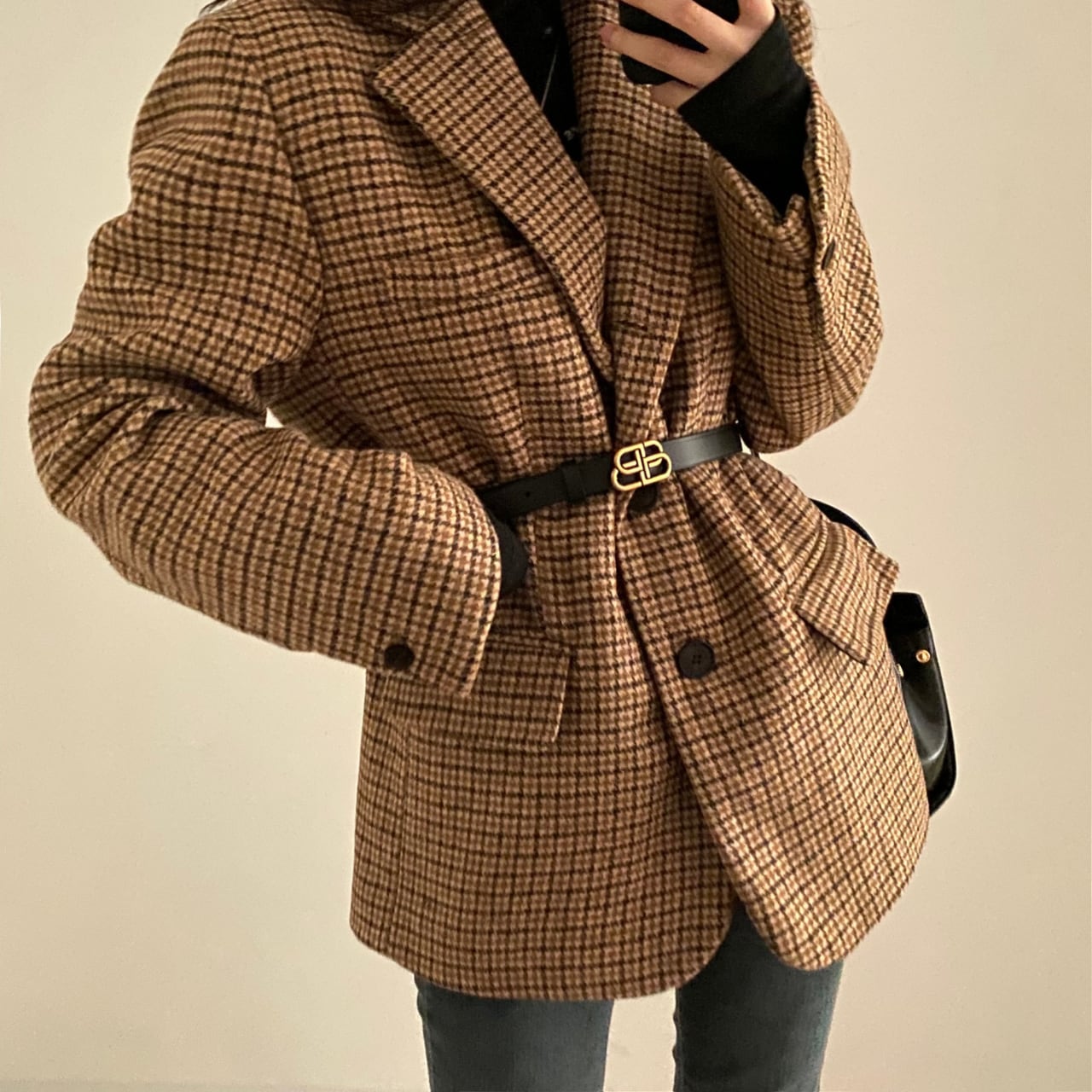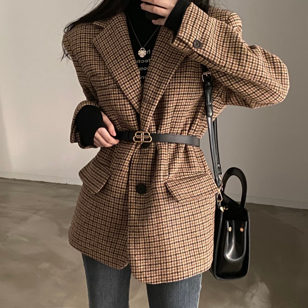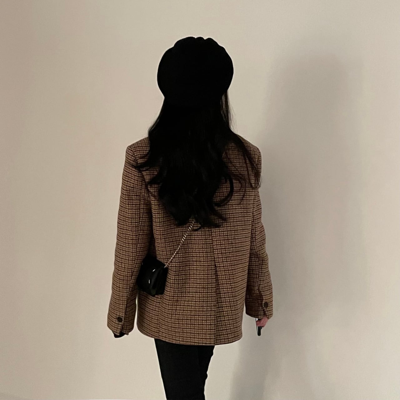 さっと羽織るだけでコーデの主役になるチェックジャケット。程よい厚みの生地に肩パッドを忍ばせ、肩のラインをすっと整えて小顔見え&スタイルアップ。ゆるめの身幅と**ミドル丈(着丈72cm)**で、デニムからワンピースまで幅広くマッチします。フロントはボタン開閉、通勤・きれいめカジュアル・大人ストリートまで、秋から春先まで長く活躍。