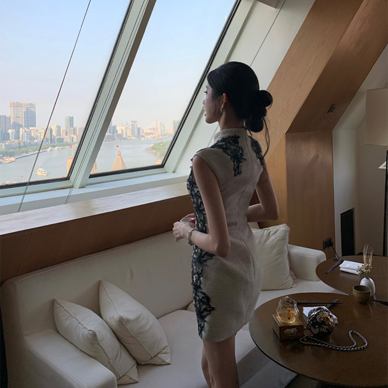スッキリとしたハイネック調のチャイナディテールで上品に。ミニ丈でも大人にまとまります。