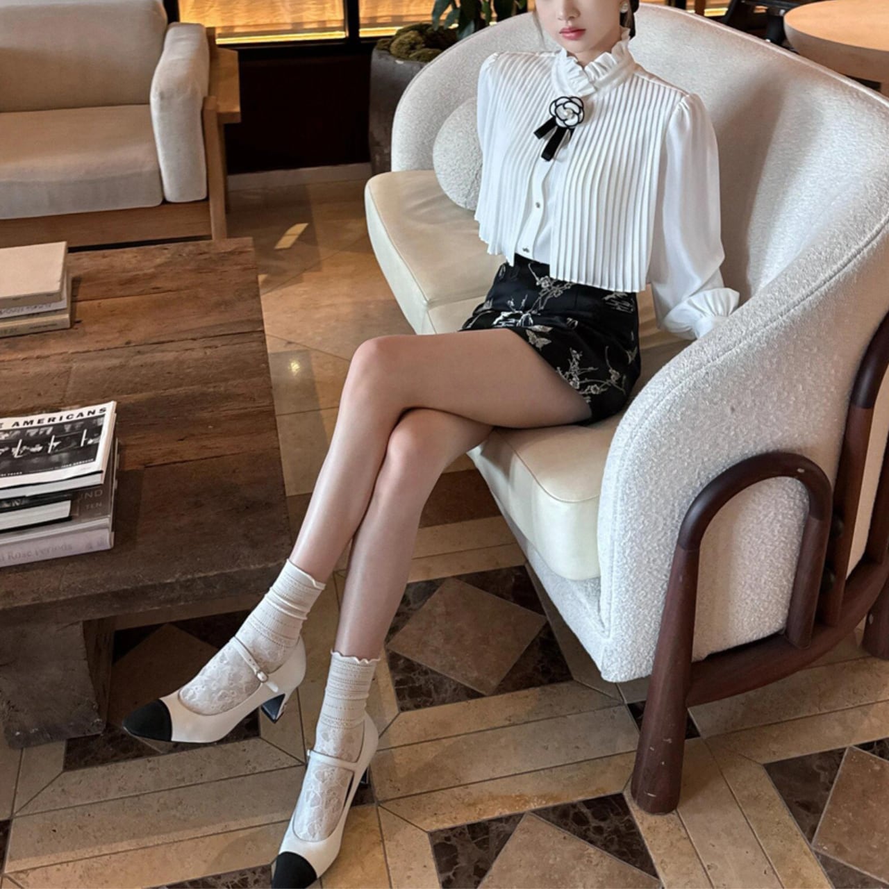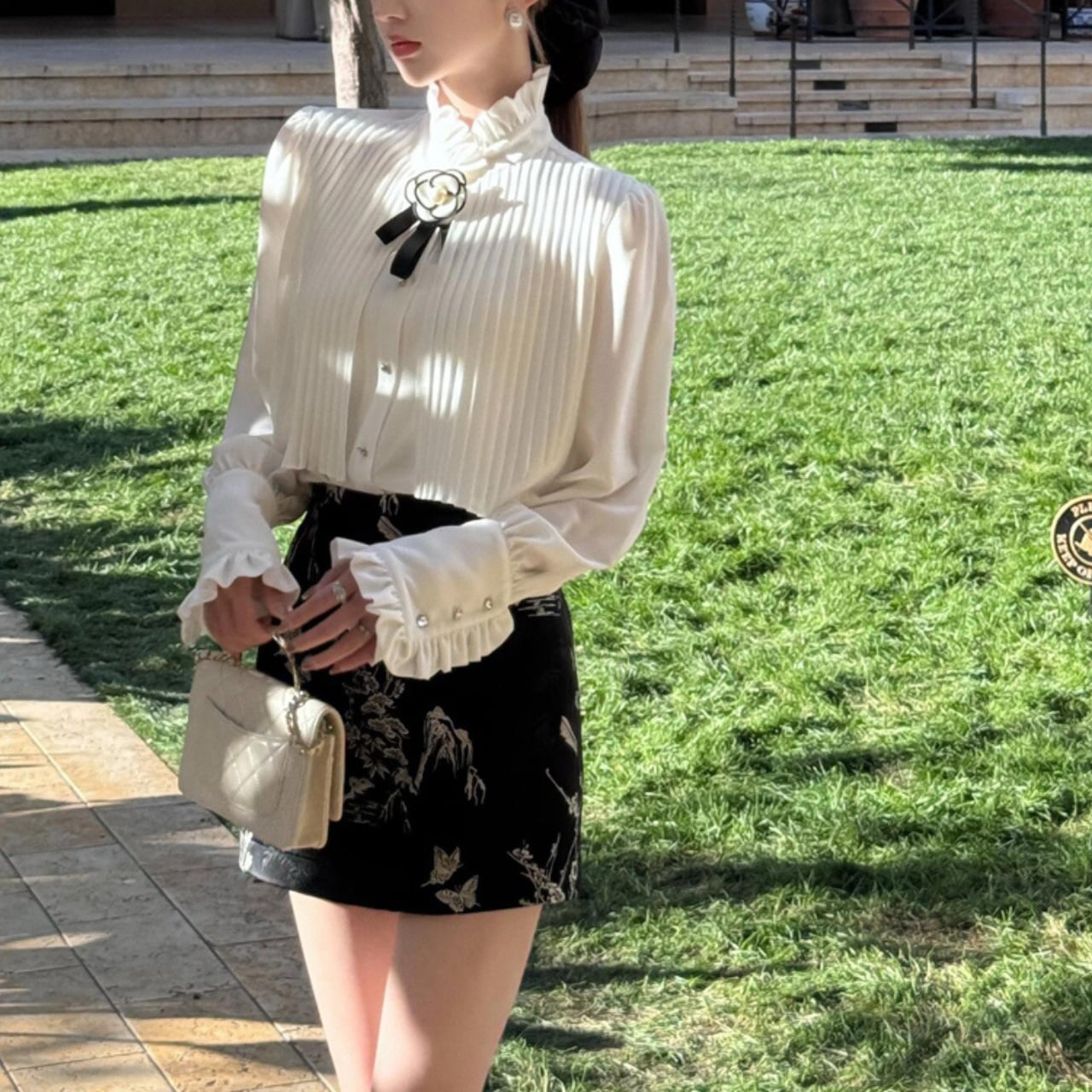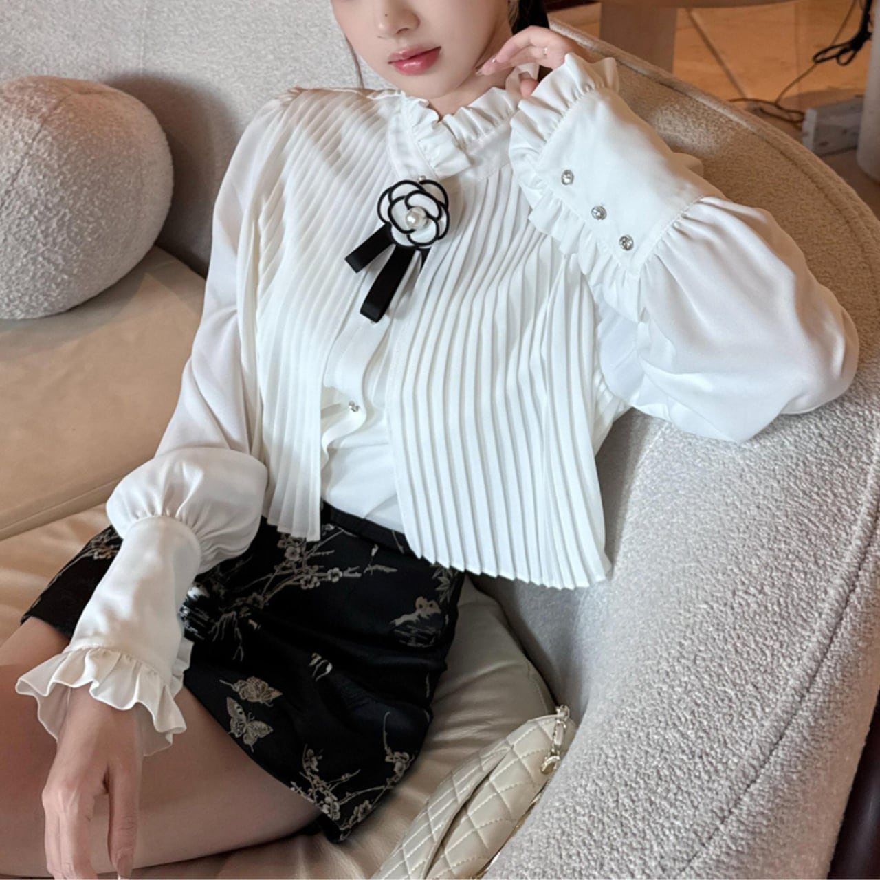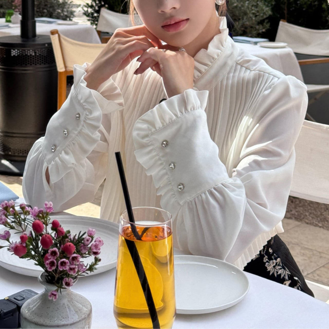 顔まわりを“一瞬で華やか”に。プリーツの品格とフリルの甘さで、通勤もデートも主役級。
