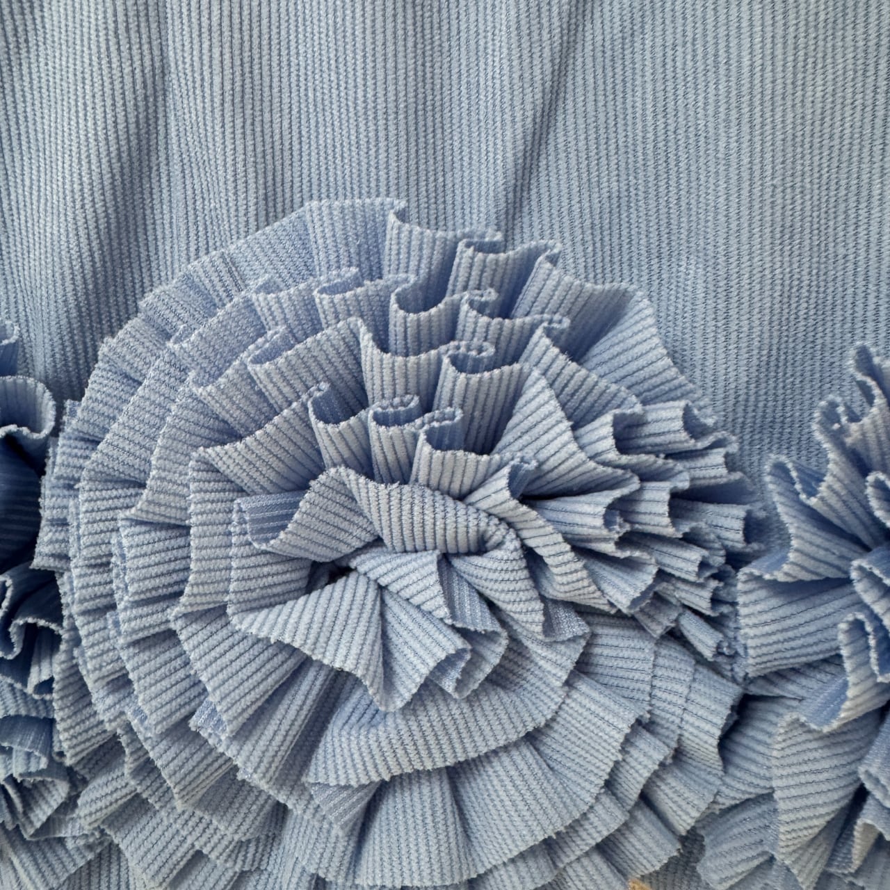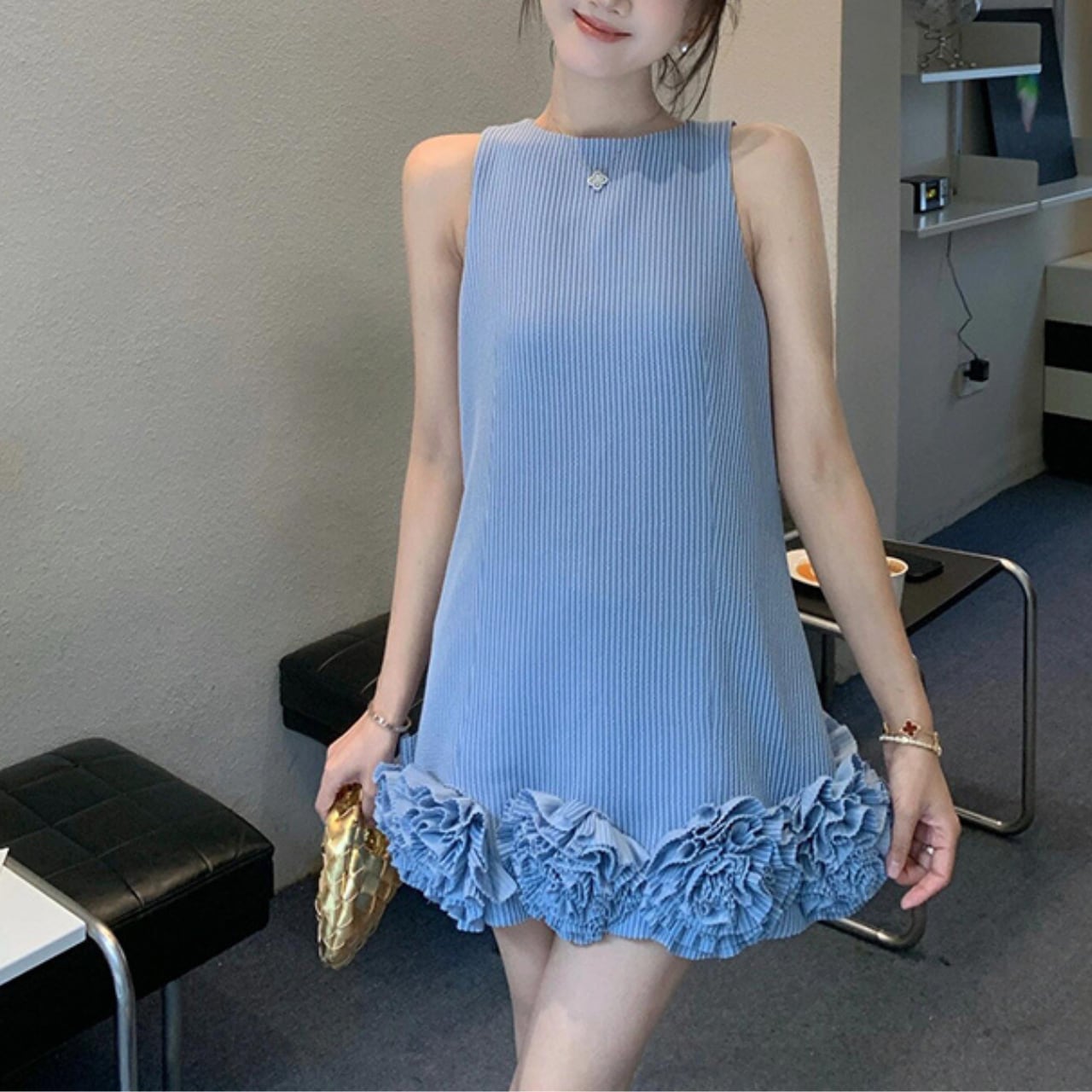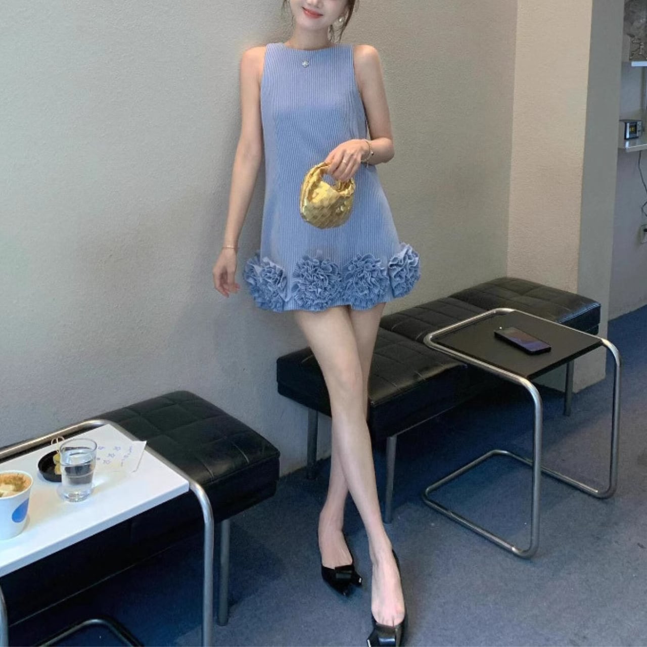・美しいブルーのフラワーノースリーブドレスは、SからLサイズまでご用意しております!裾に施されたお花のディテールが、女性らしさを引き立て、華やかな印象を与えます。カジュアルなお出かけや特別なシーンにもぴったりな一枚です。