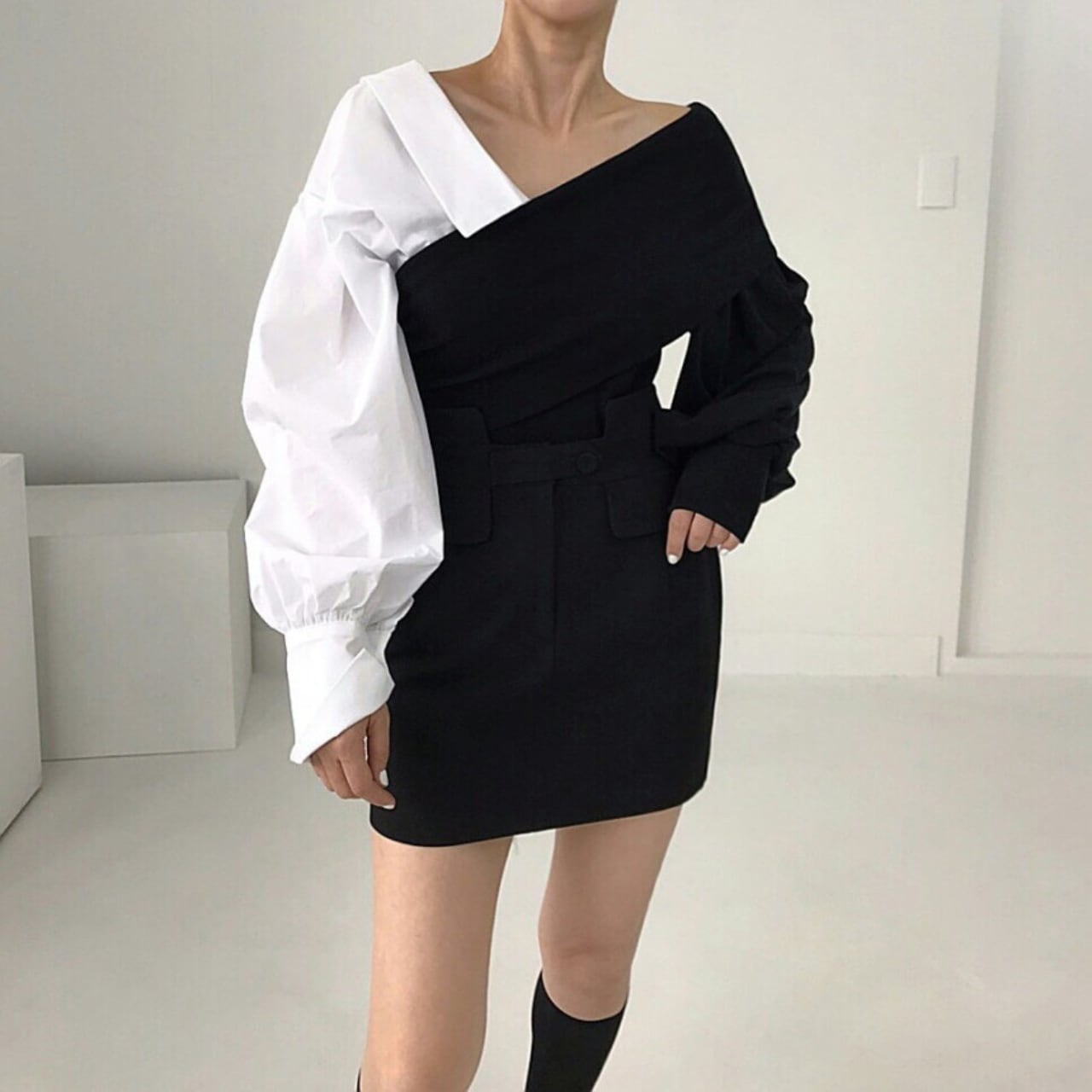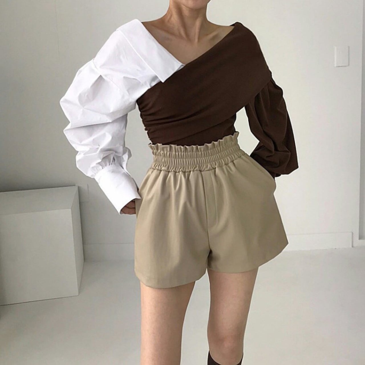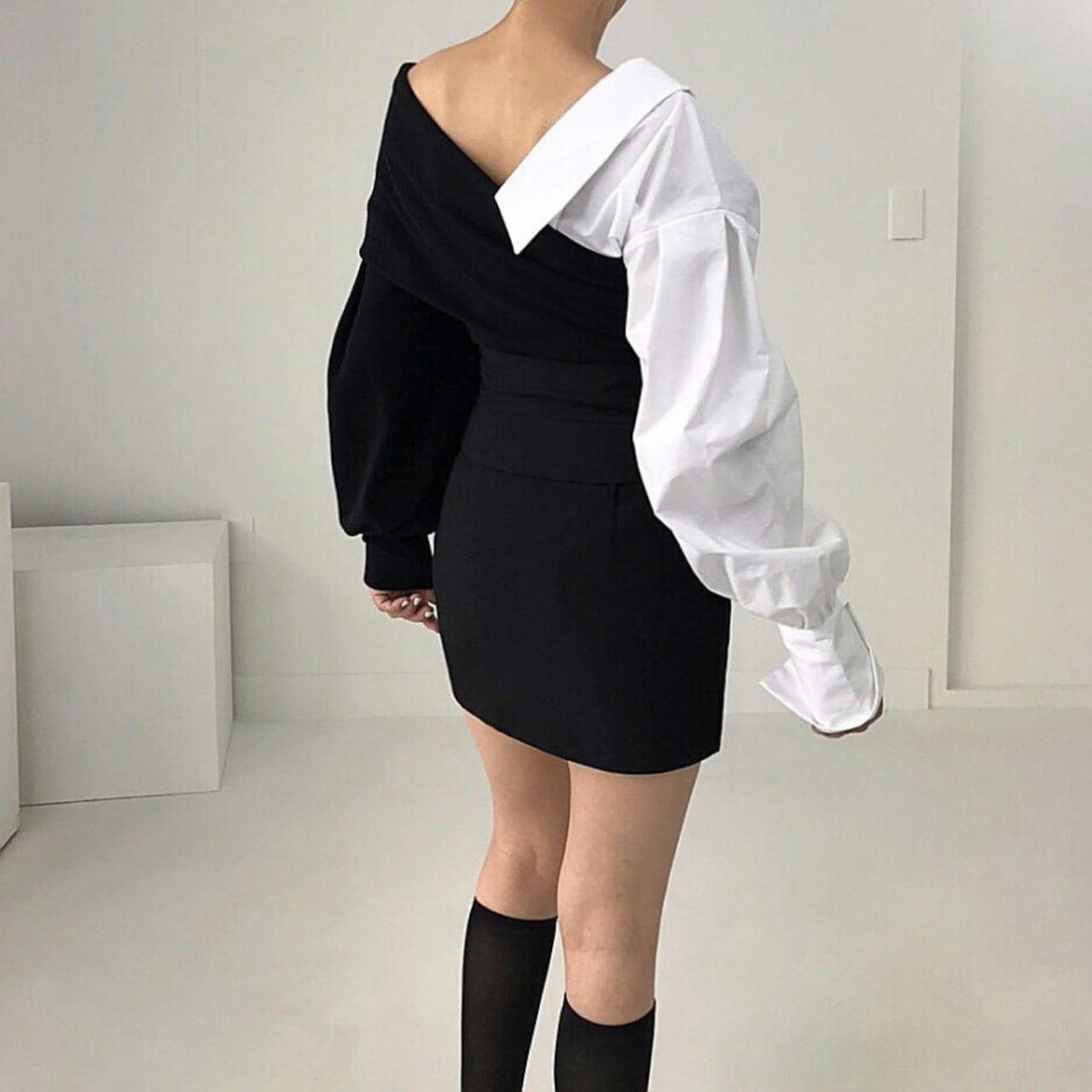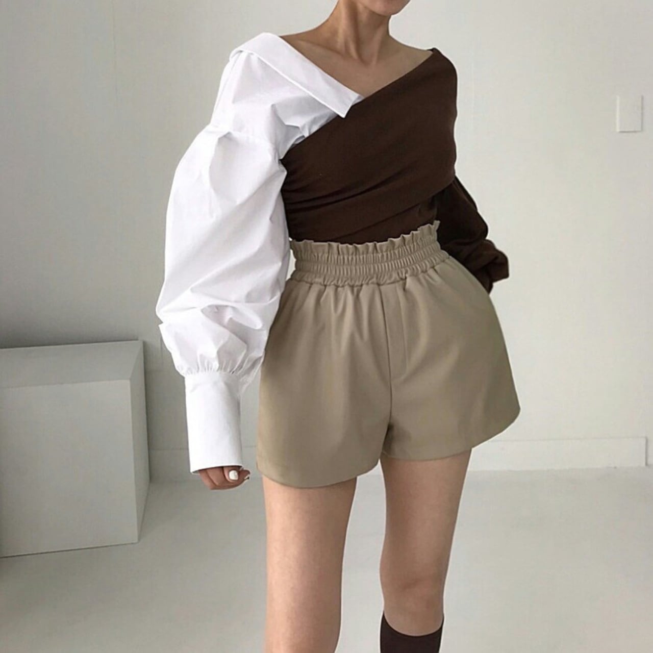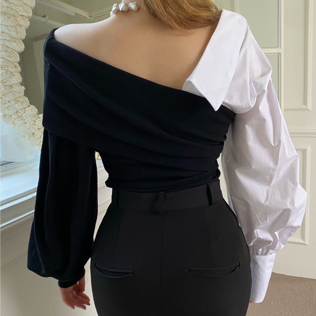 右左で表情が変わるアシンメトリーデザイン(片側シャツ袖/片側ニット袖)