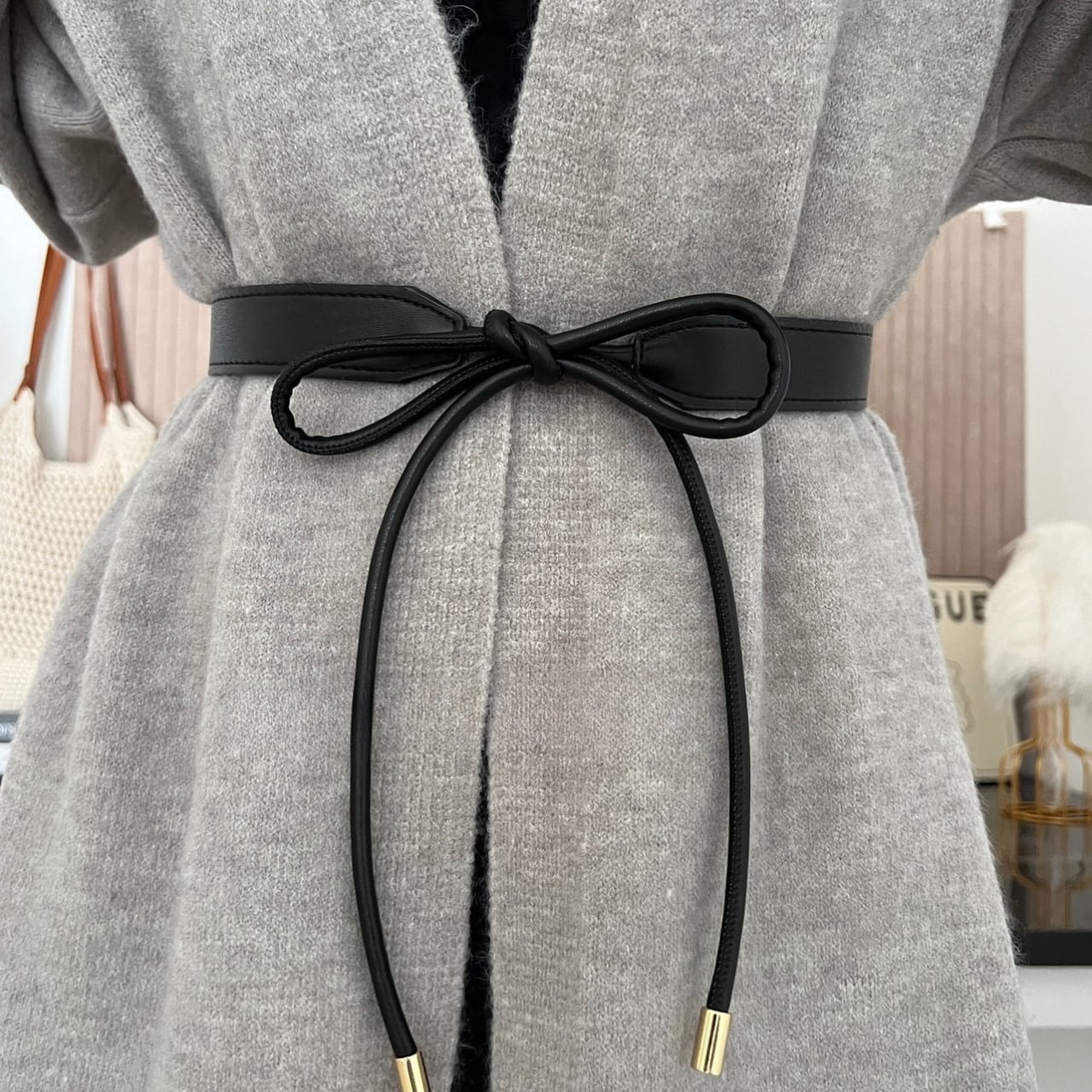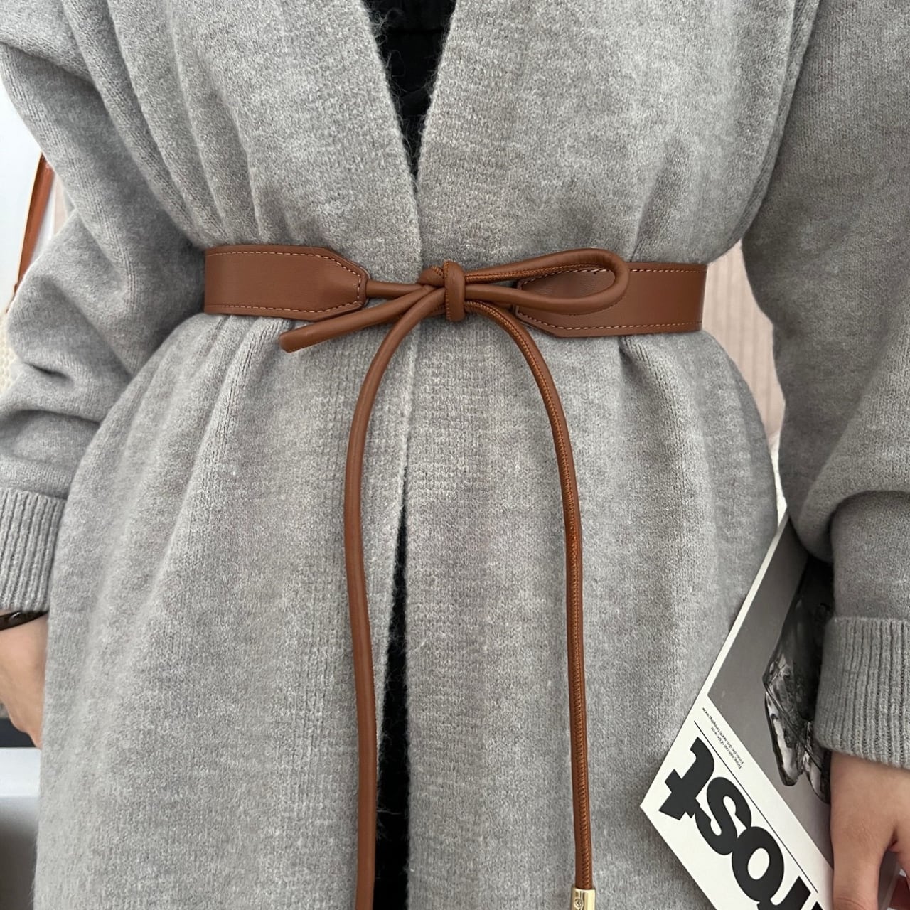 ・オーバーサイズニットの上から結んで、トレンドの“バランスアップコーデ”に。