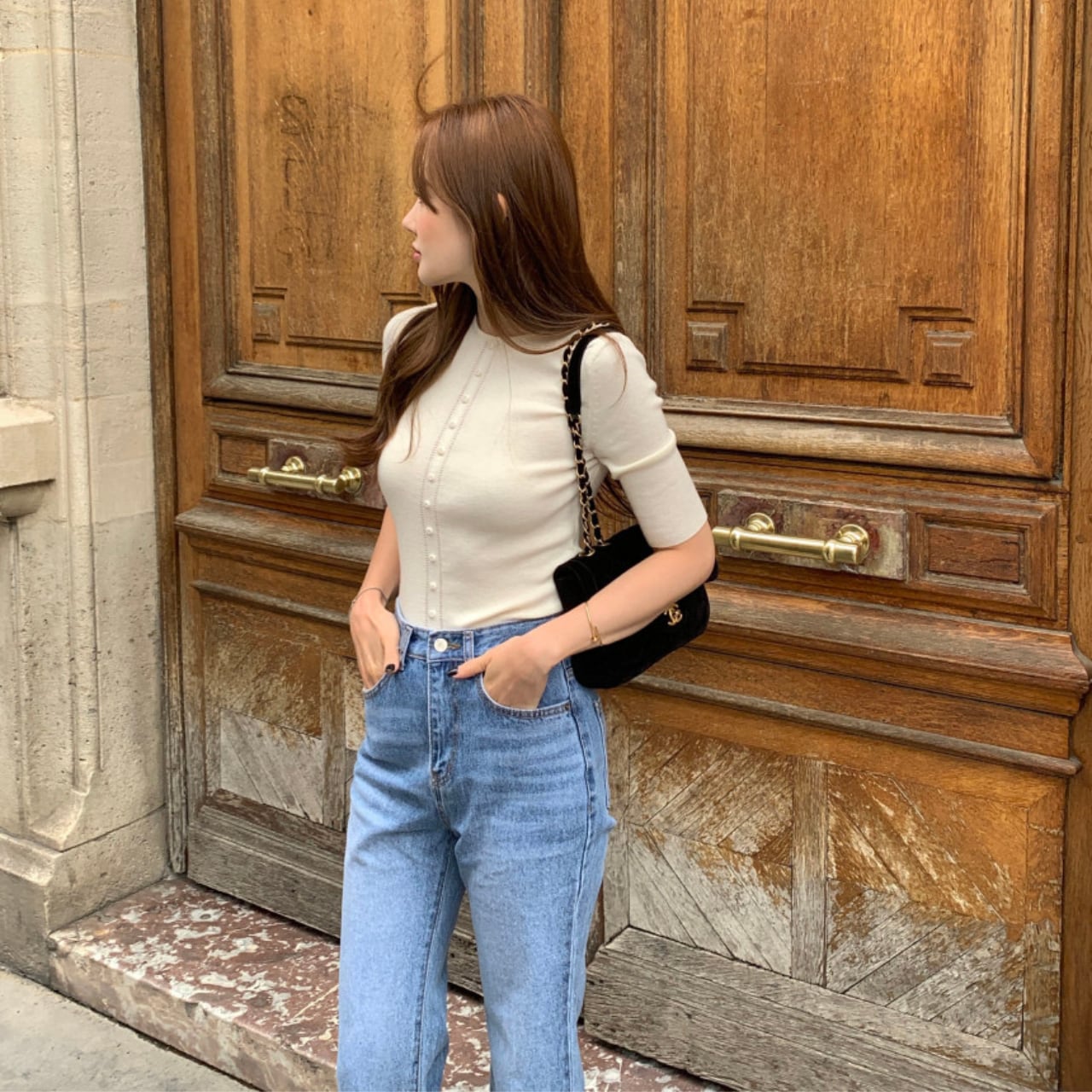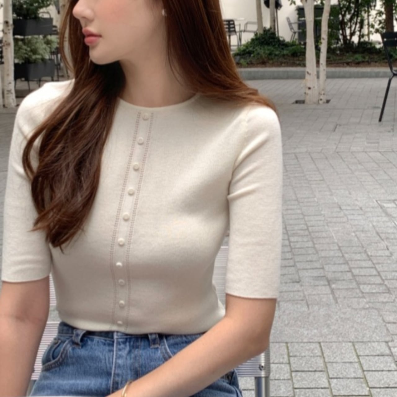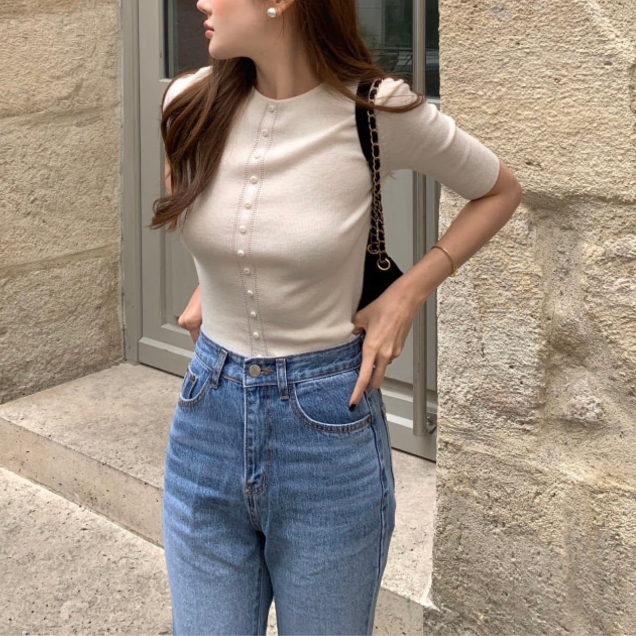フロントに並ぶパール風ボタンと繊細な縦ラインステッチが、