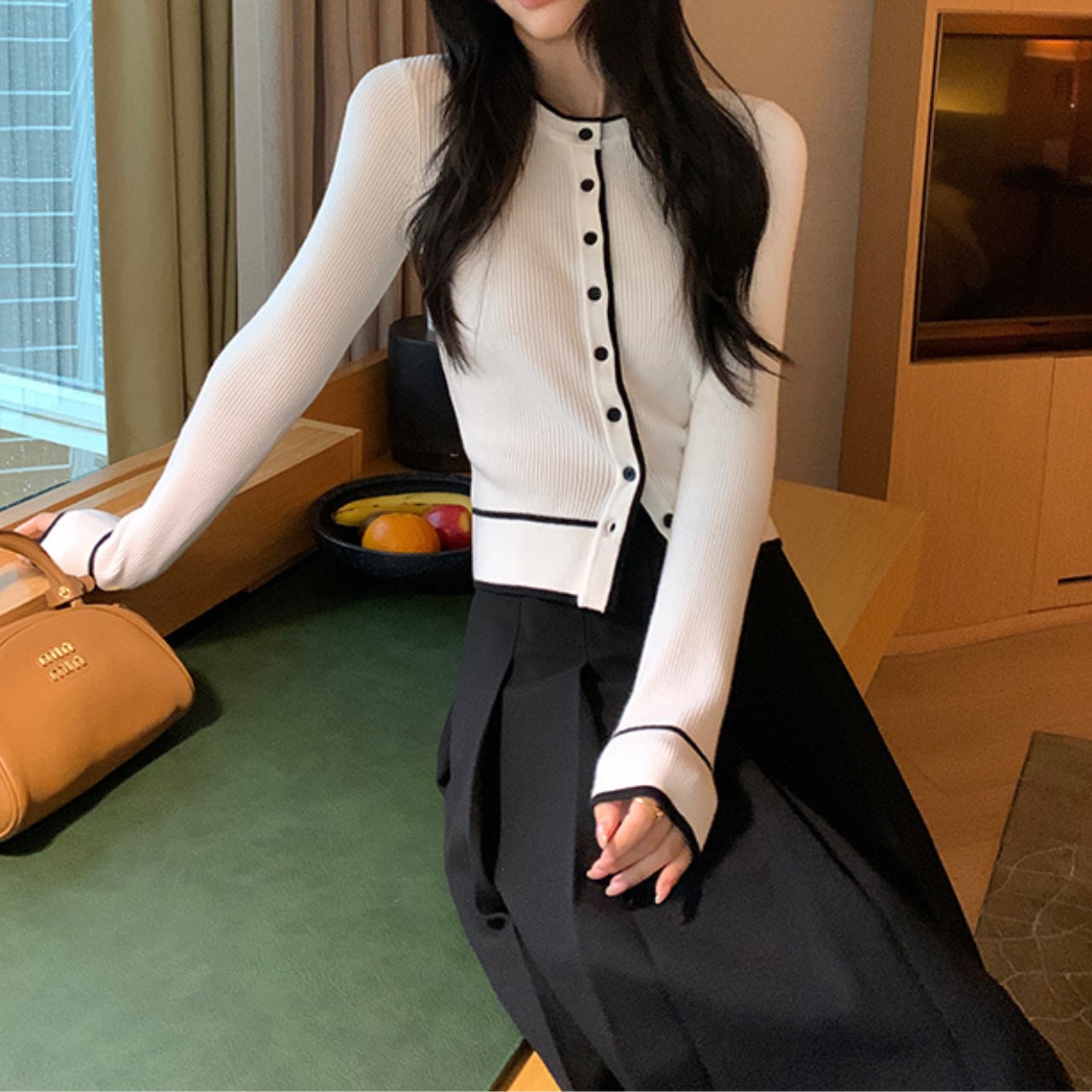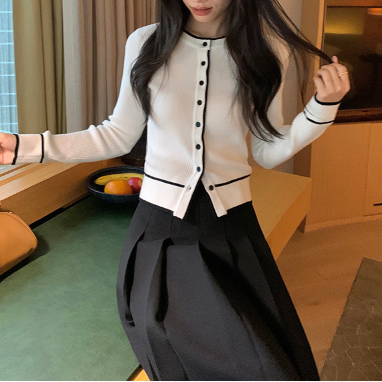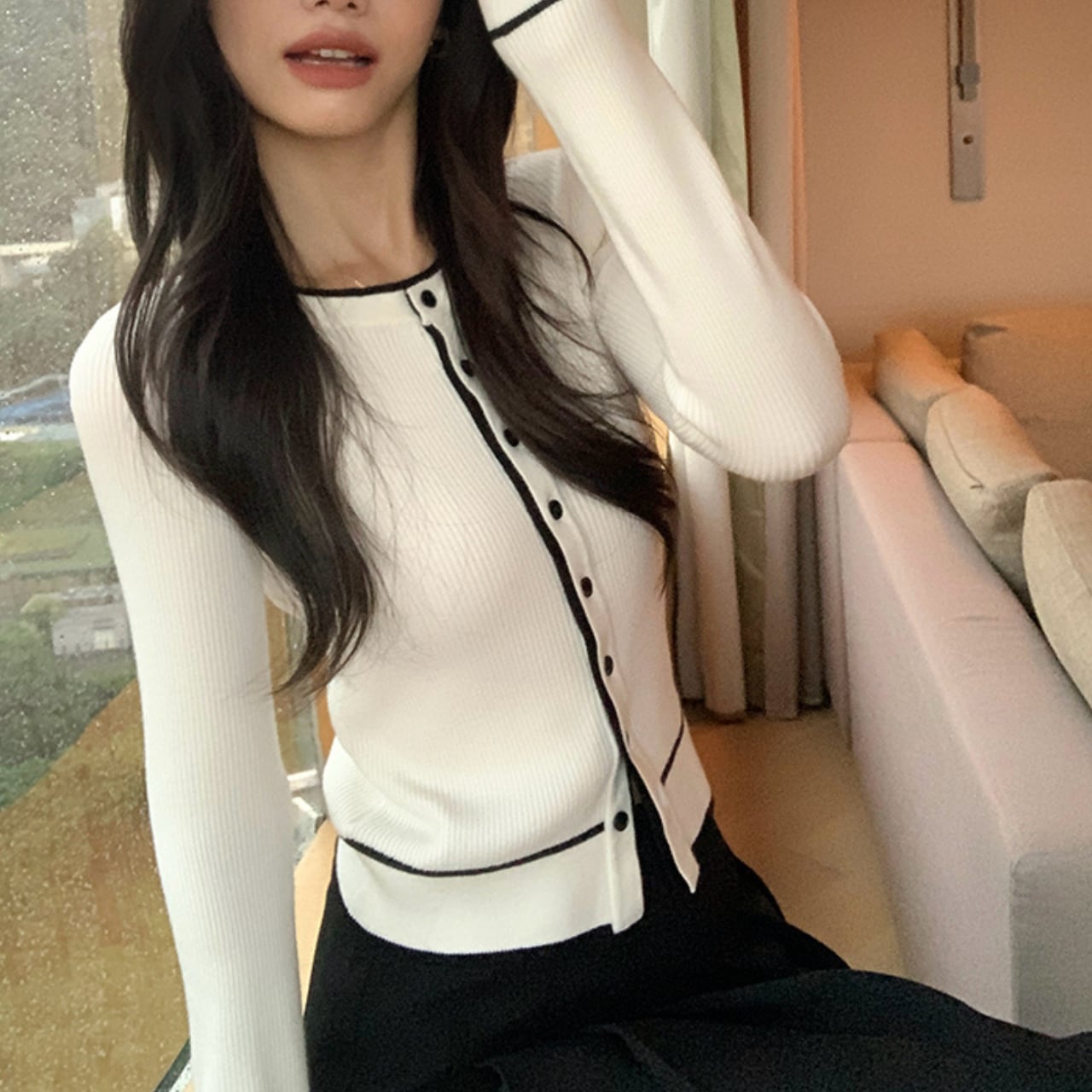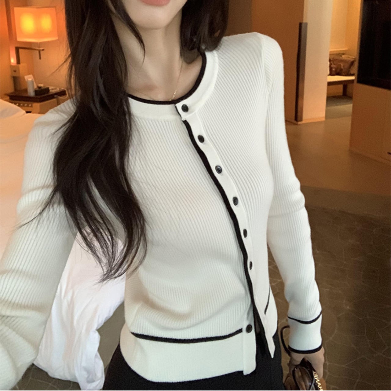 “ホワイト×ブラック”のシャープで洗練された配色が、着るだけでスタイルを整えてくれるリブニットカーディガンです。