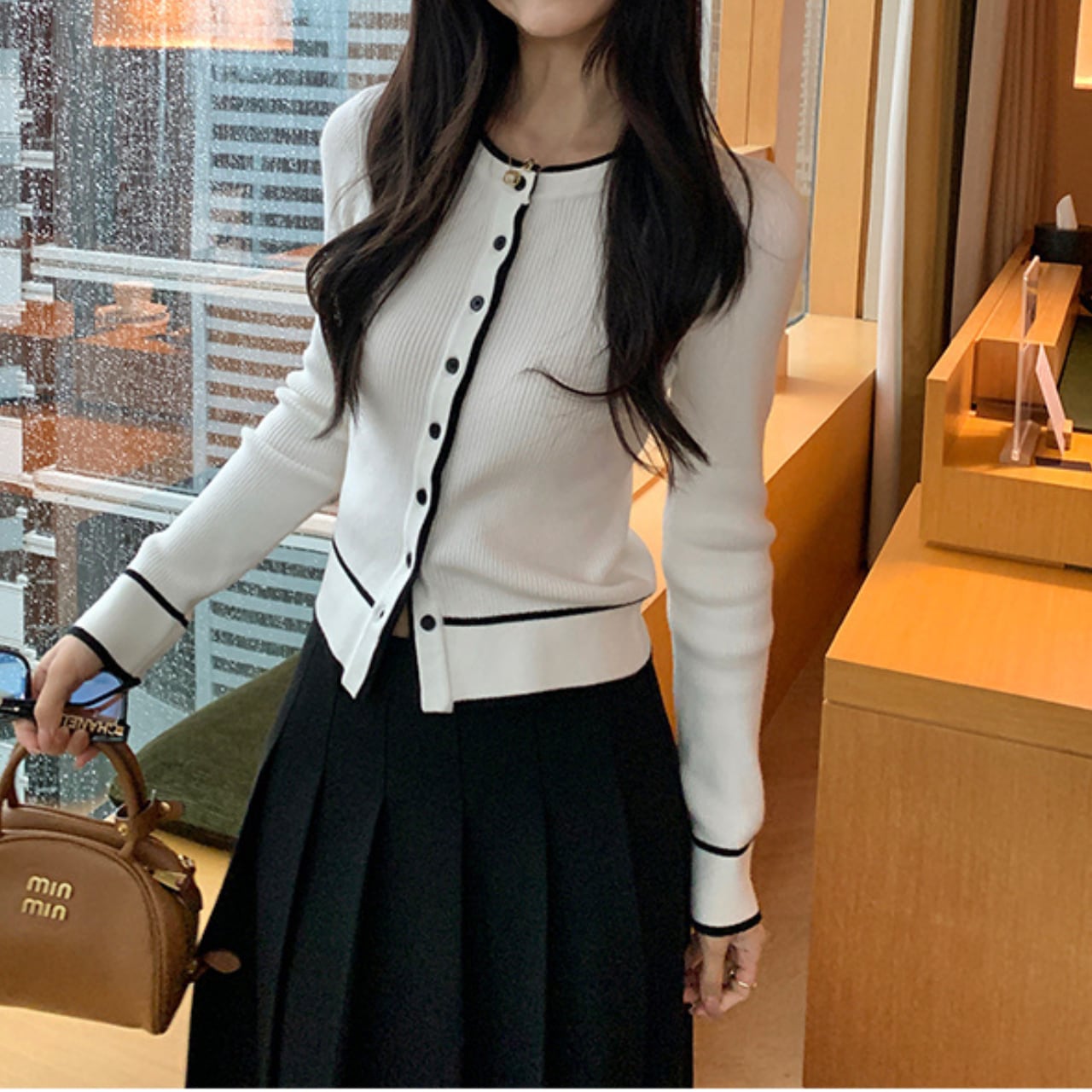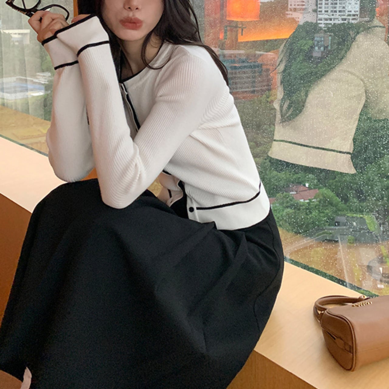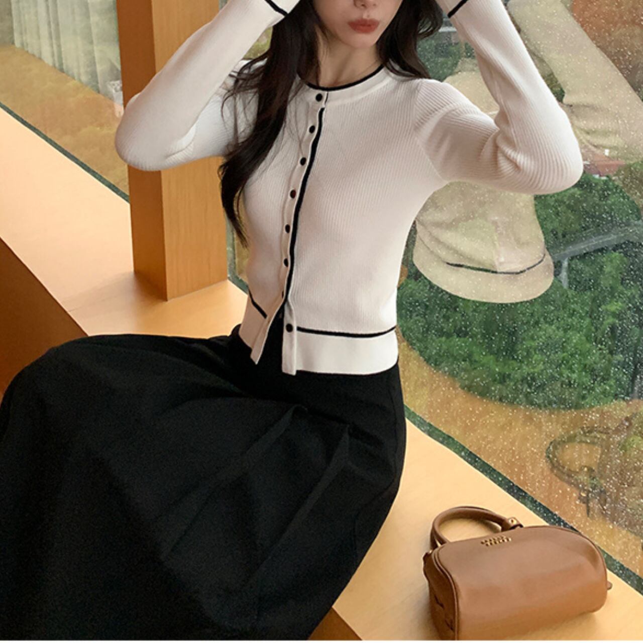 トレンドの“配色アクセント”が顔まわりを華奢に見せ、きれいめなのにどこか可愛い雰囲気をつくってくれます。