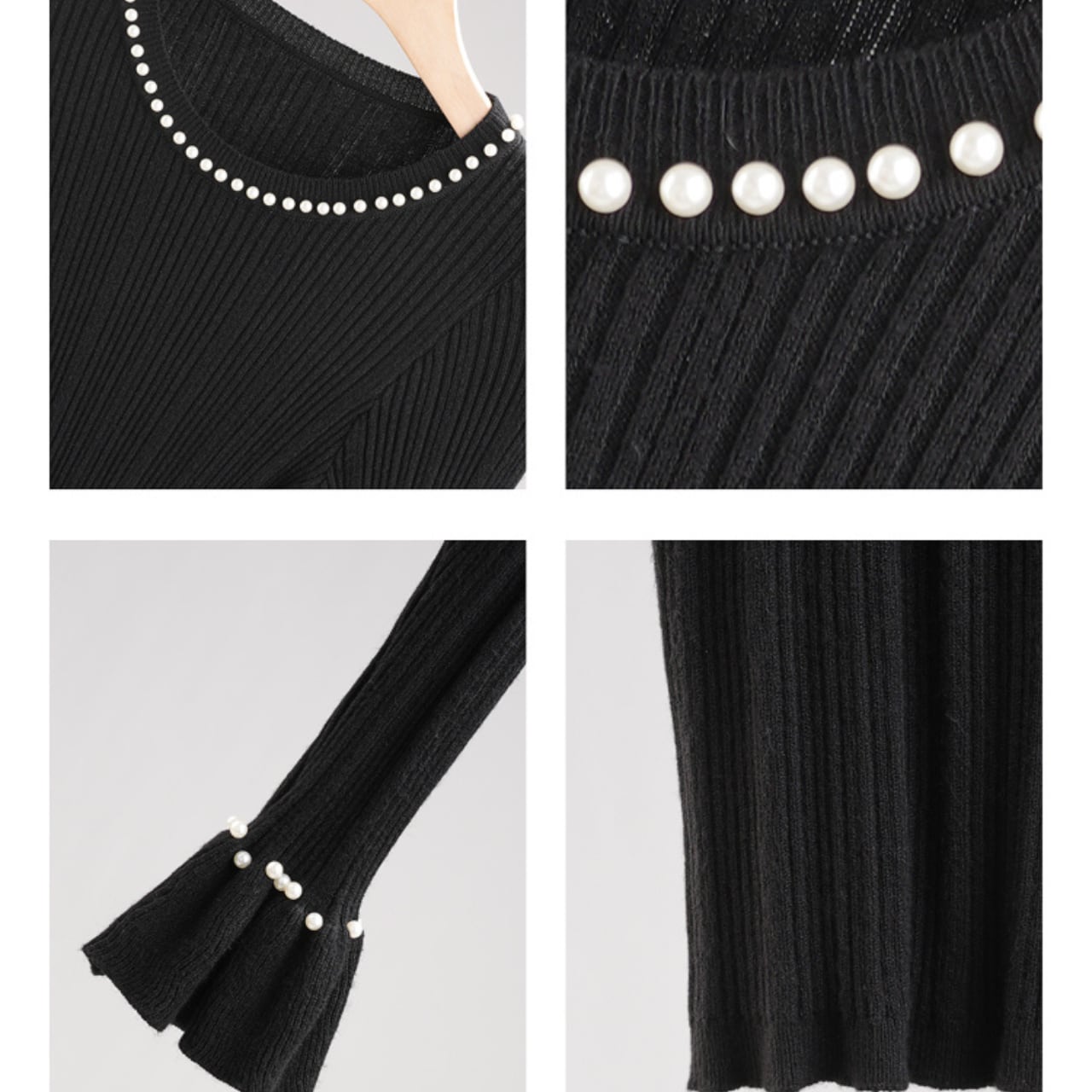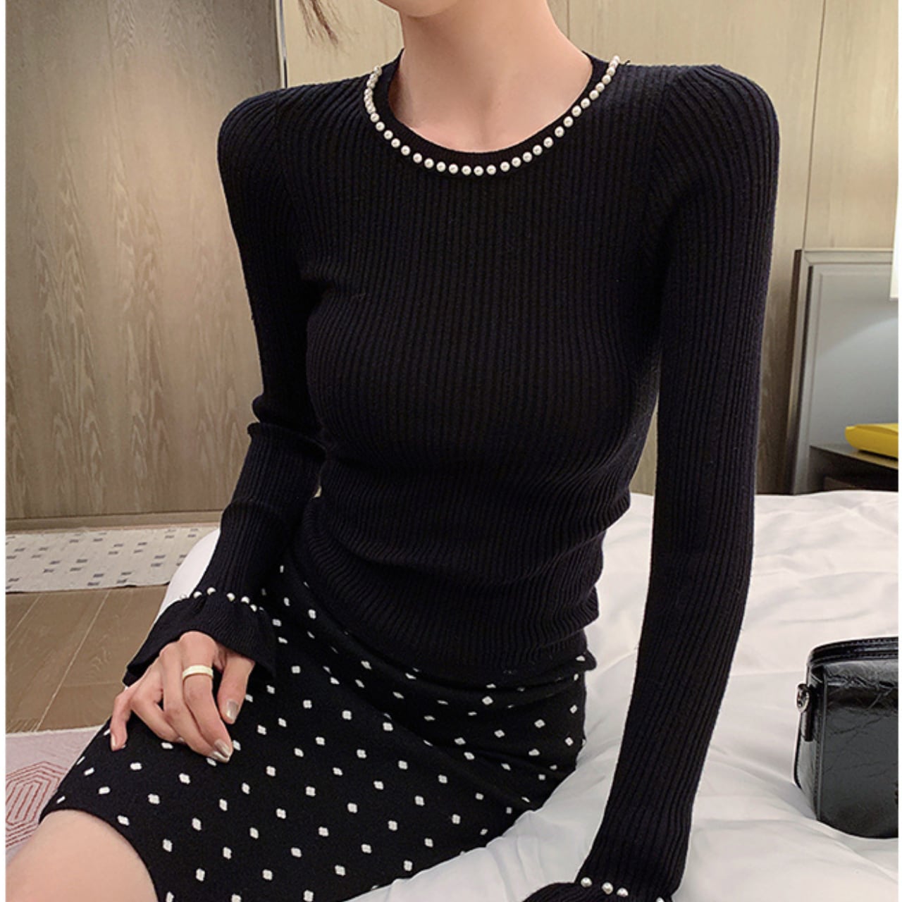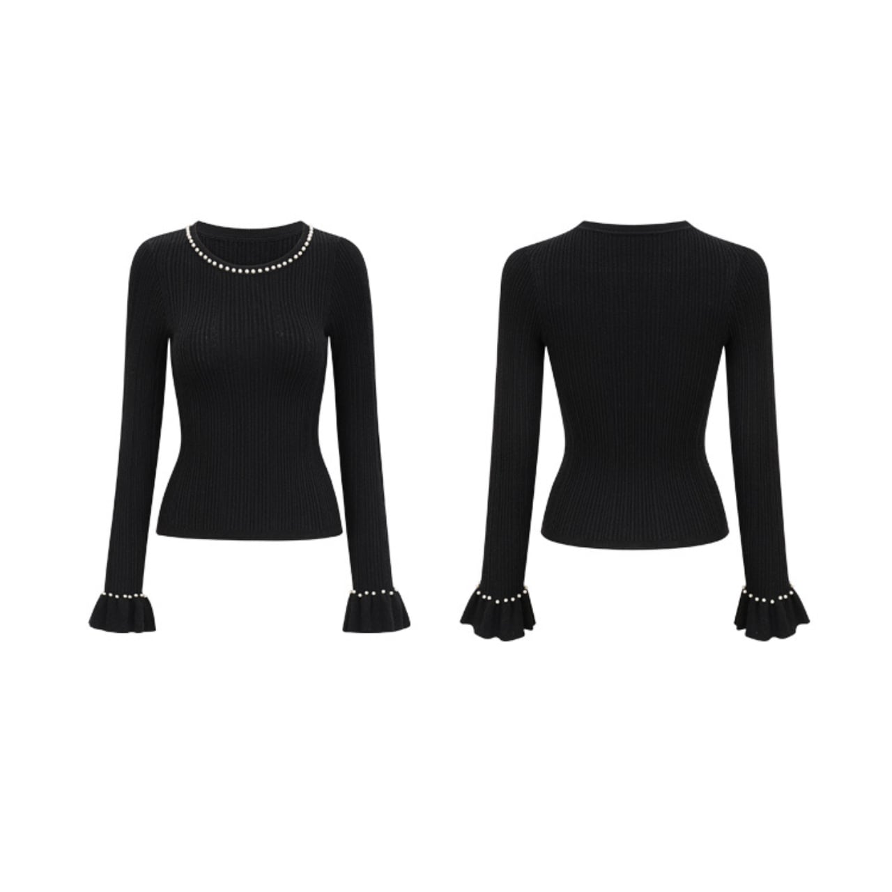ネックラインと袖口に並んだパールディテールが、光にふわっときらめくエレガントリブニットトップスです。