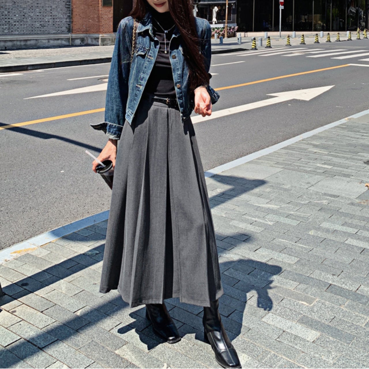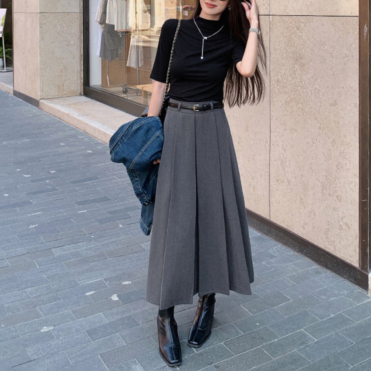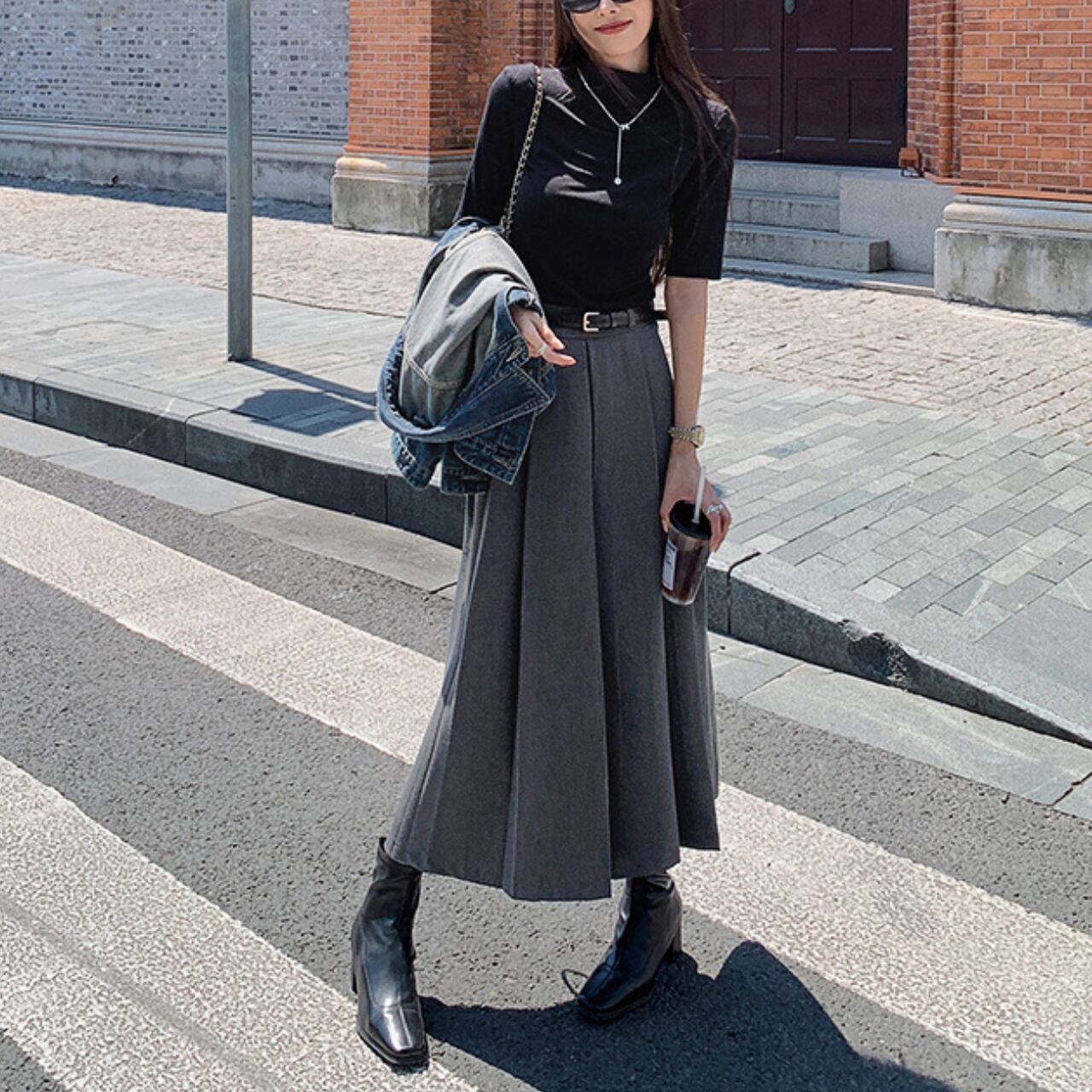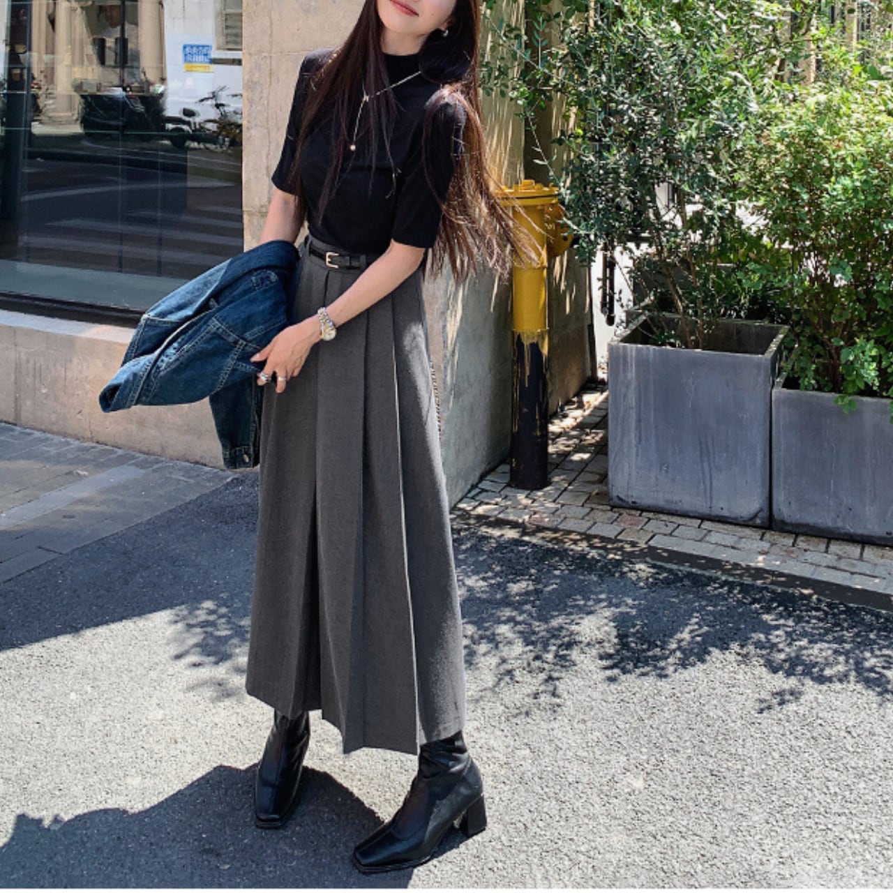 ・黒トップスと合わせて“縦長ライン”を強調