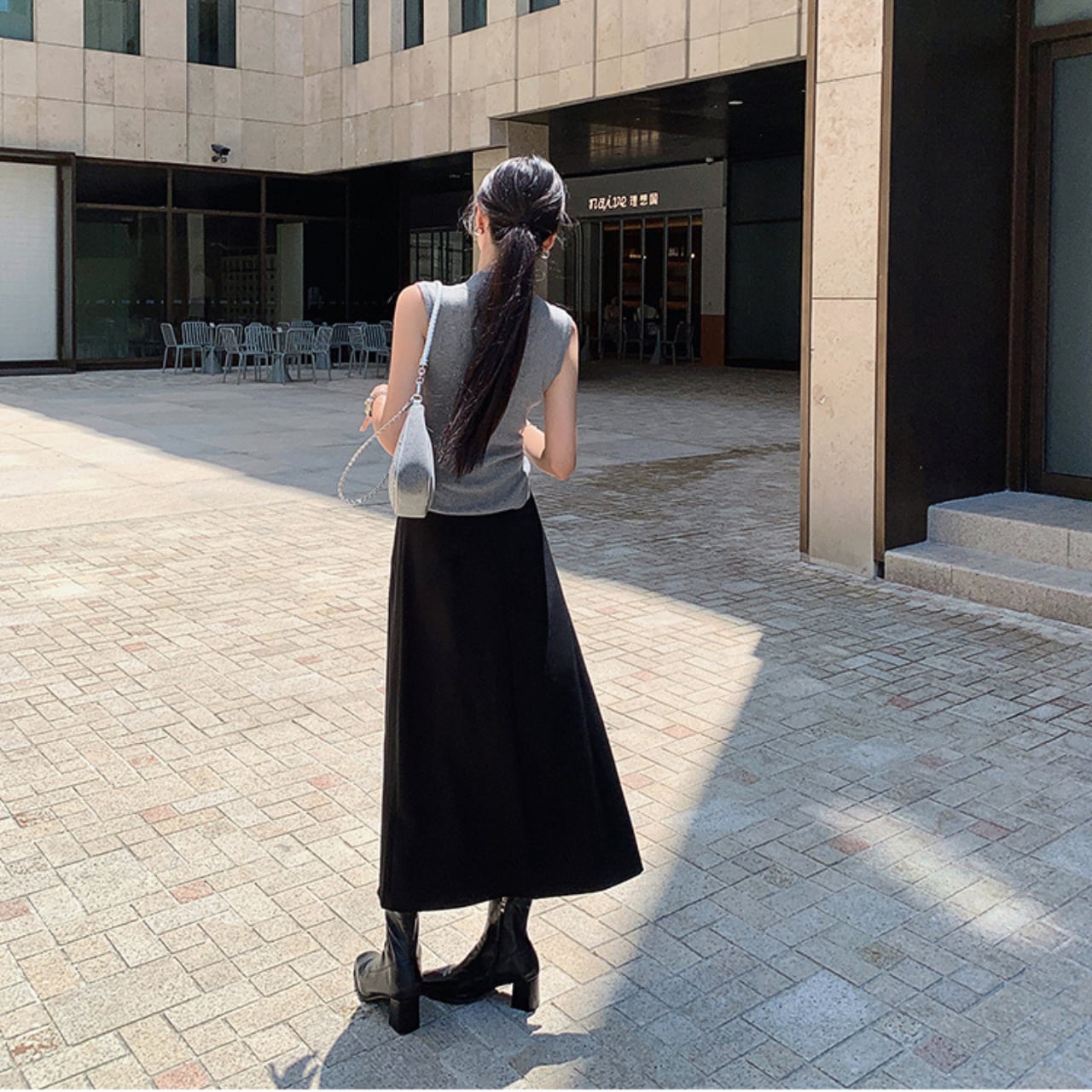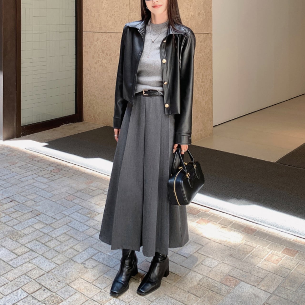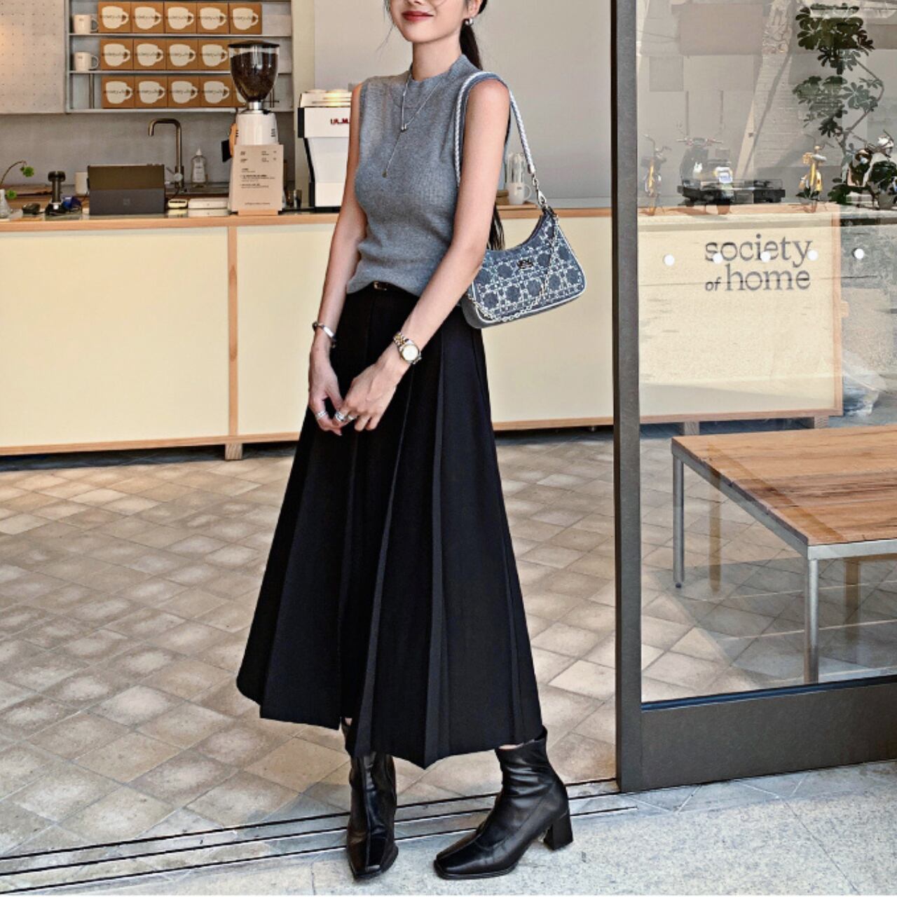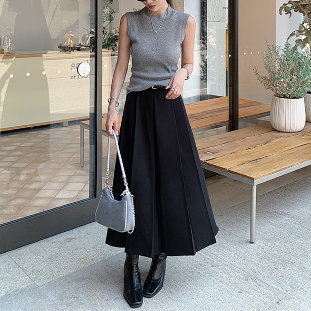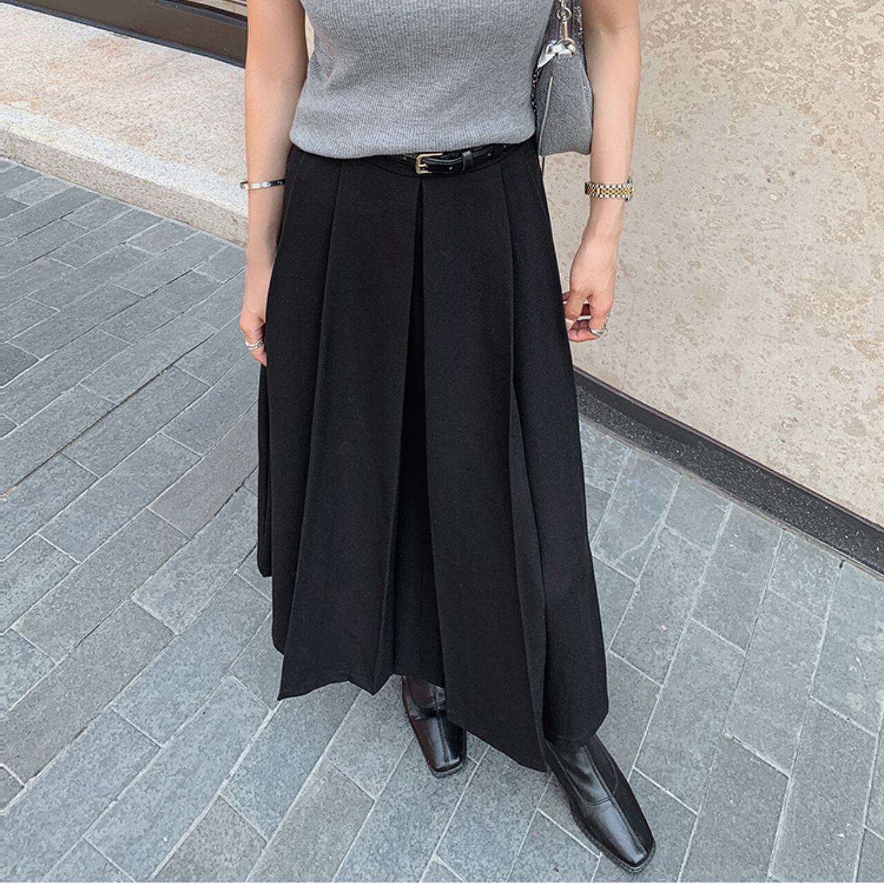 ・黒トップスと合わせて“縦長ライン”を強調