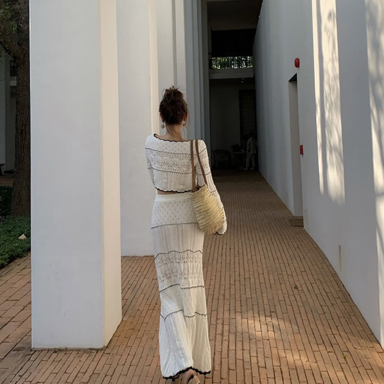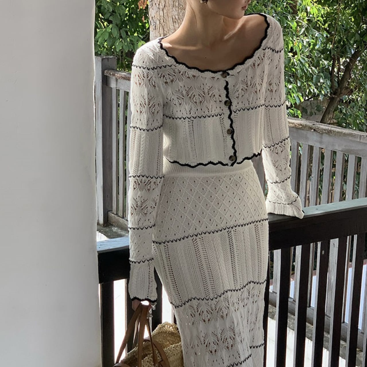 このニットカーディガン ロングスカートセットアップは、透かし編みのデザインが特徴で、季節感を漂わせる一着です。涼しげな素材感で着心地も快適、カーディガンはさらりと羽織れるので、コーディネートの仕上げに最適です。リーズナブルなのに高見えするアイテムで、普段使いからお出かけまで幅広く対応します!
