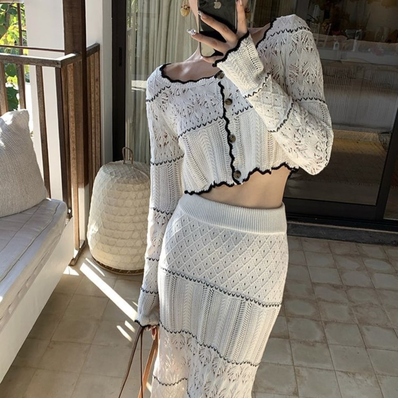 ・透かし編みのデザインが魅力的なニットカーディガン ロングスカート セットアップが新登場!シンプルながらもエレガントな印象を与えるアイテムで、ルーズなシルエットが女性らしさを引き立てます。サイズはSからLまでご用意しており、幅広い体型にフィットするので、さまざまなシーンで活躍間違いなしです。