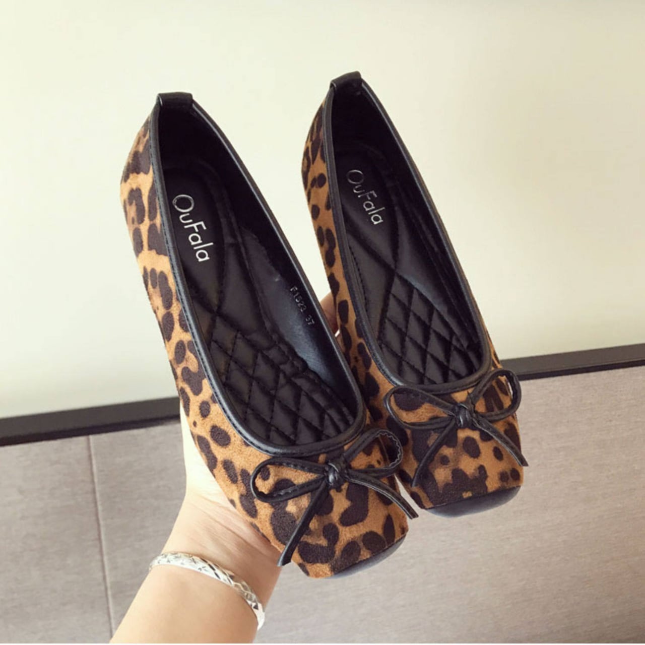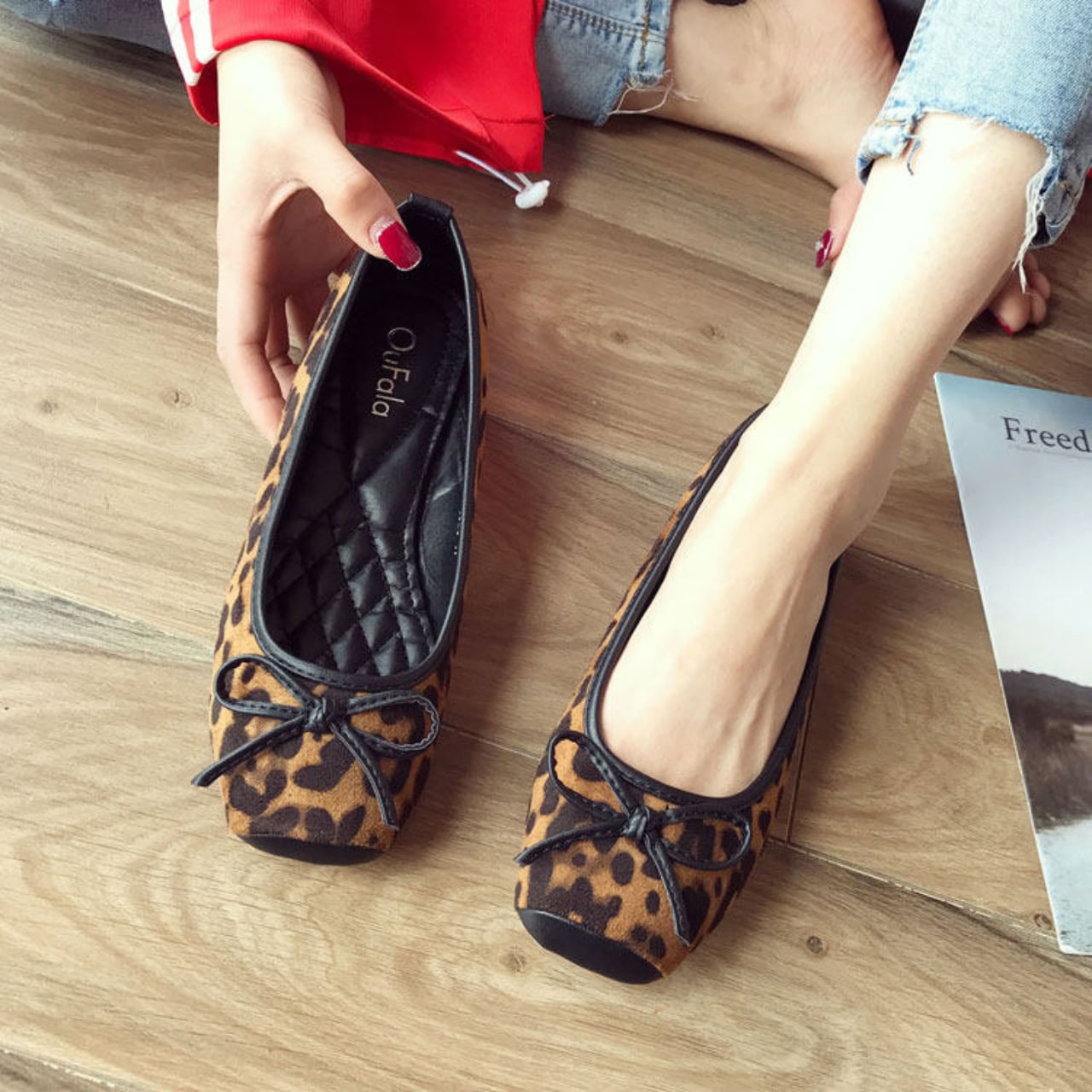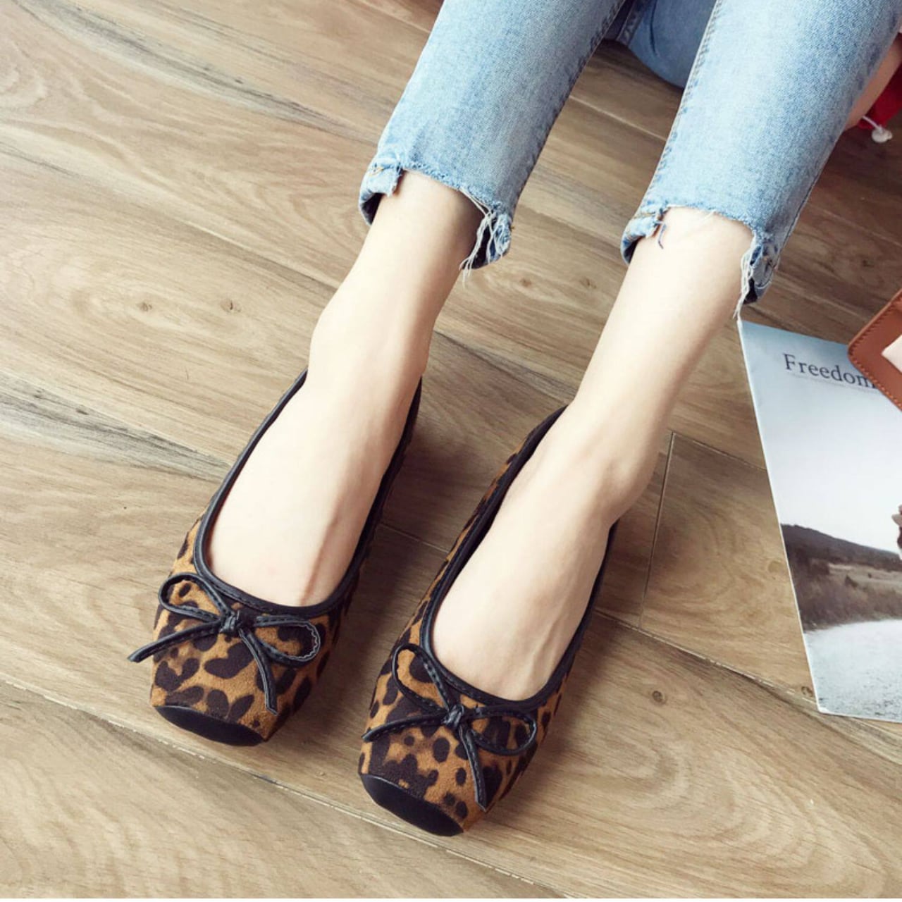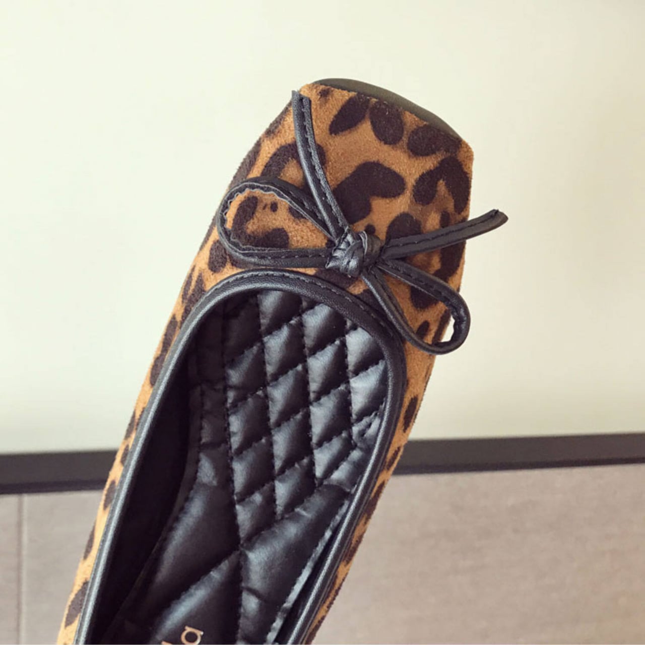 大人っぽく馴染むヒョウ柄をのせたバレエフラット。