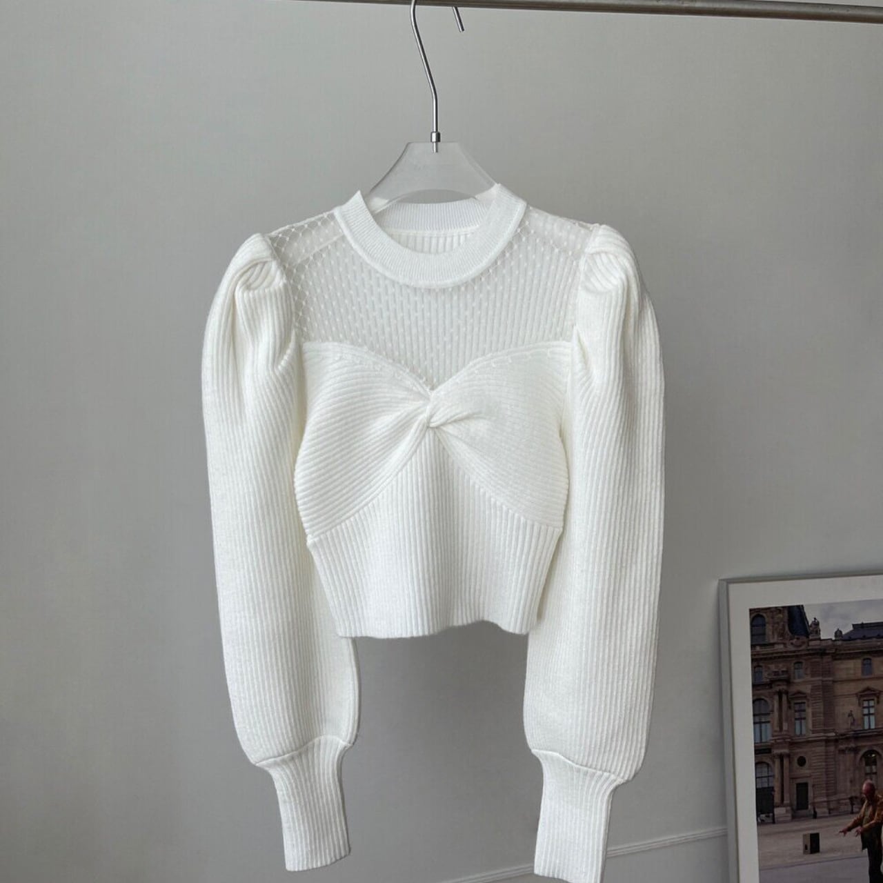 メッシュ切替 リボンビスチェ風 パフスリーブニット a447